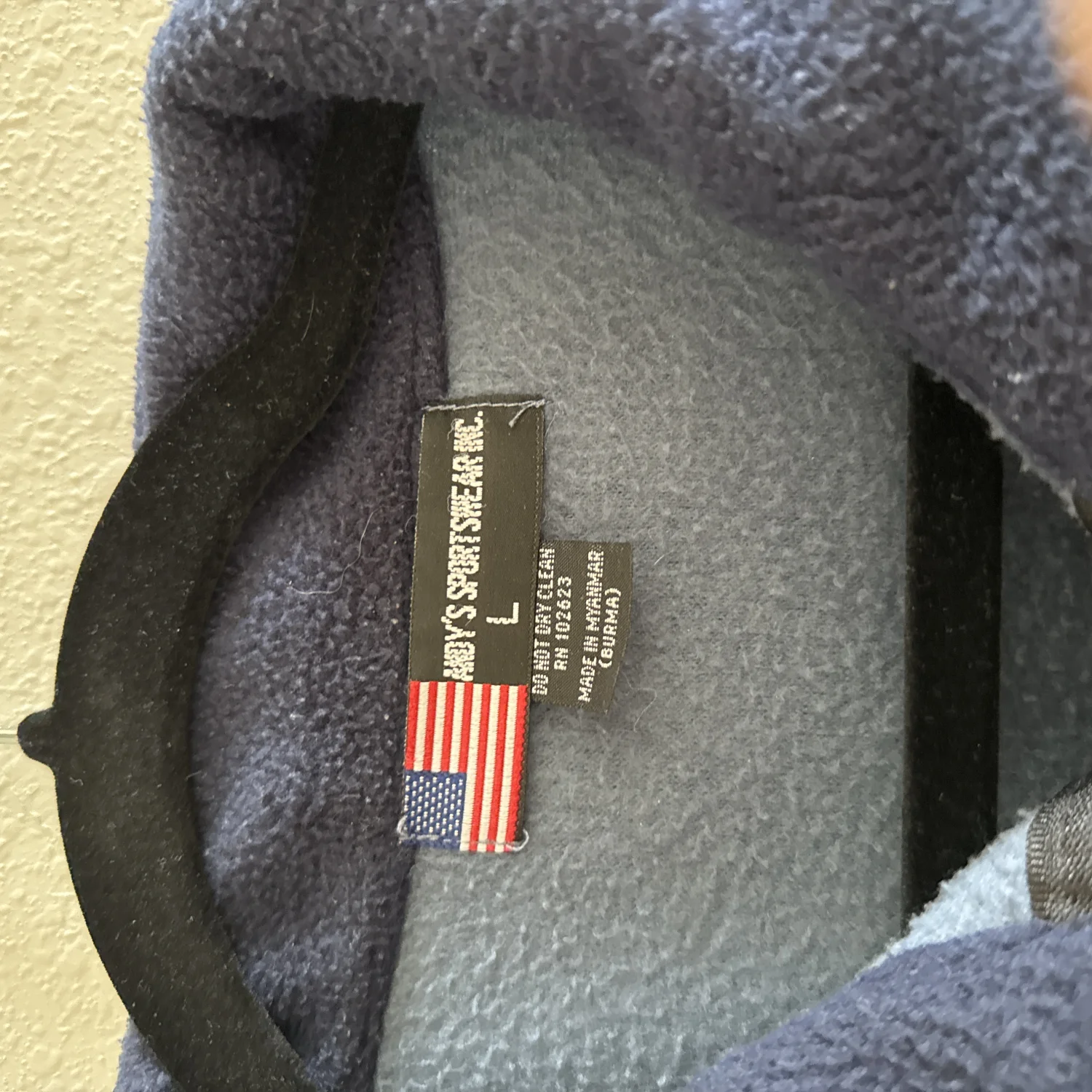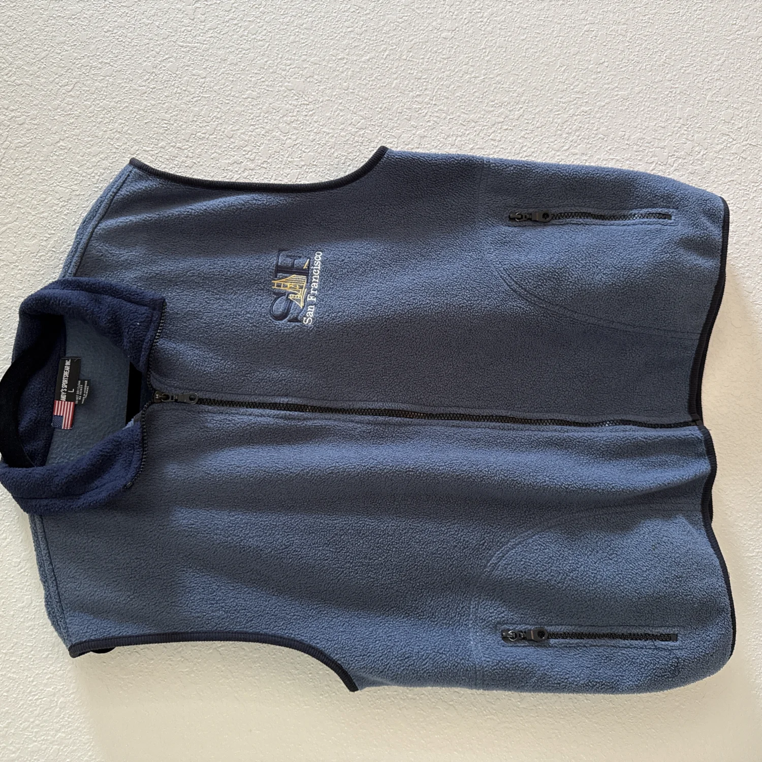 San Francisco full zip fleece vest Size: Large 22 inch wide pit to pit. 27 inches long Nice slate blue color Neutral color could be worn by man or woman. Attractive sturdy heavy steel zipper. Navy blue colored interior collar.