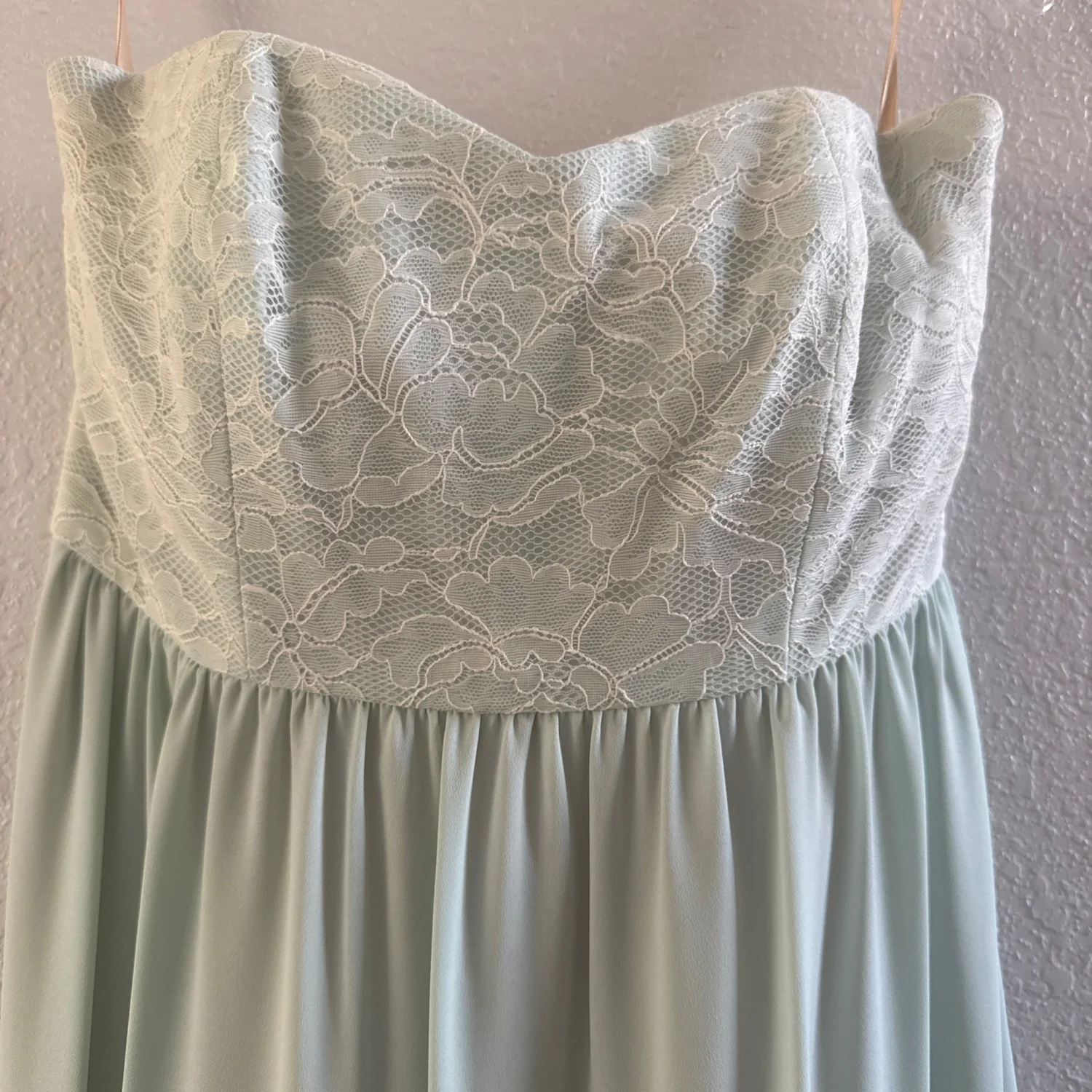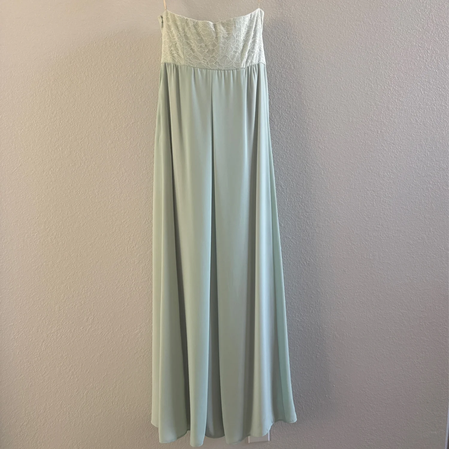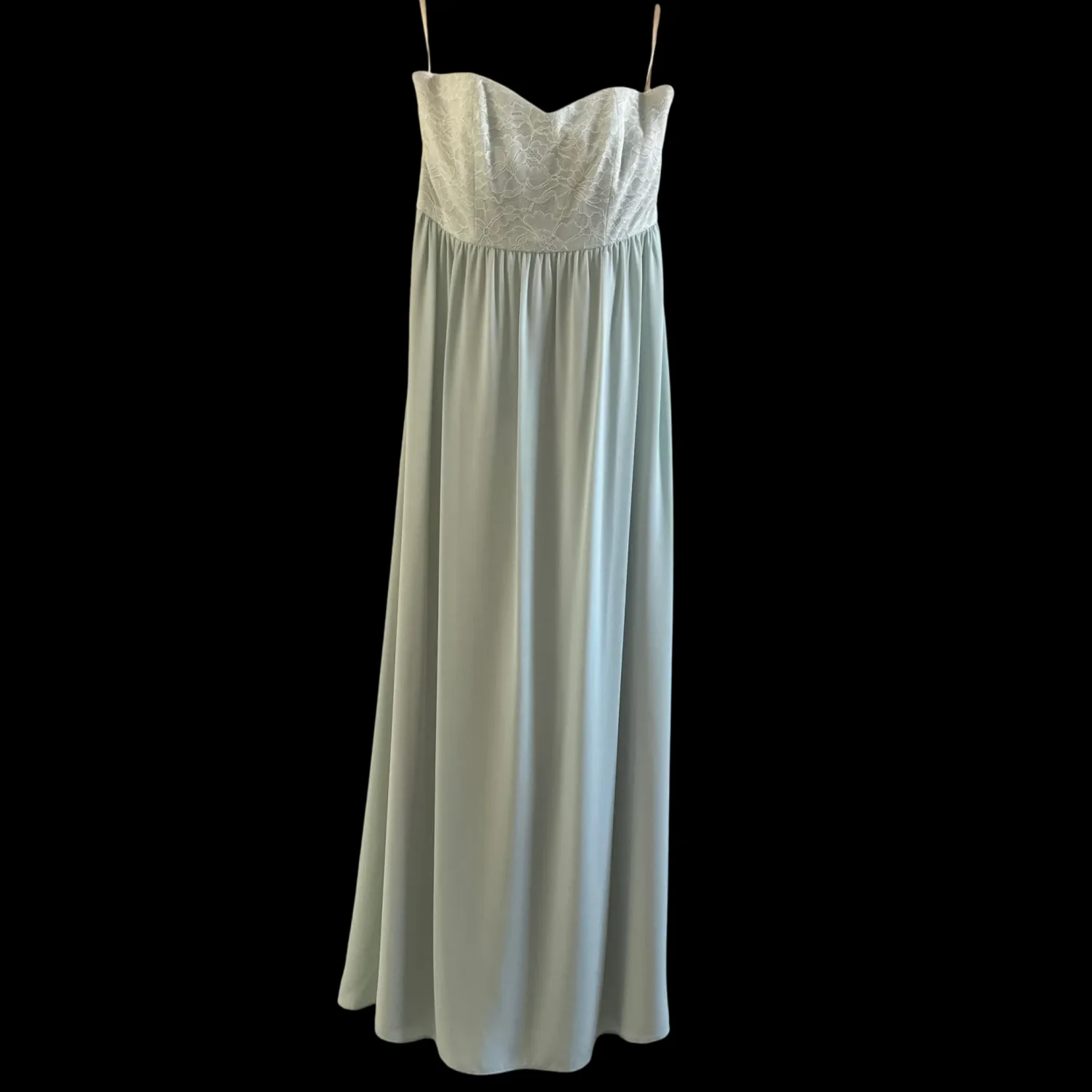 Elegant mint green strapless gown by Paper Crown. This floor-length dress features a delicate lace bodice and a flowing chiffon skirt. Ideal for formal occasions, weddings, or bridesmaid duties. The soft mint color offers a subtle and sophisticated look. Fully lined for comfort. #formaldress #bridalwear #mintgreen