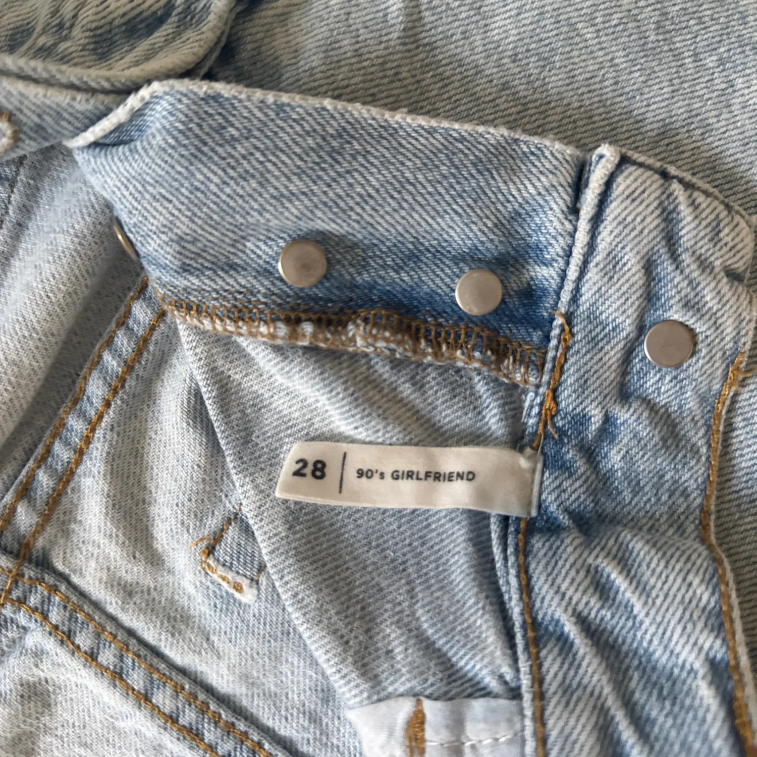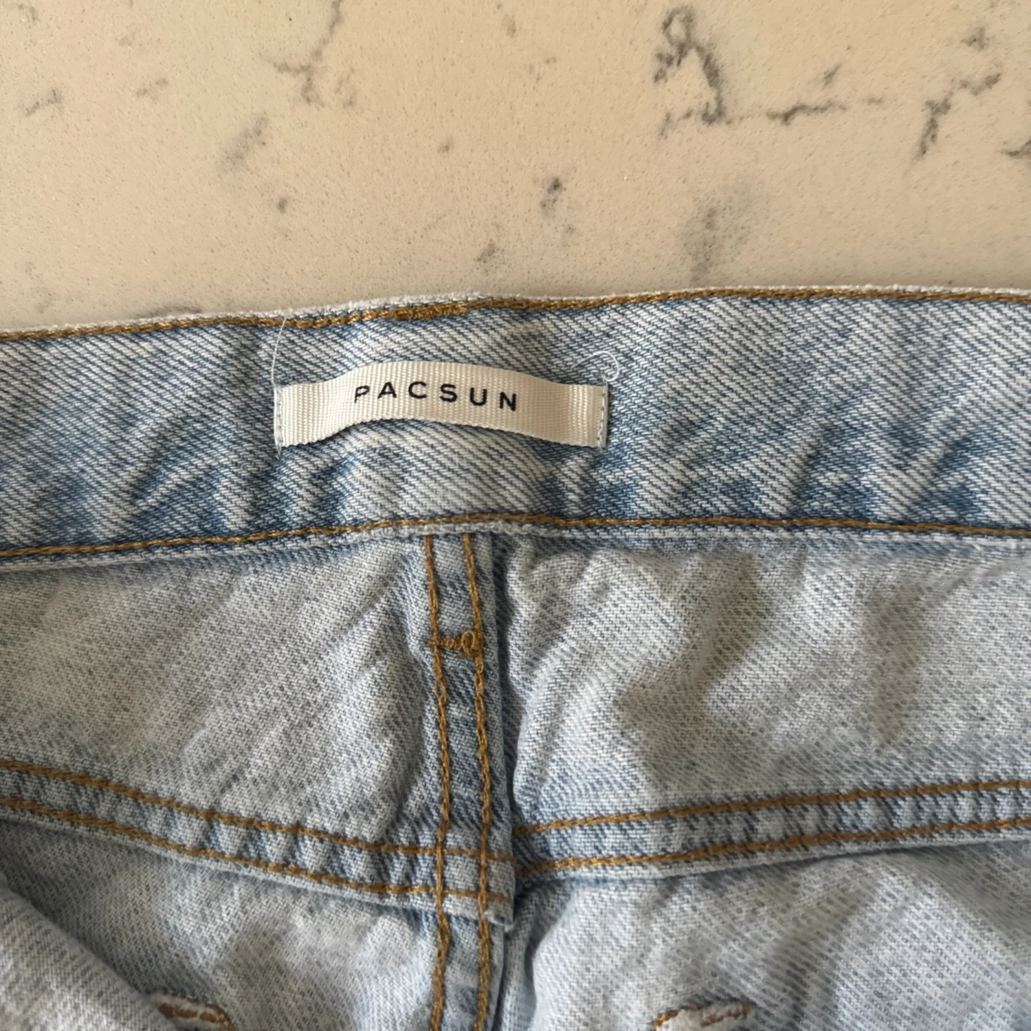 PacSun 90's Girlfriend high-rise denim shorts in a light blue wash. Features a classic button fly closure and frayed hems for a vintage look. Perfect for casual summer outings. Tag size 28. #vintage #summer #highrise