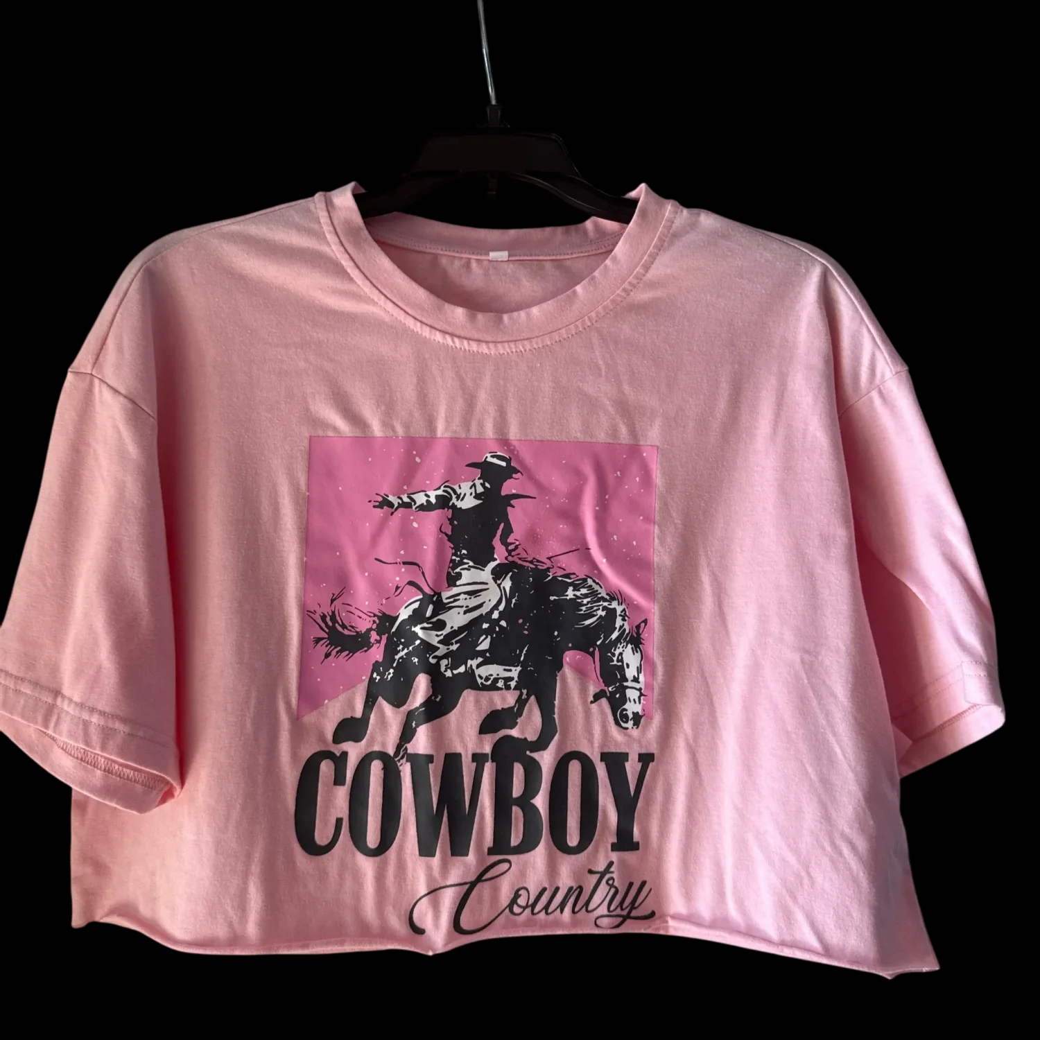 This pink crop top features a bold graphic print of a cowboy and the words 'Cowboy Country.' Made from soft, breathable fabric, it's perfect for casual outings. The top has short sleeves and a round neckline. Ideal for fans of western style.