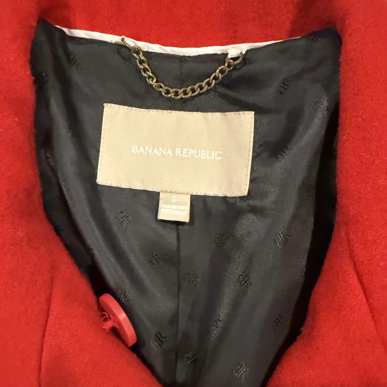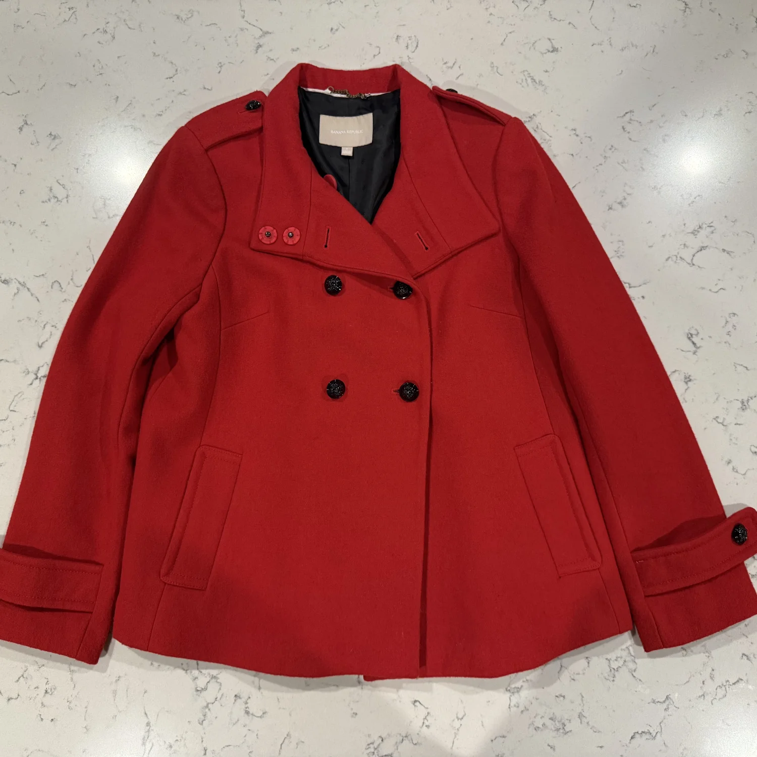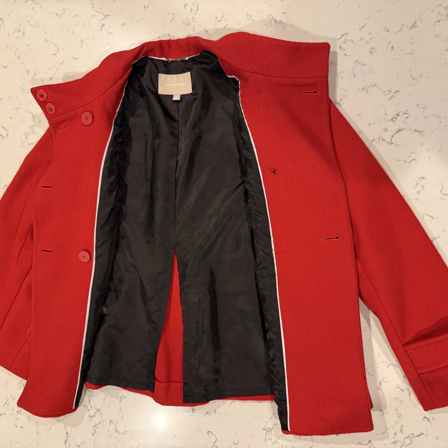 A beautiful red jacket with black linings and buttons. The jacket is in excellent condition.