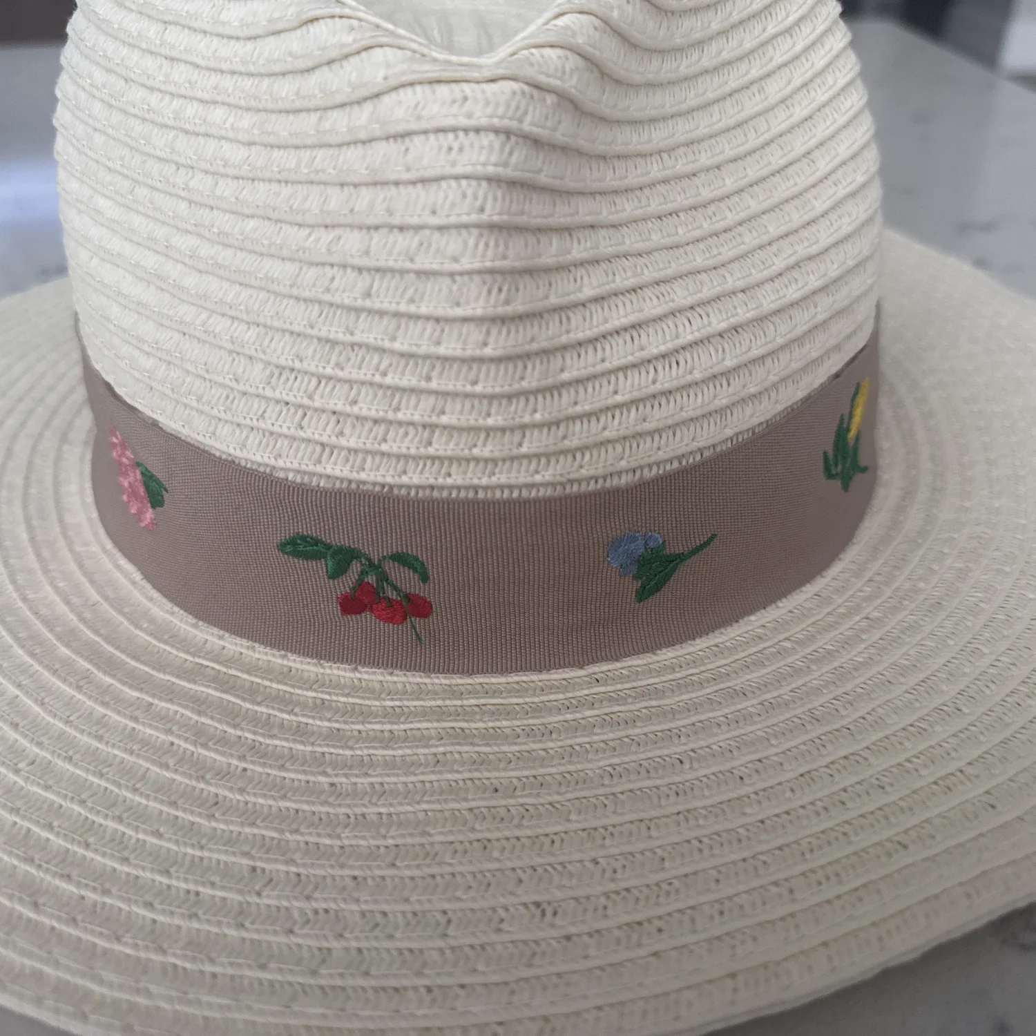 A beige straw sun hat with a brown band and embroidered flowers. The hat is in excellent condition.