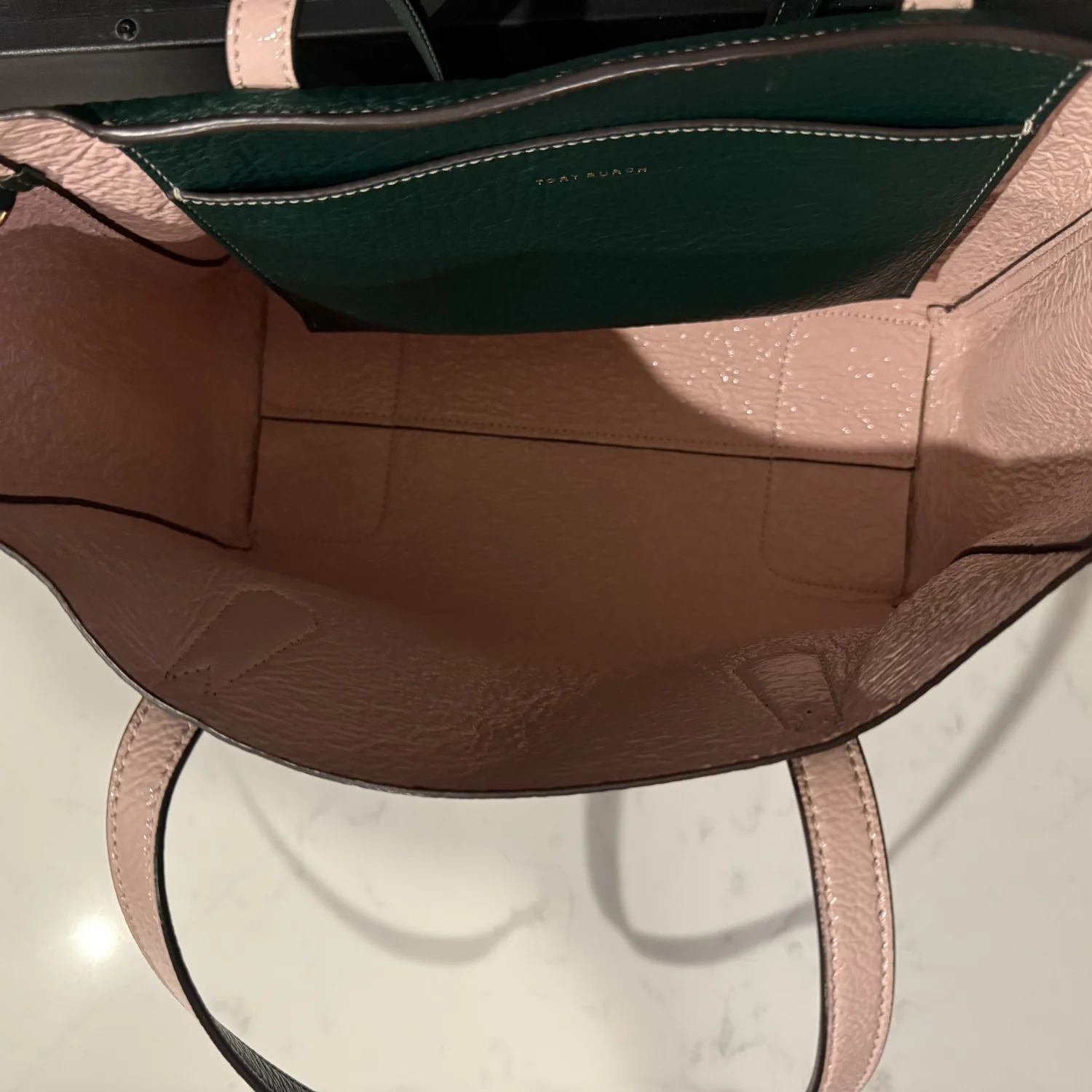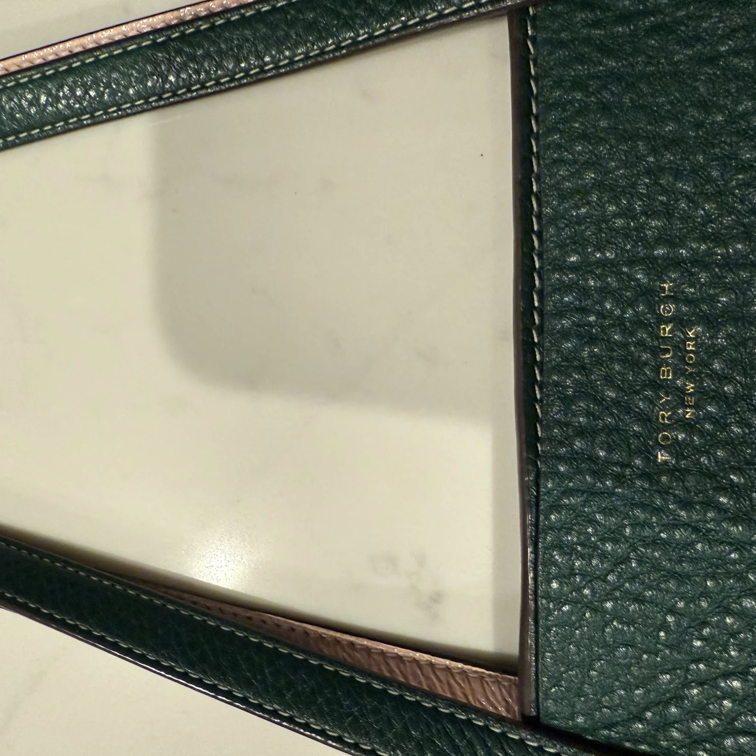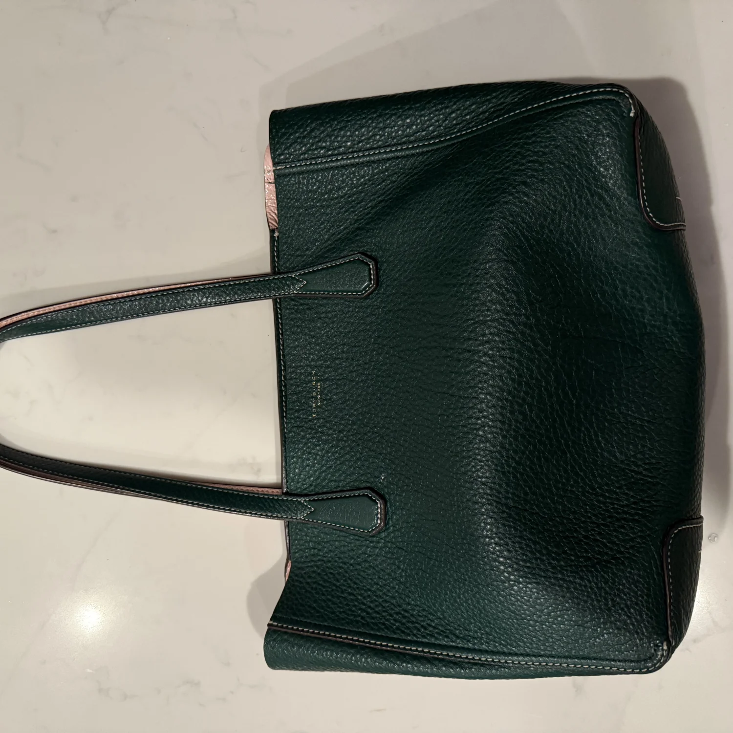 Green textured leather tote bag with two leather handles and gold logo on the front.