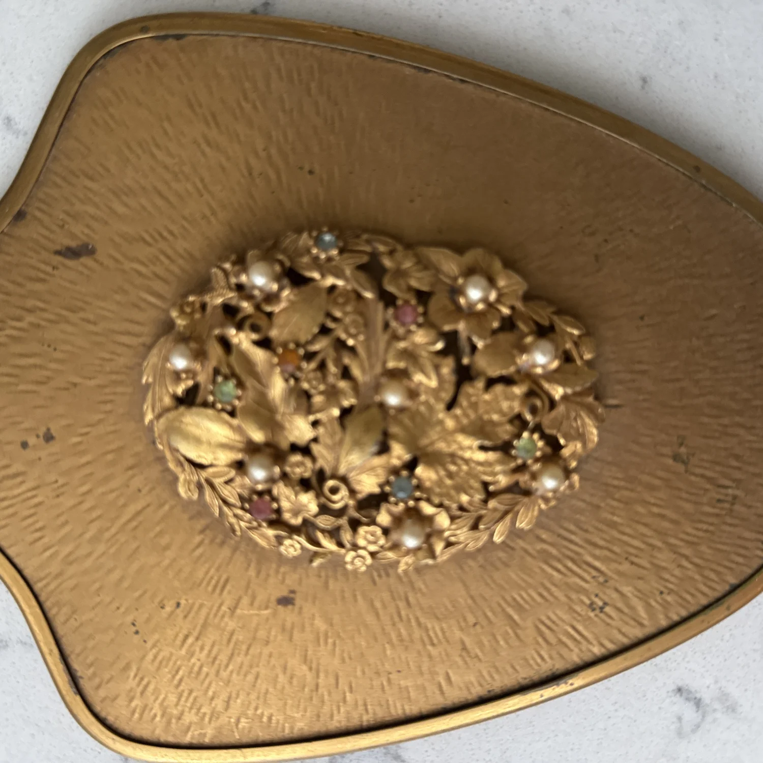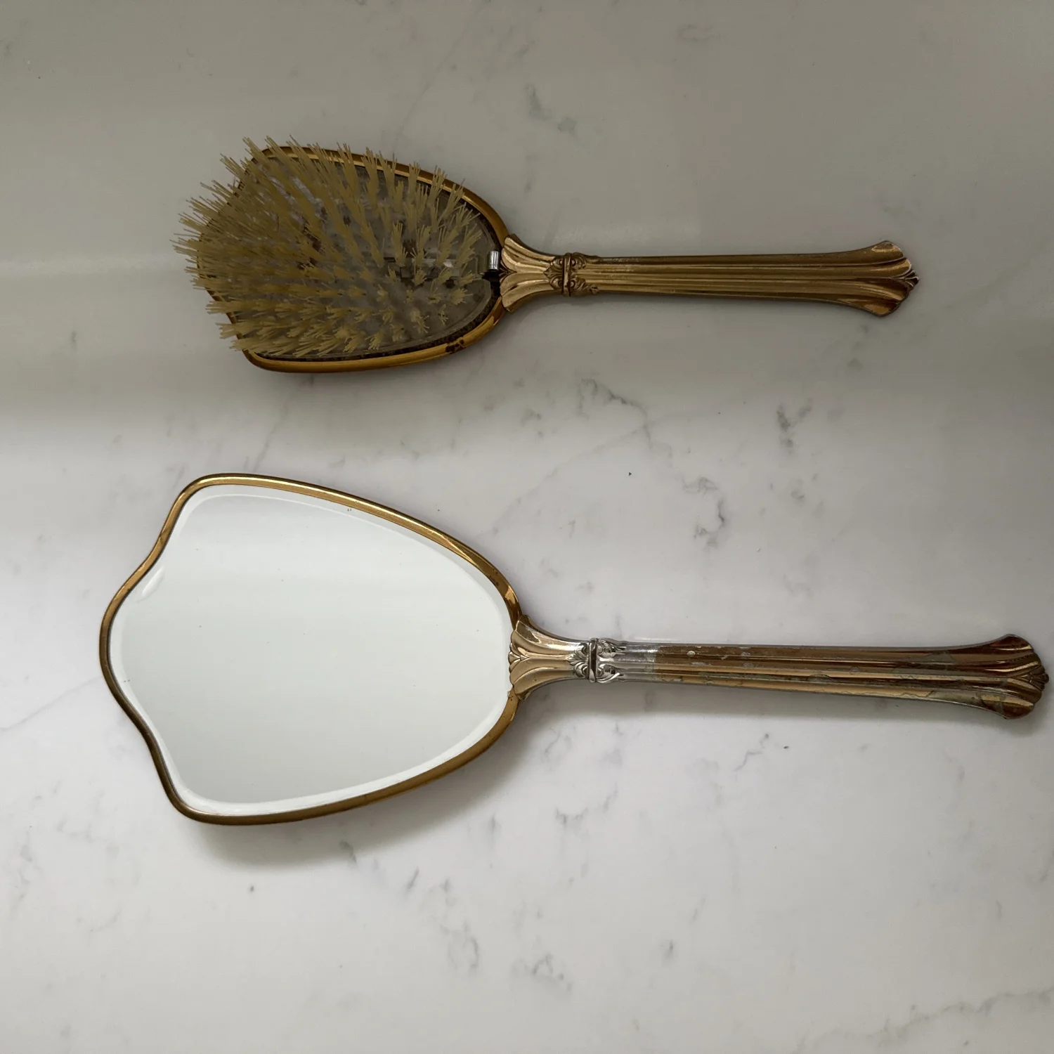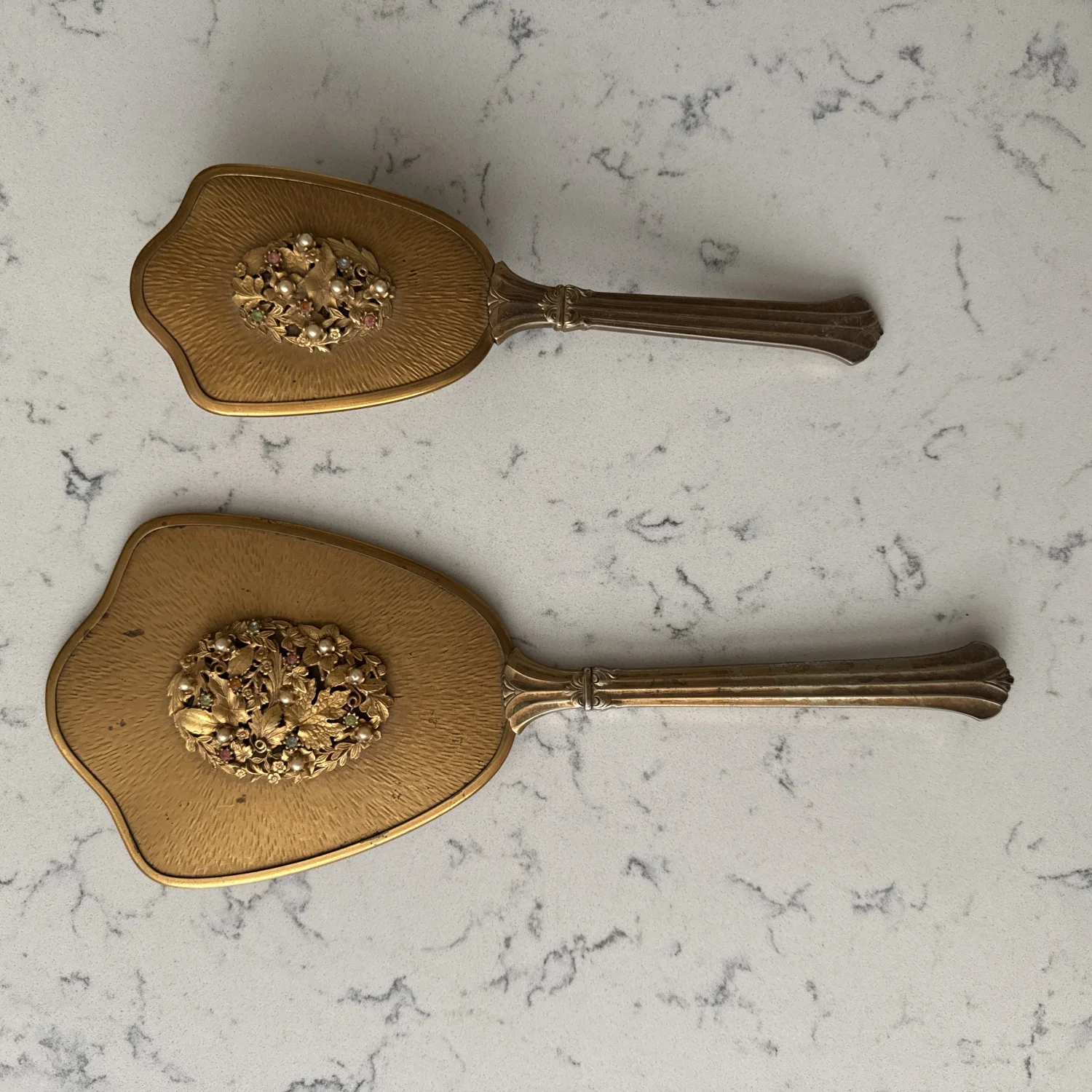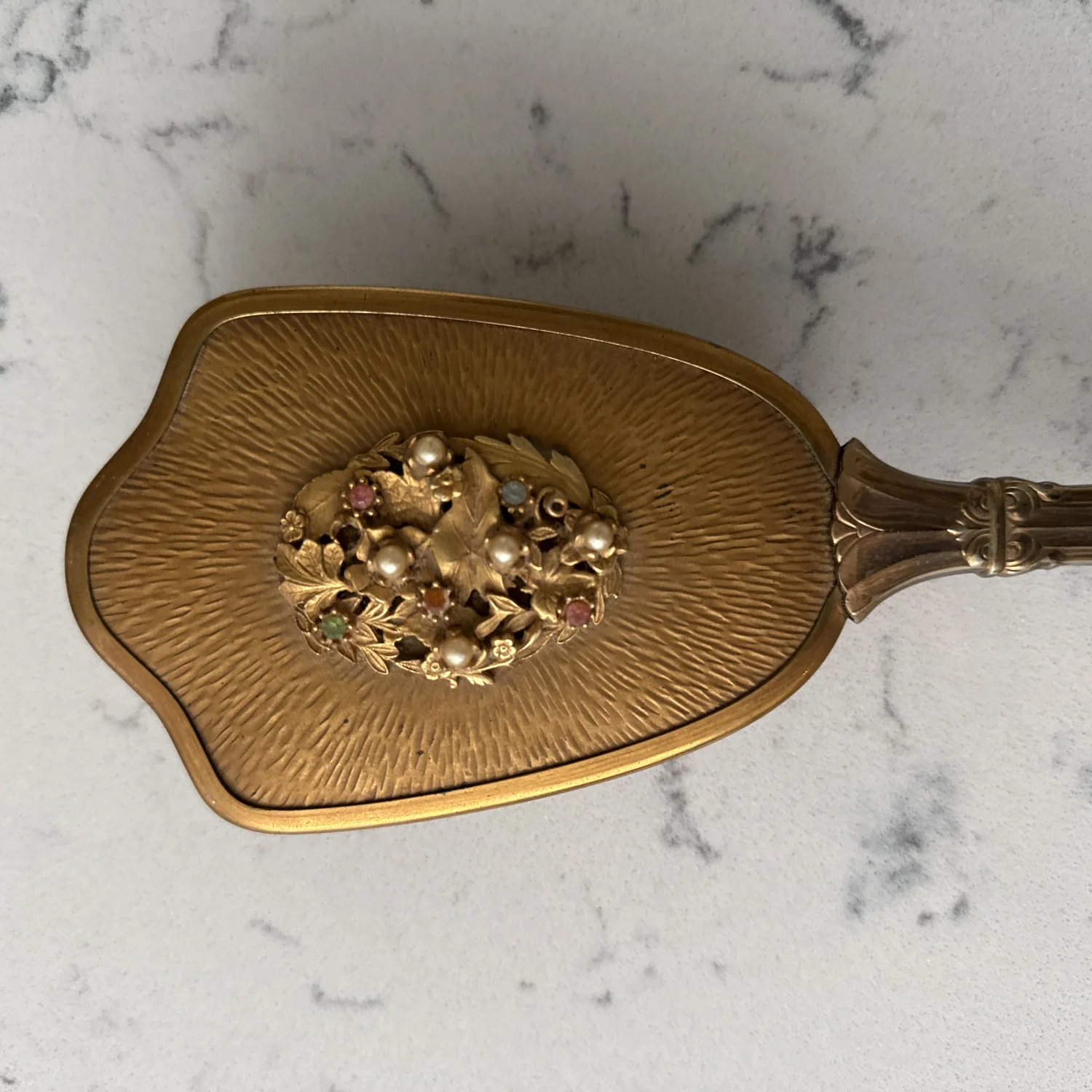 Vintage Ornate DRESSER SET Gold Tone Mirror & Brush With Leaf & Bead Design