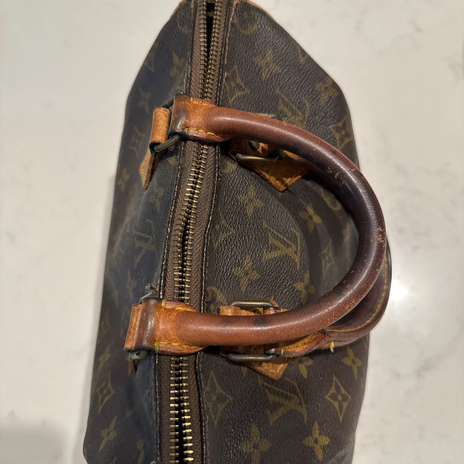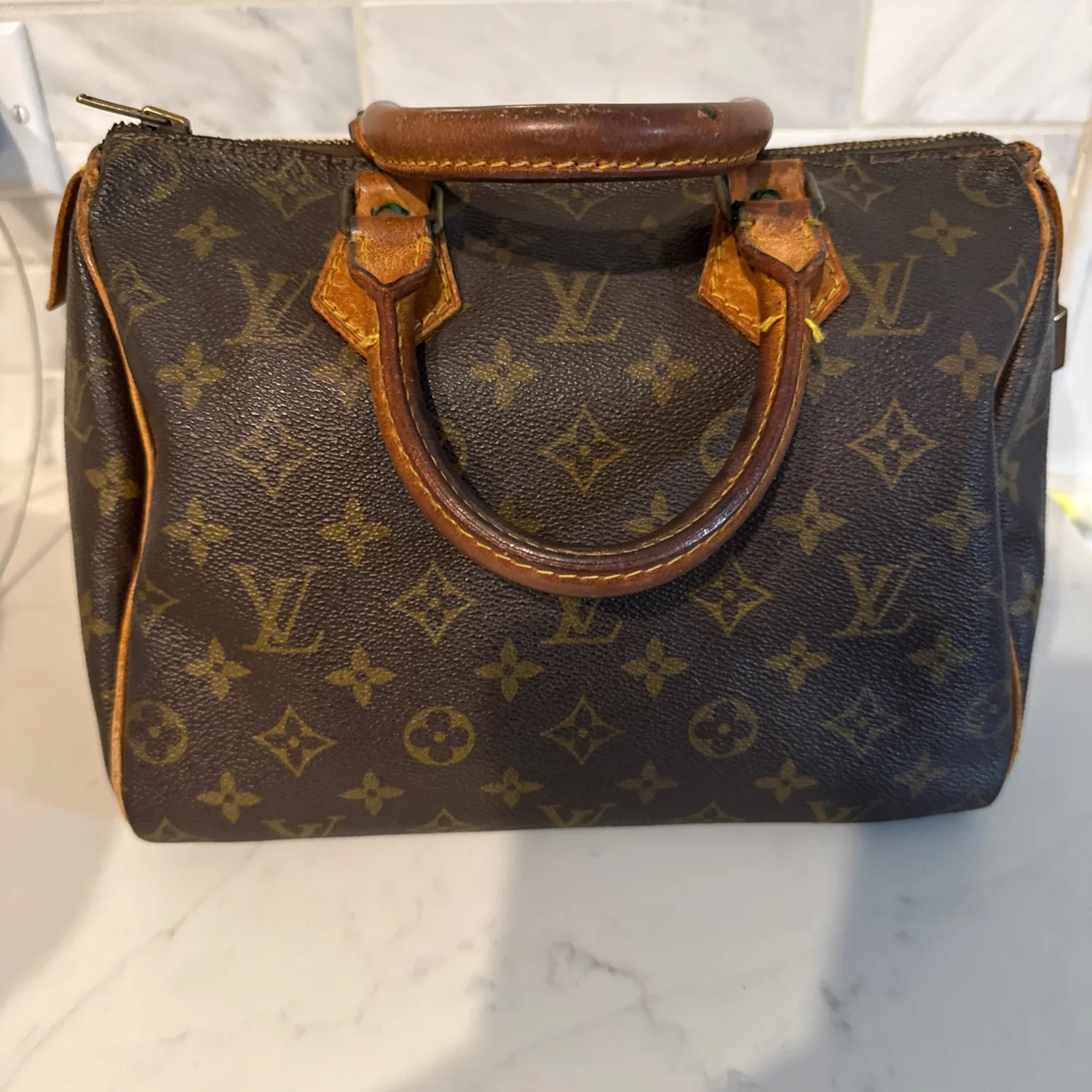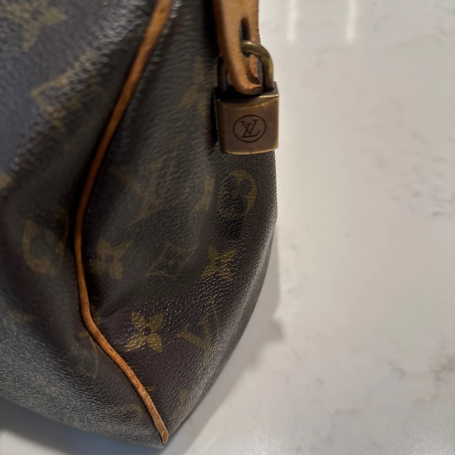 Authentic Louis Vuitton handbag in classic monogram canvas with tan leather accents. Features dual leather handles and a zippered closure. The interior is lined and includes a pocket for additional storage. There is noticeable wear on the leather components, indicating some use. Great for everyday style or as a collector's piece. #LouisVuitton #Monogram #LuxuryBag