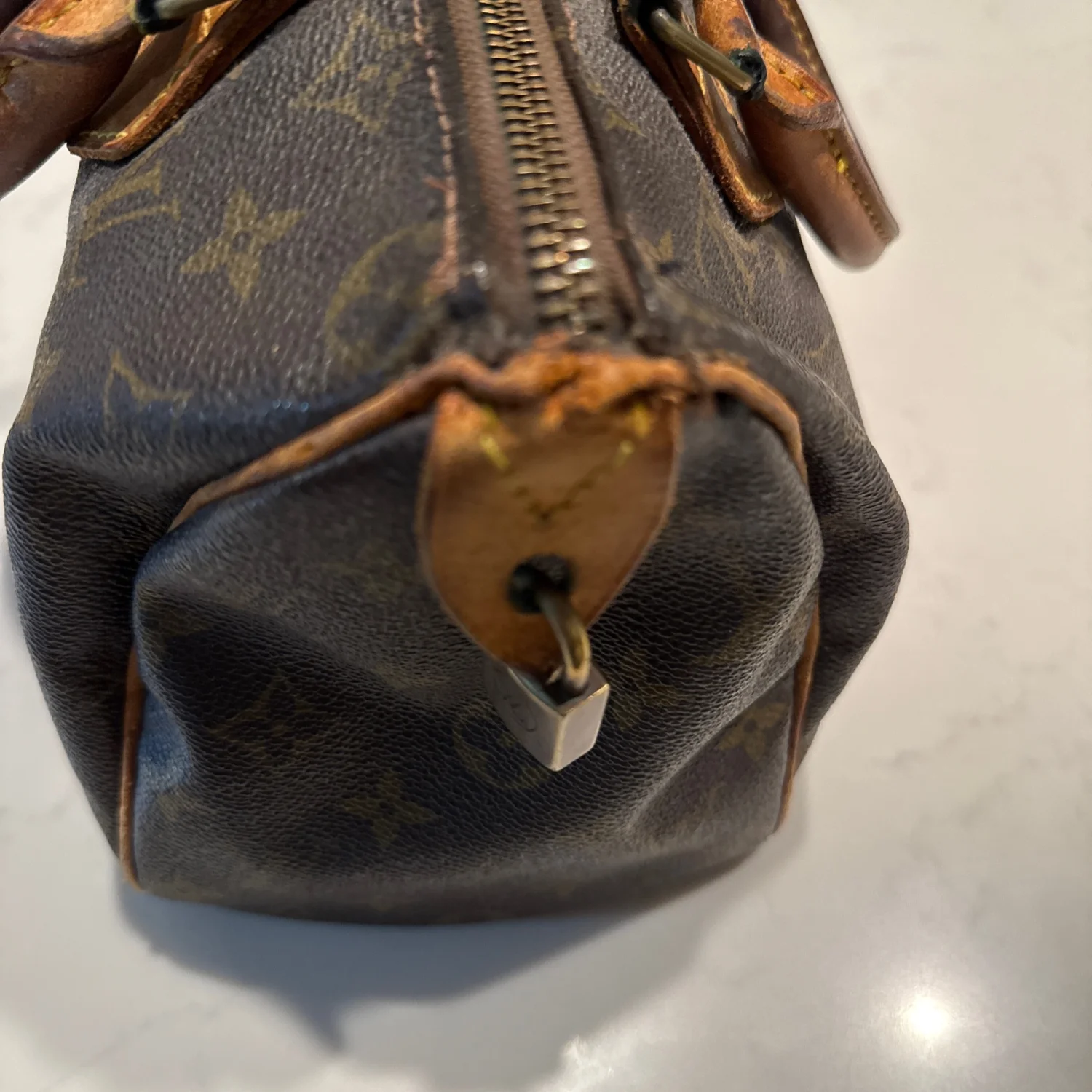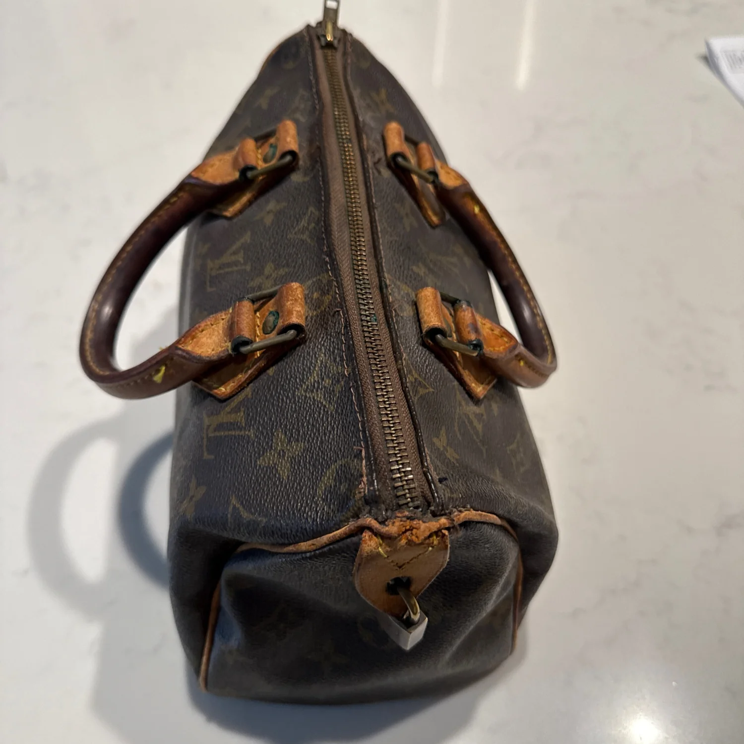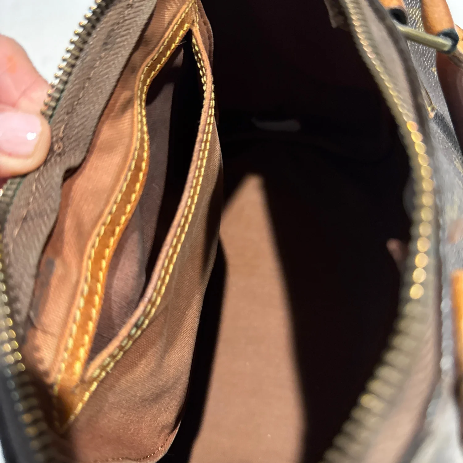 Authentic Louis Vuitton handbag in classic monogram canvas with tan leather accents. Features dual leather handles and a zippered closure. The interior is lined and includes a pocket for additional storage. There is noticeable wear on the leather components, indicating some use. Great for everyday style or as a collector's piece. #LouisVuitton #Monogram #LuxuryBag