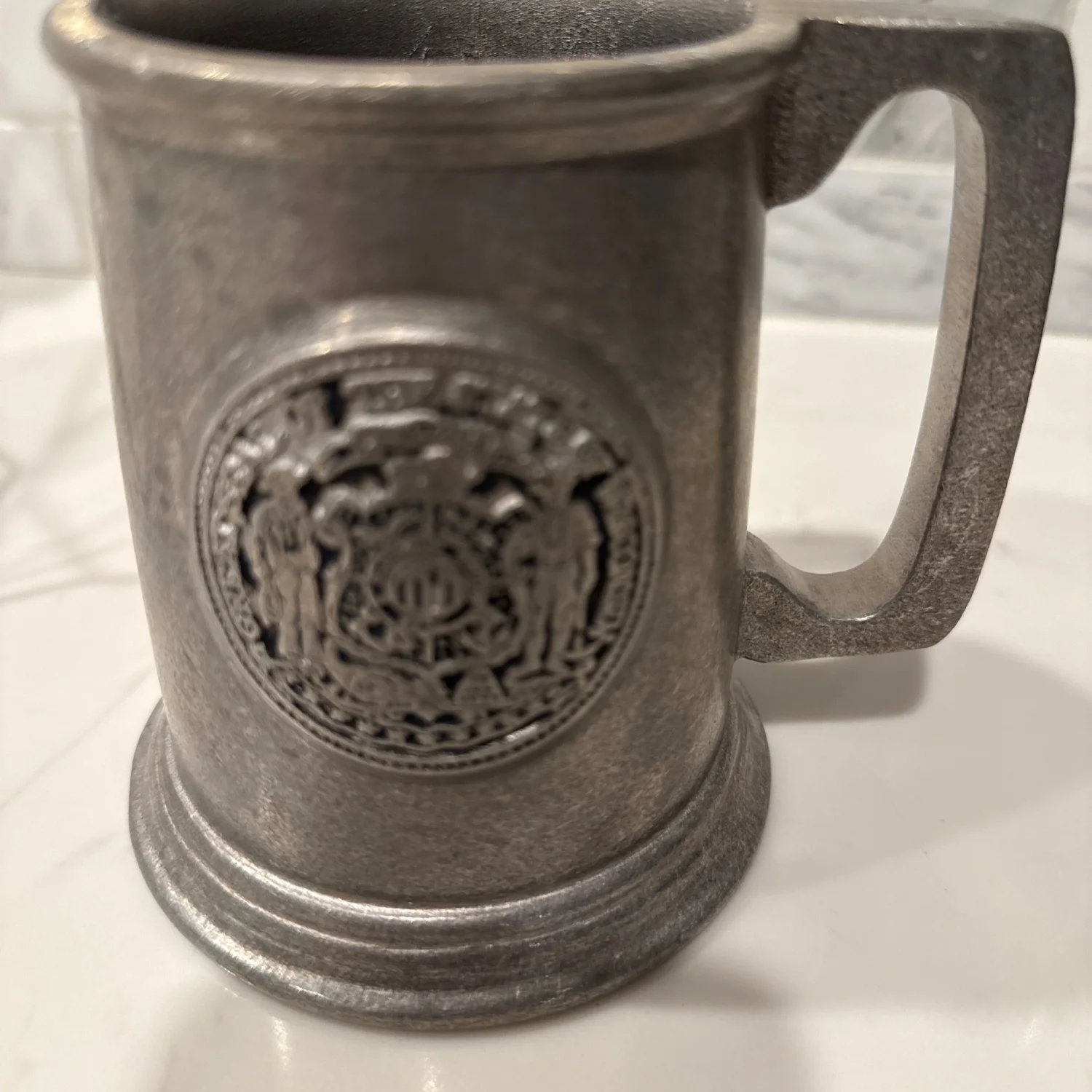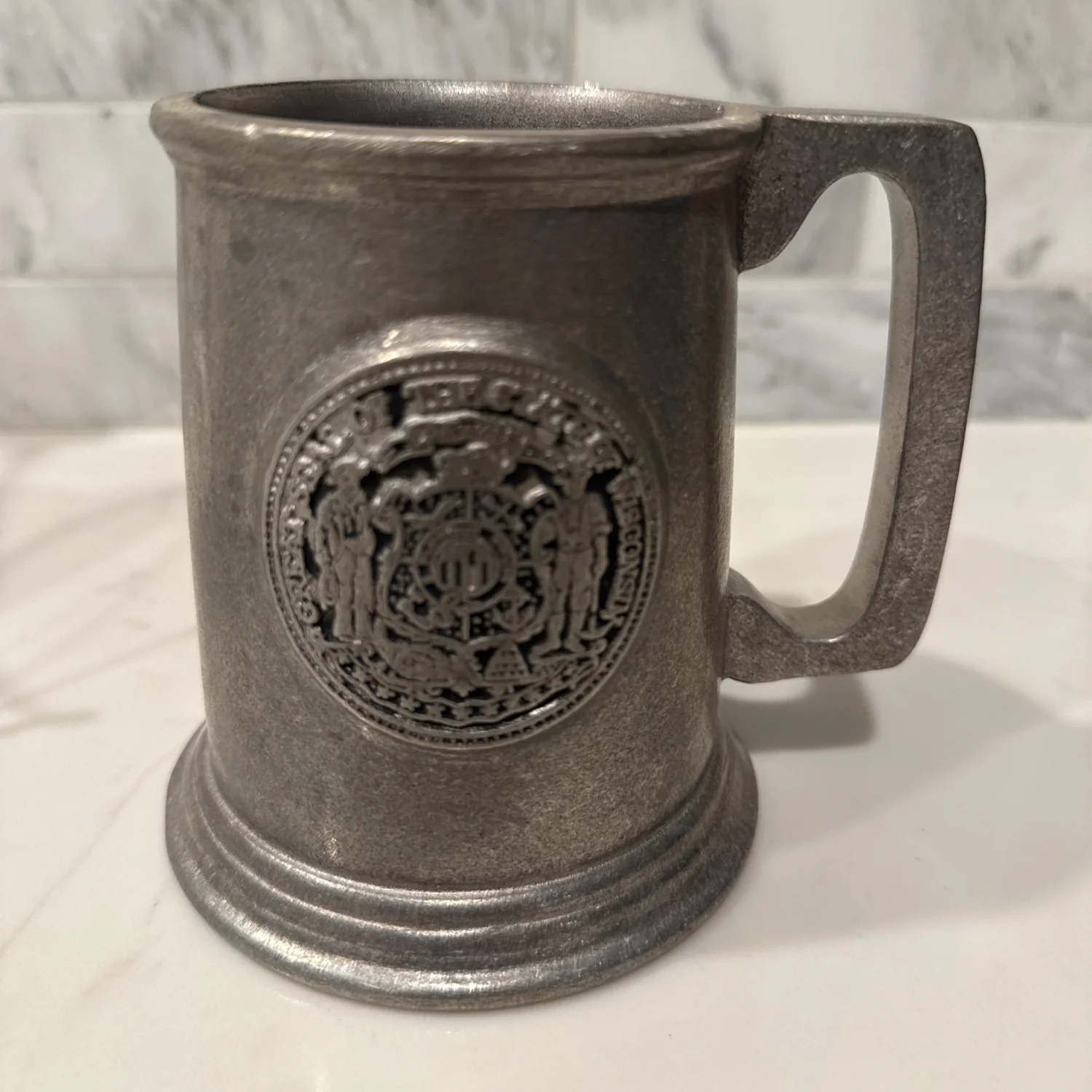 This vintage pewter beer mug features a detailed emblem on the front, giving it a classic and rugged appeal. It’s ideal for collectors or makes a unique gift for someone special. The image shows a sturdy pewter mug or tankard with the Seal of Wisconsin proudly displayed. This vintage mug has a solid handle and a durable build. #vintage #pewtermug #collectible”