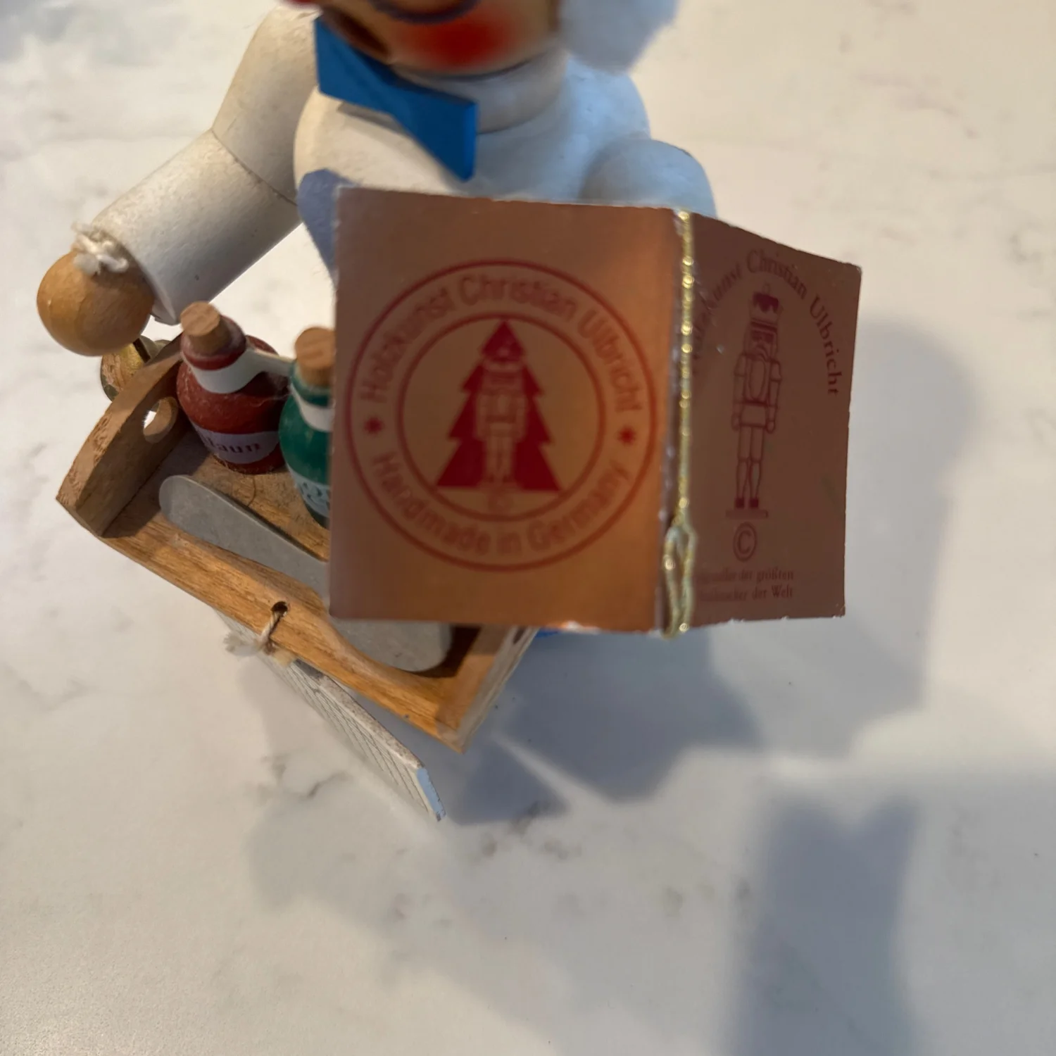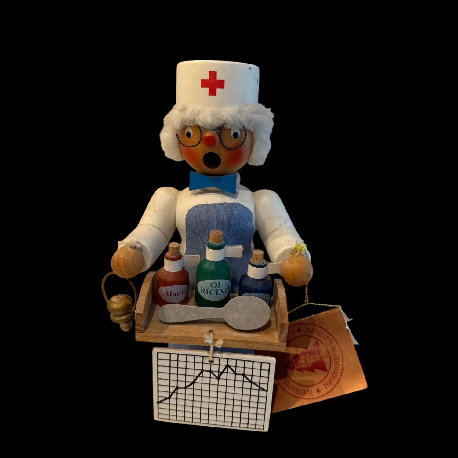 Handcrafted German wooden nurse figurine designed to be a smoker. This charming piece features a nurse holding miniature medicine bottles and wearing a white nurse cap with a red cross. It showcases intricate details and vibrant colors. Perfect for collectors of vintage or unique handmade items. #vintage #handmade #GermanCraft