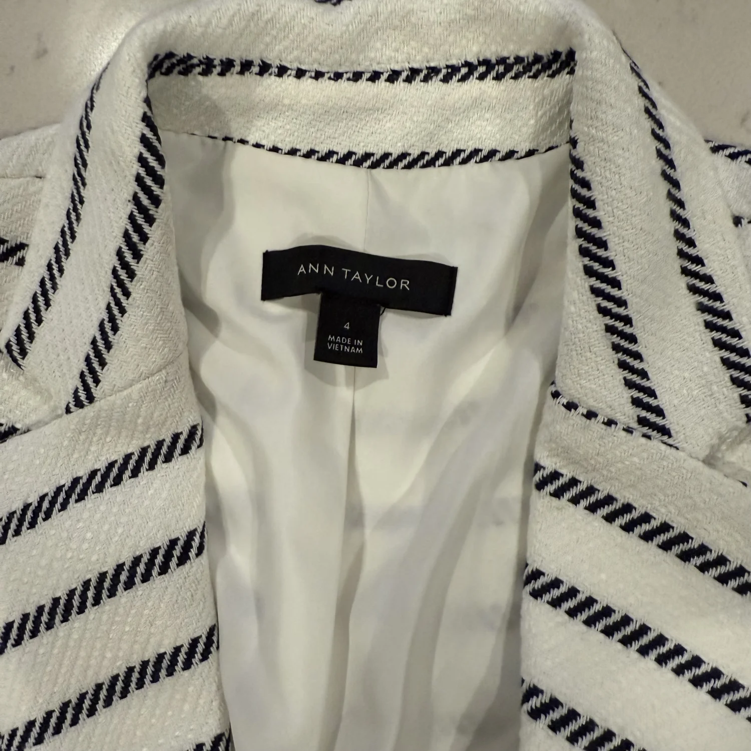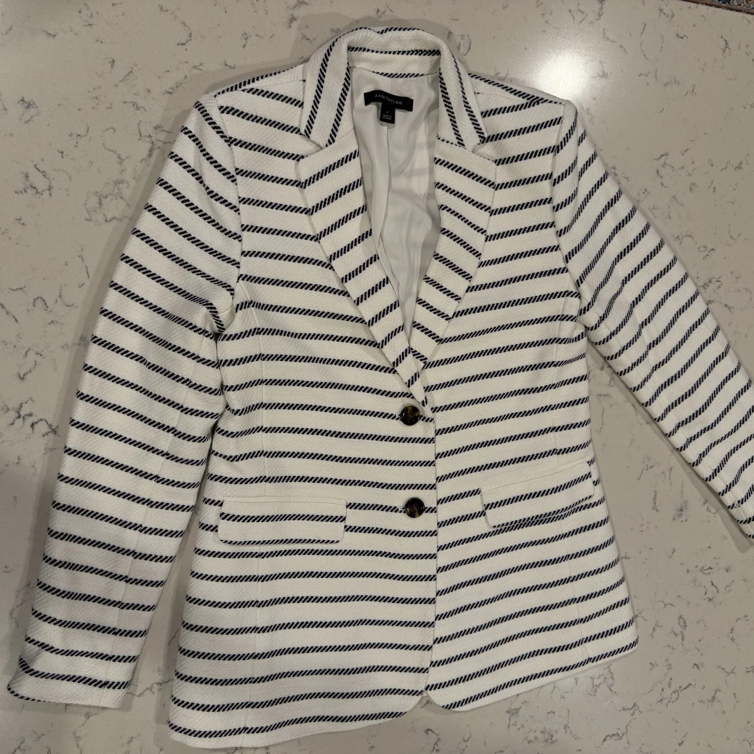 A beautiful white and black striped blazer with black buttons and a black inner shirt. Perfect for spring and summer.