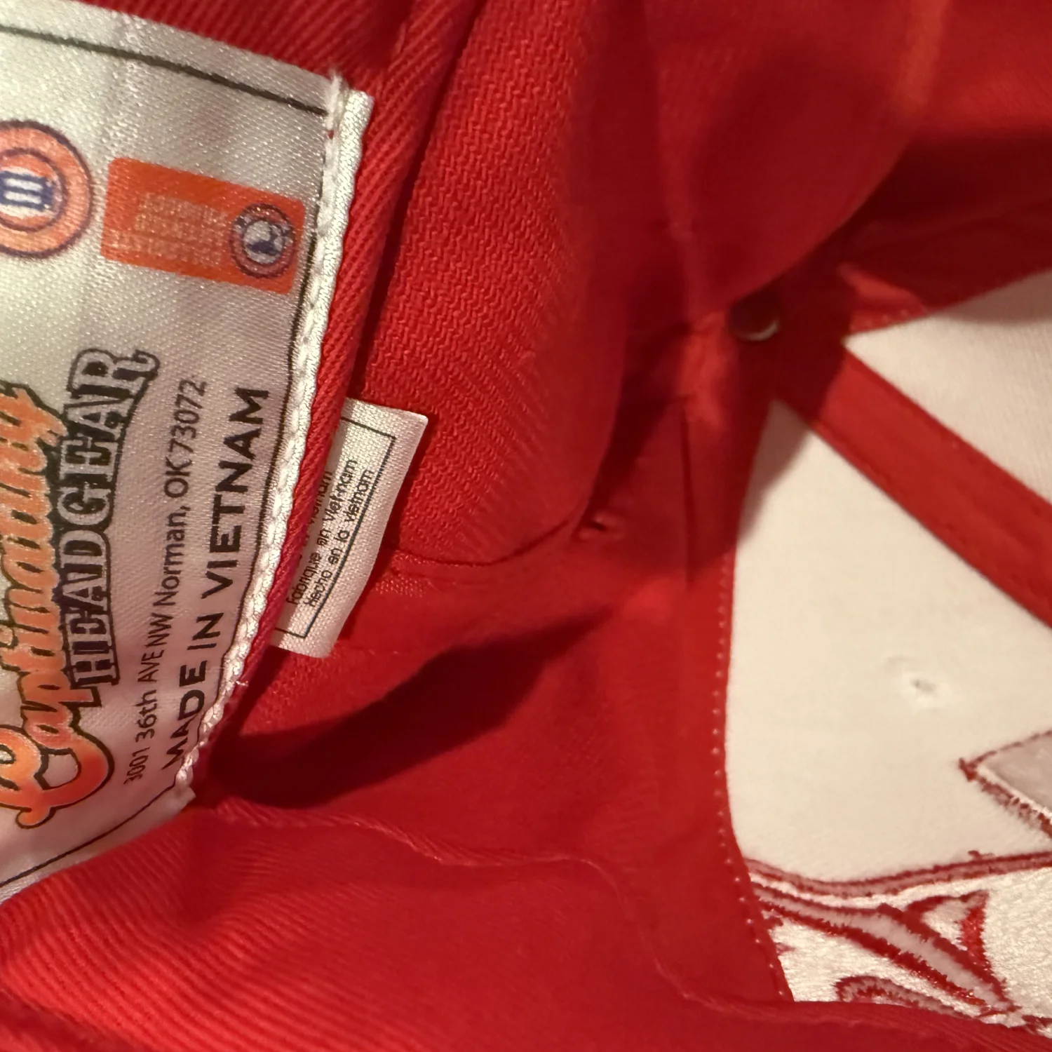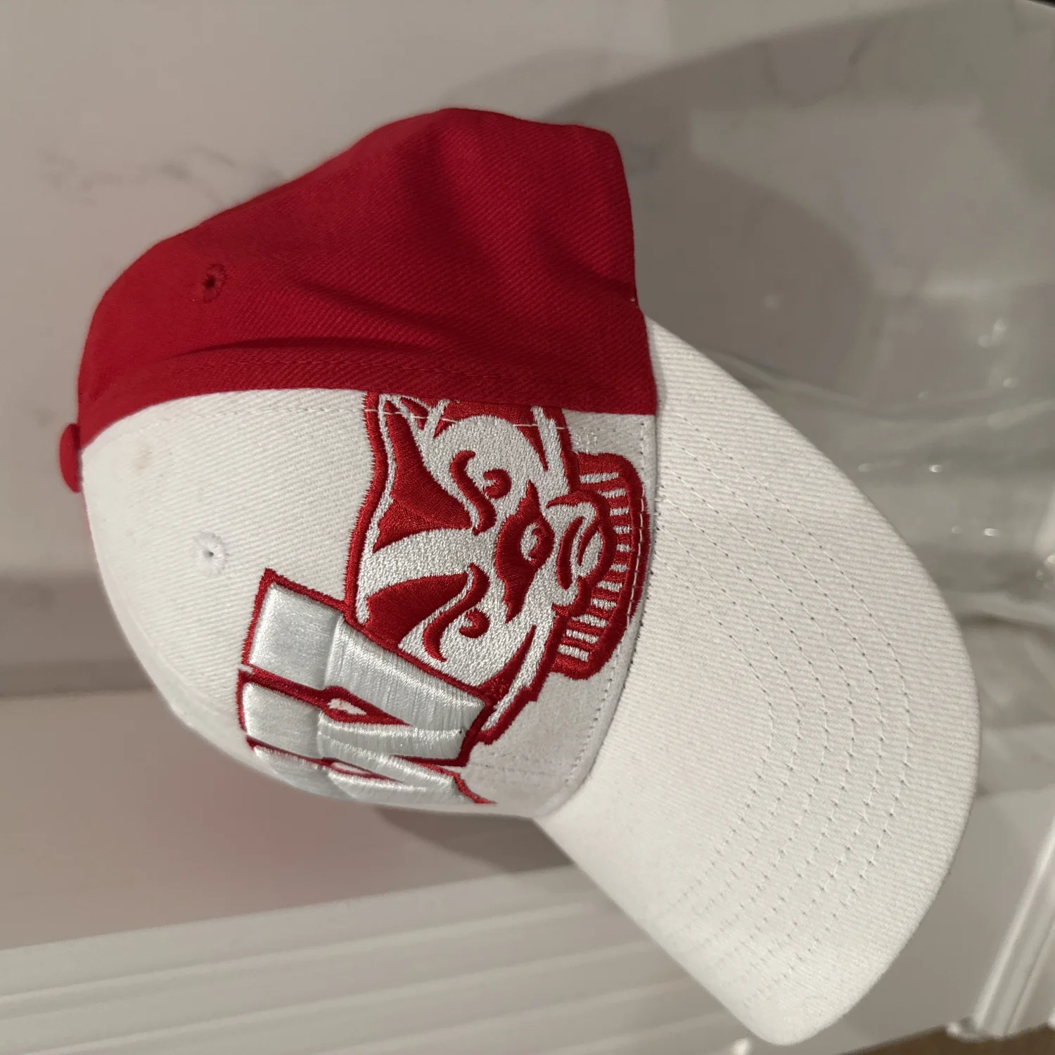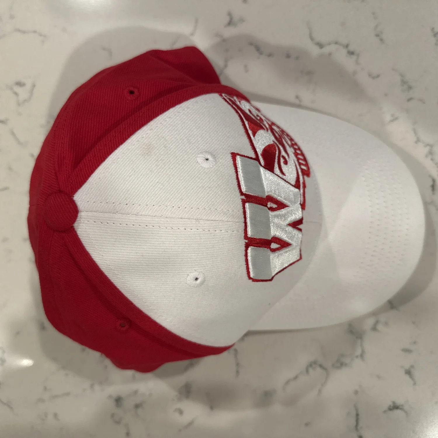 Red and white baseball cap with embroidered Wisconsin logo. The cap is made of cotton and features a structured crown and a curved brim.