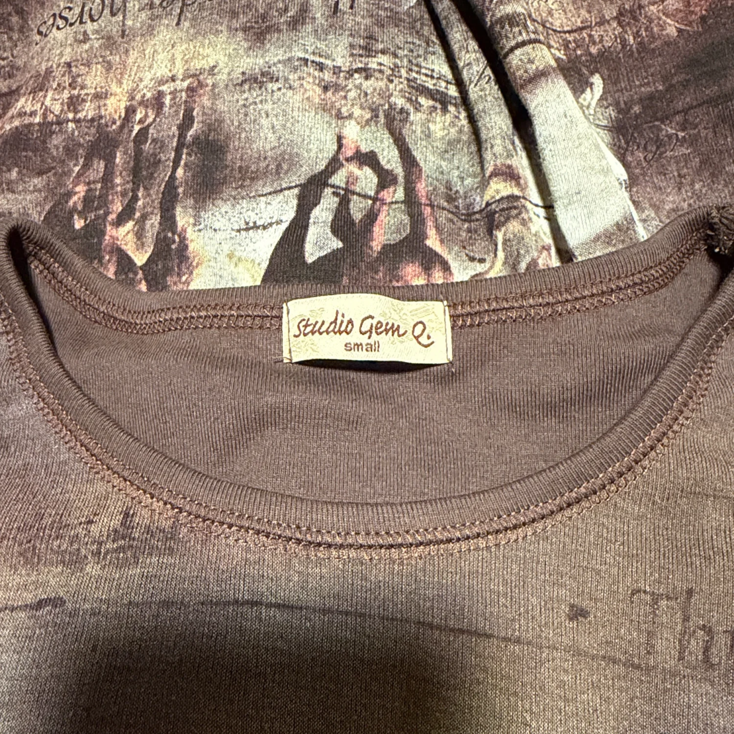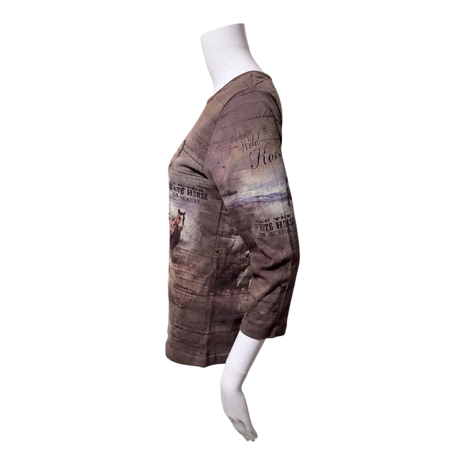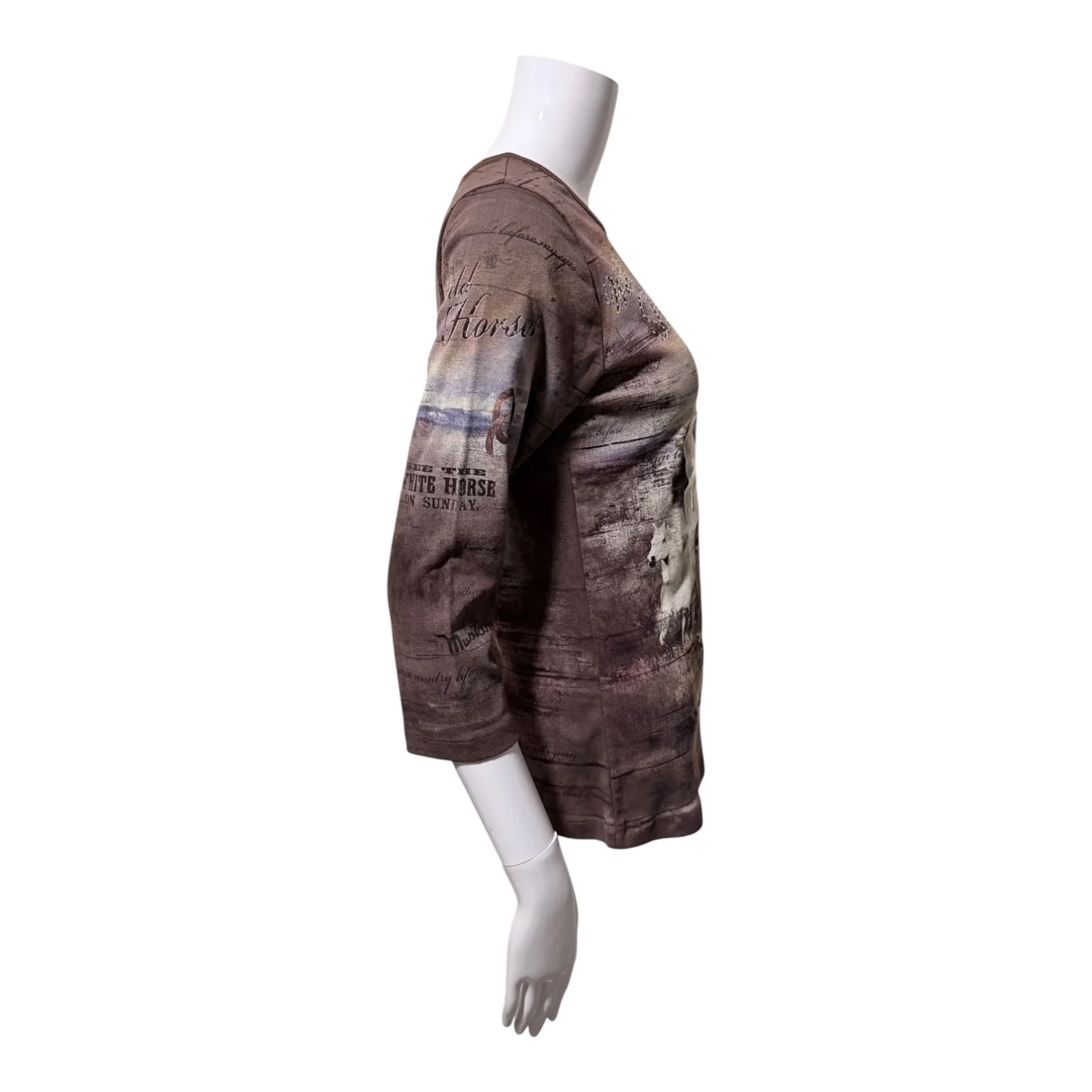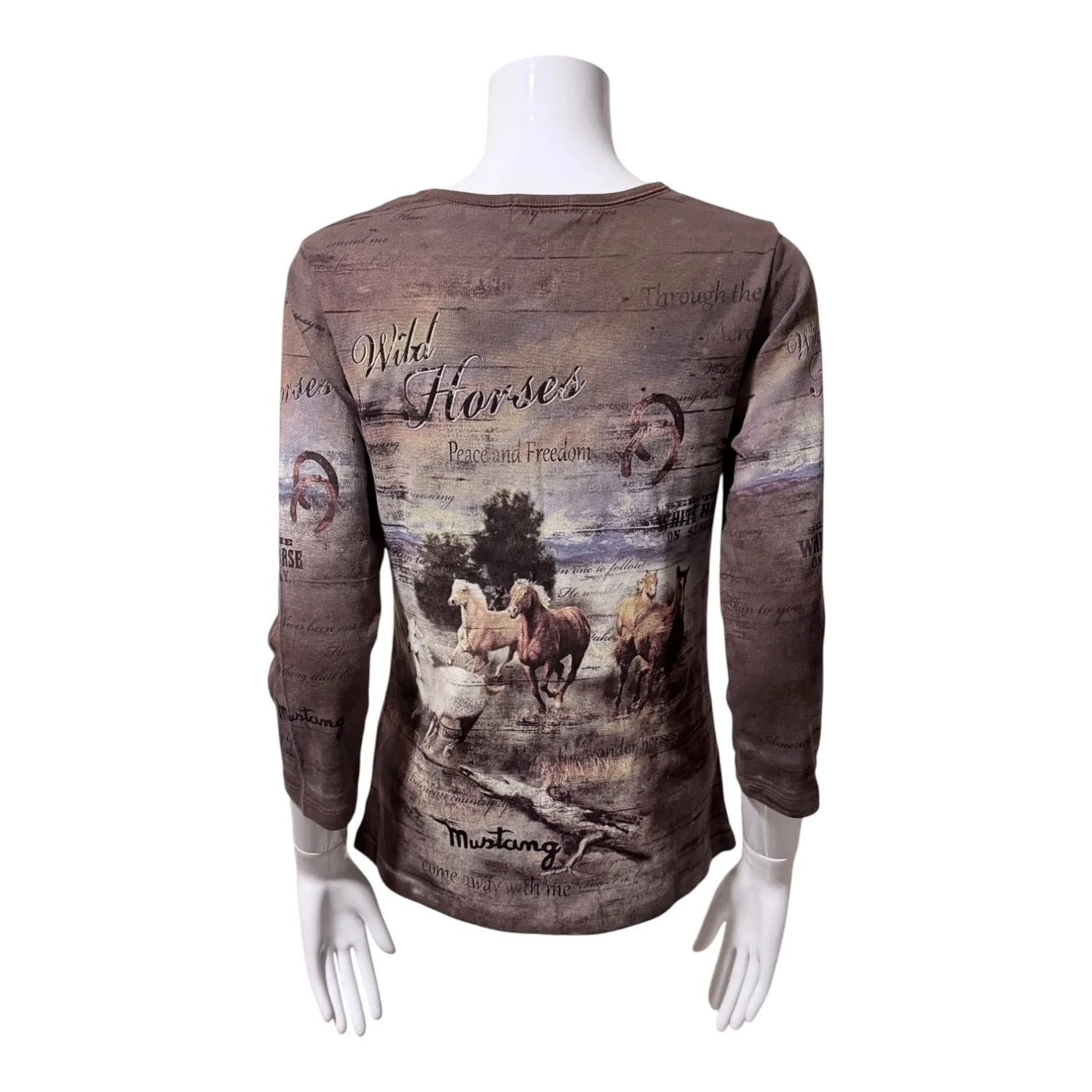 Horse girls, country girls, and cowgirls unite! This Y2K throwback is perfect for line dancing, the racetrack, or the stable. Features: Bedazzled “Wild Horses” text and horseshoes on upper chest Graphic print of horses and text throughout 3/4 sleeves Crew neckline Unlined 100% cotton Size: Small—styled on a US Size 2 dress form Condition: New Without Tag—size sticker still attached.
