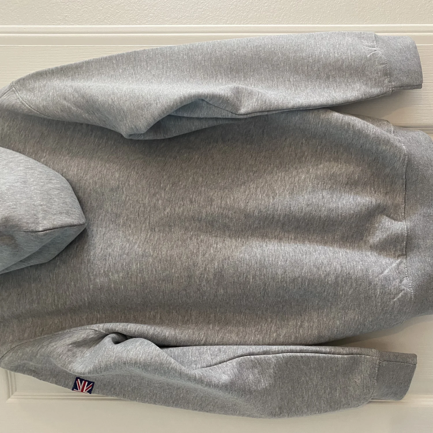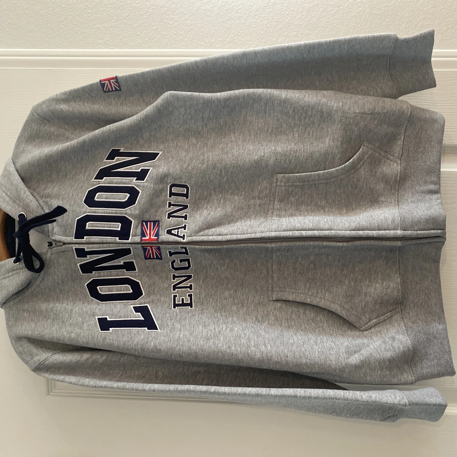 A gray sweatshirt with 'London England' printed on the front. The sweatshirt features a hood and two front pockets. The fabric appears to be soft and comfortable, suitable for casual wear. There are no visible signs of damage or wear.
