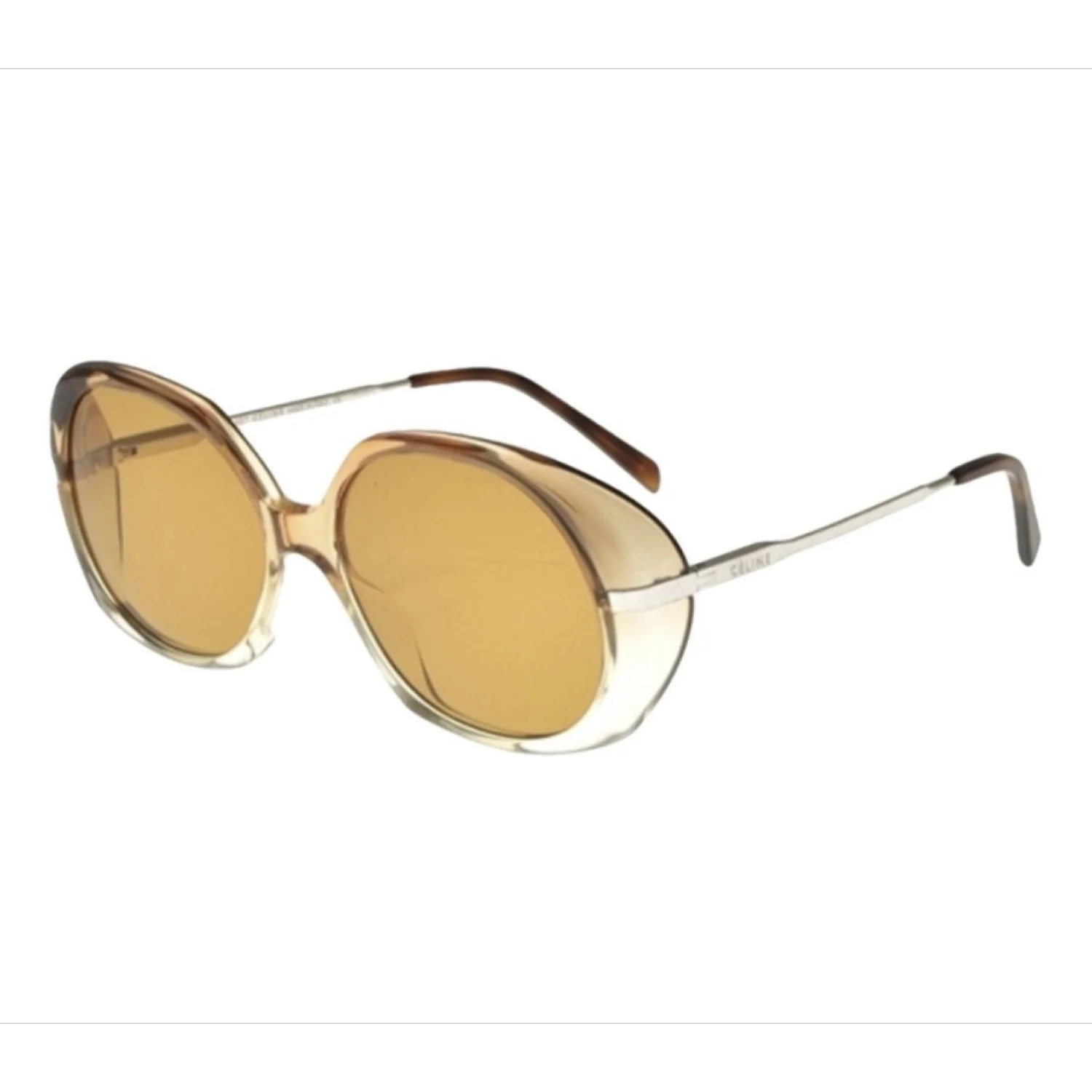These Celine oversized sunglasses feature a bold design with gradient brown lenses and clear frames. The model number CL4004/S 5255S implies a chic, contemporary look typical of Celine's aesthetic. Perfect for adding a touch of glamour to any outfit. Includes original packaging. #Celine #Oversized #DesignerSunglasses
