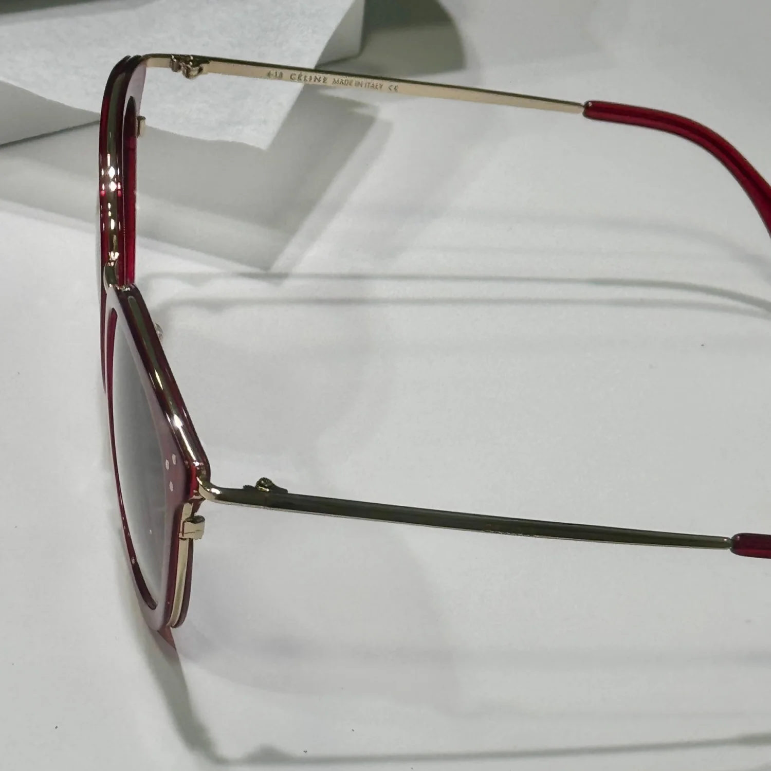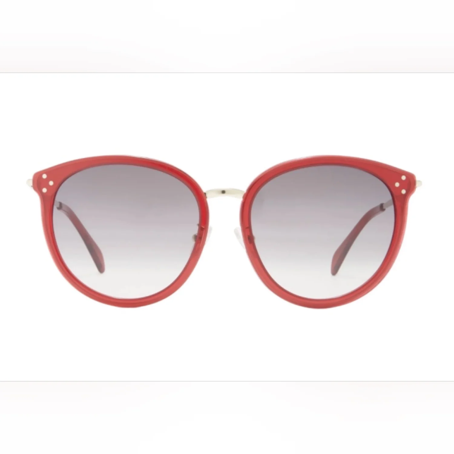Celine CL40033F sunglasses feature a stylish red round frame with gradient lenses. Made in Italy, these sunglasses come with a gold-tone metal bridge and temples for a chic look. Perfect for adding a pop of color to any outfit. Comes with an original Celine case for safe storage. #Celine #Sunglasses #Luxury #Fashion #MadeInItaly