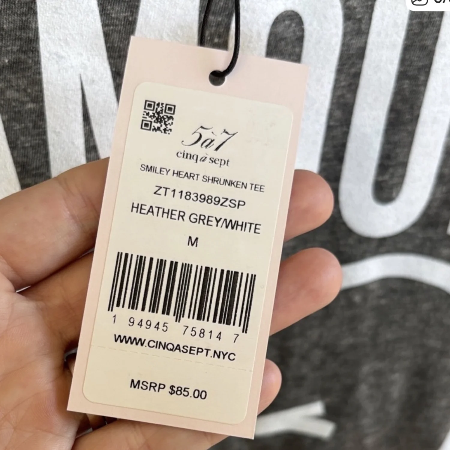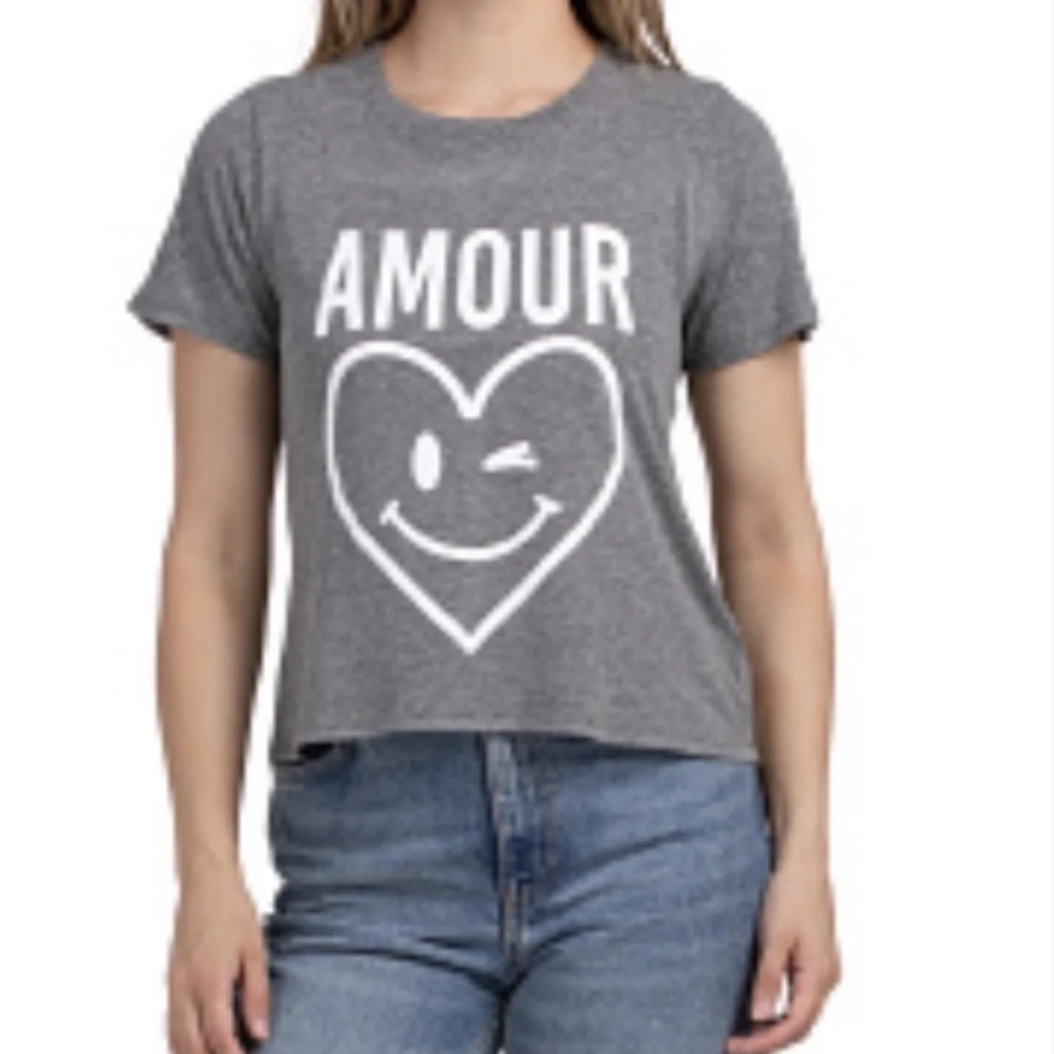 This Cinq à Sept 'Amour' graphic t-shirt features a playful design with a winking heart and 'AMOUR' text. Made from soft material in heather grey and white, this tee is perfect for casual outings. The t-shirt is tagged as a Medium (M). Care instructions recommend gentle washing to maintain the print quality. #GraphicTee #Casual #Cotton