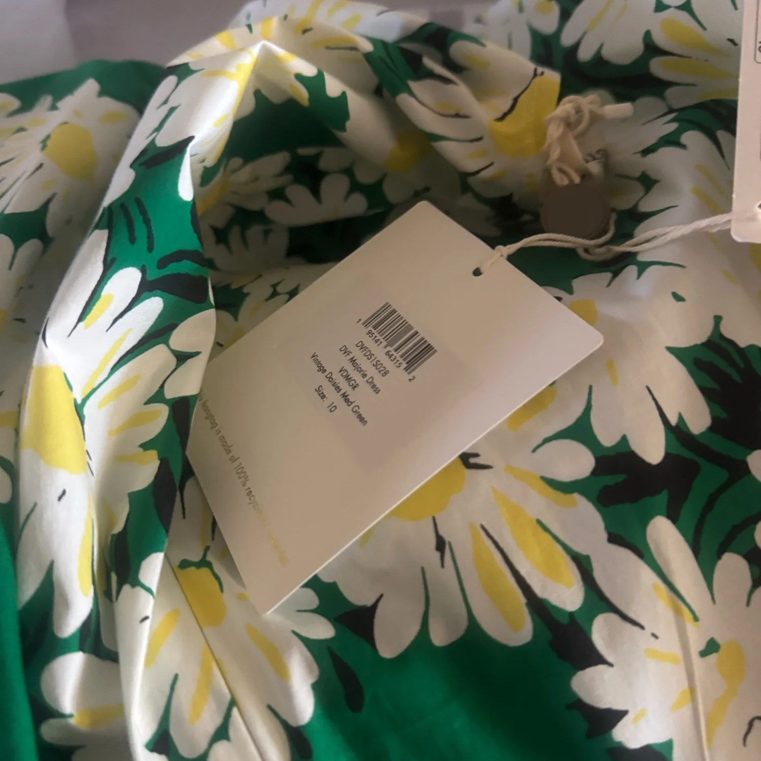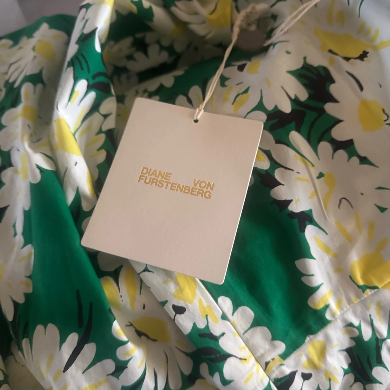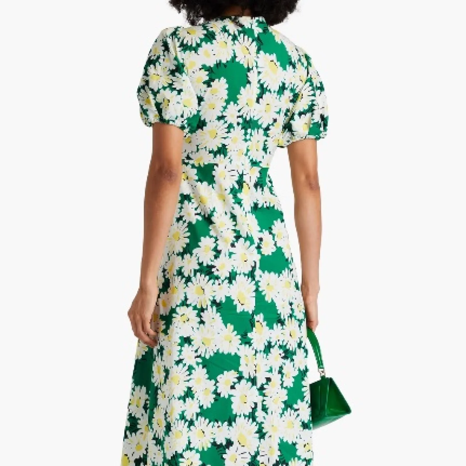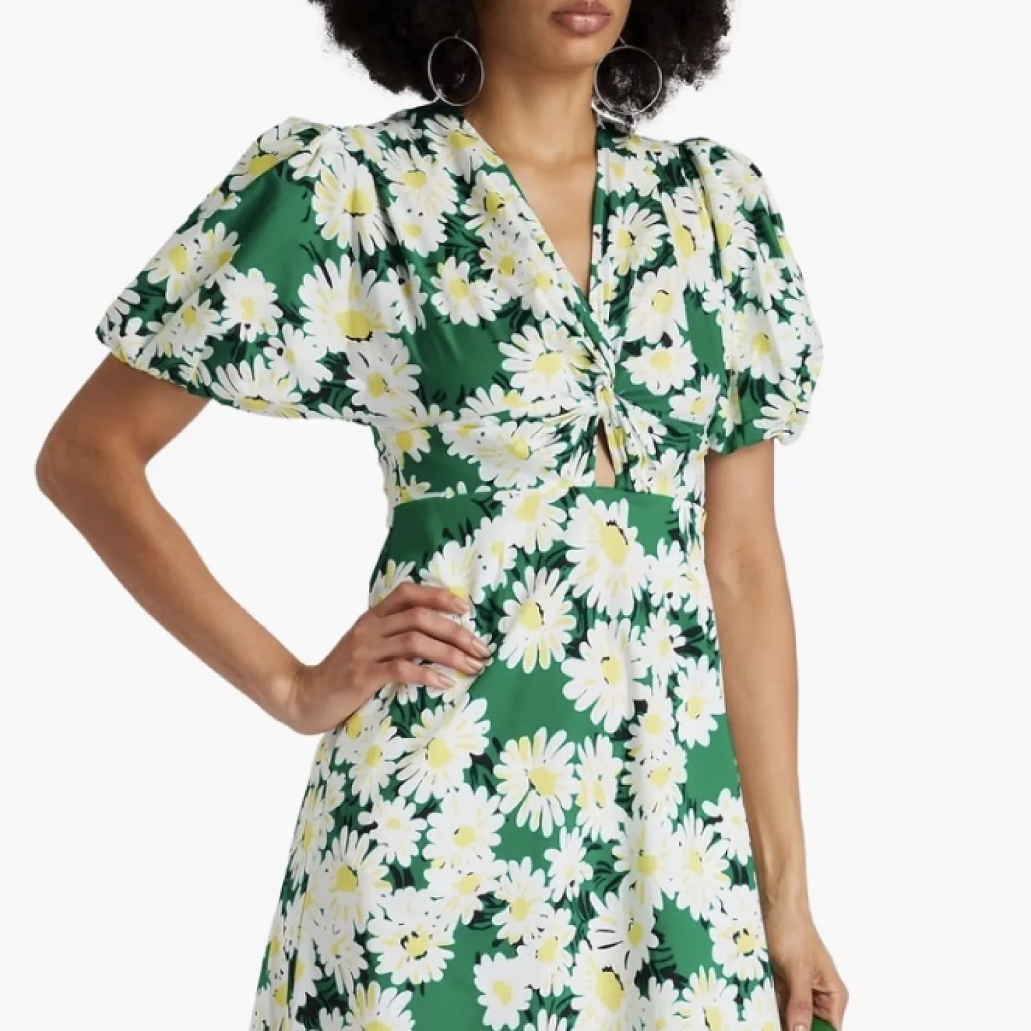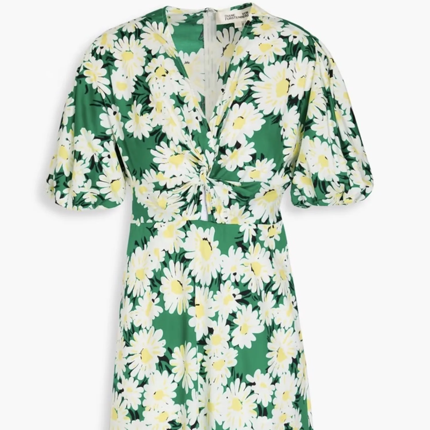 This Diane von Furstenberg midi dress features a vibrant green base with an all-over white and yellow floral print. The dress has a feminine silhouette with puffed short sleeves and a V-neckline, creating an elegant yet playful look. Made from high-quality materials, it offers both comfort and style, perfect for spring or summer outings. Ideal for any casual or semi-formal occasion. #floral #midi #spring #summer