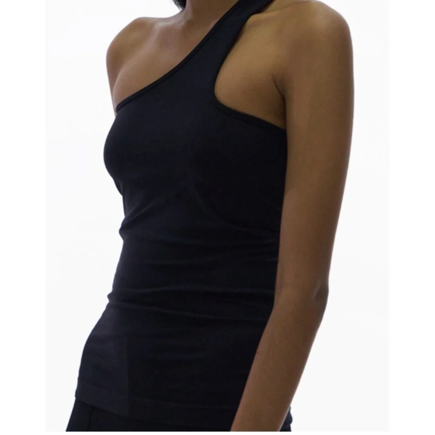 This stylish Helmut Lang tank top features an asymmetric one-shoulder design, perfect for an elegant and modern look. Made from high-quality fabric, it ensures comfort and a flattering fit. Ideal for casual or evening wear. #HelmutLang #OneShoulder #BlackTop