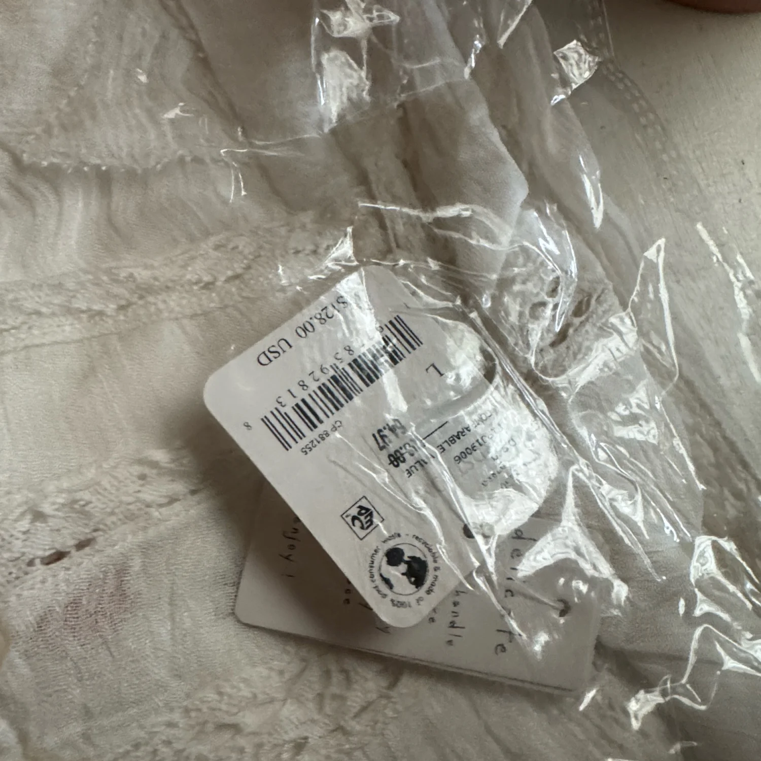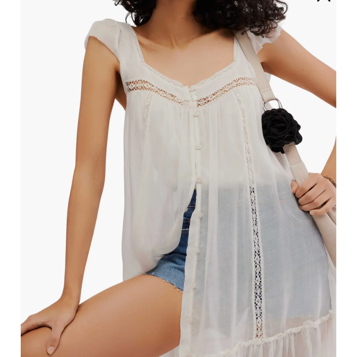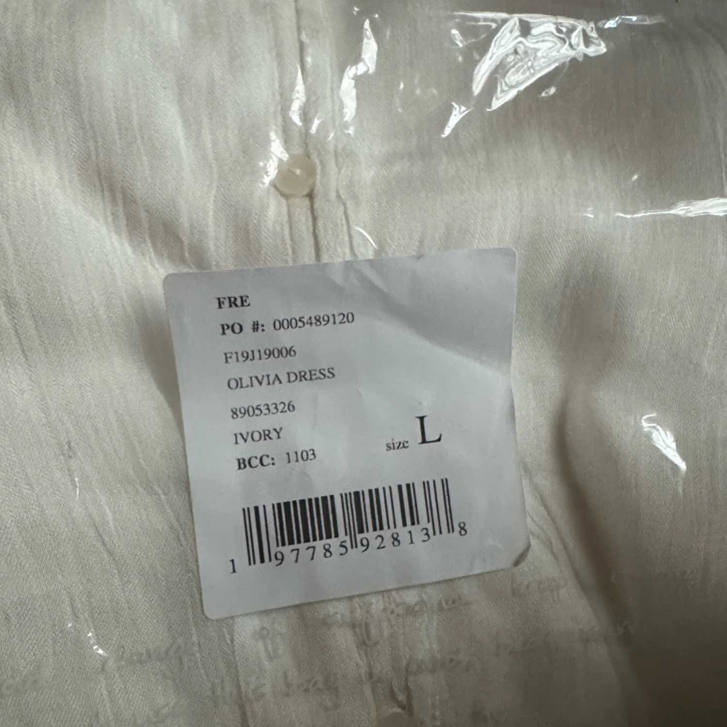 This Olivia Dress in ivory features a delicate sleeveless design with lace detailing and a layered, ruffled hem. The dress is lightweight and airy, perfect for summer or a special occasion. It includes buttons down the front and is semi-sheer, requiring layering with other garments. Tags indicate new condition. Size L.