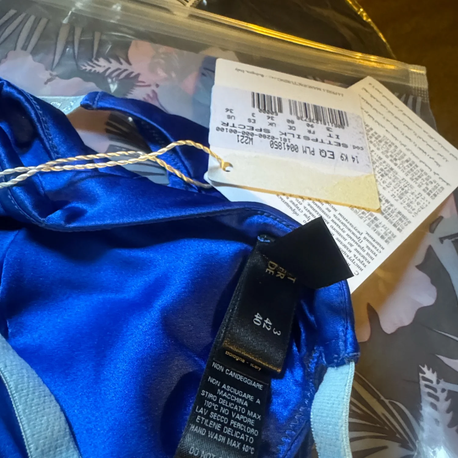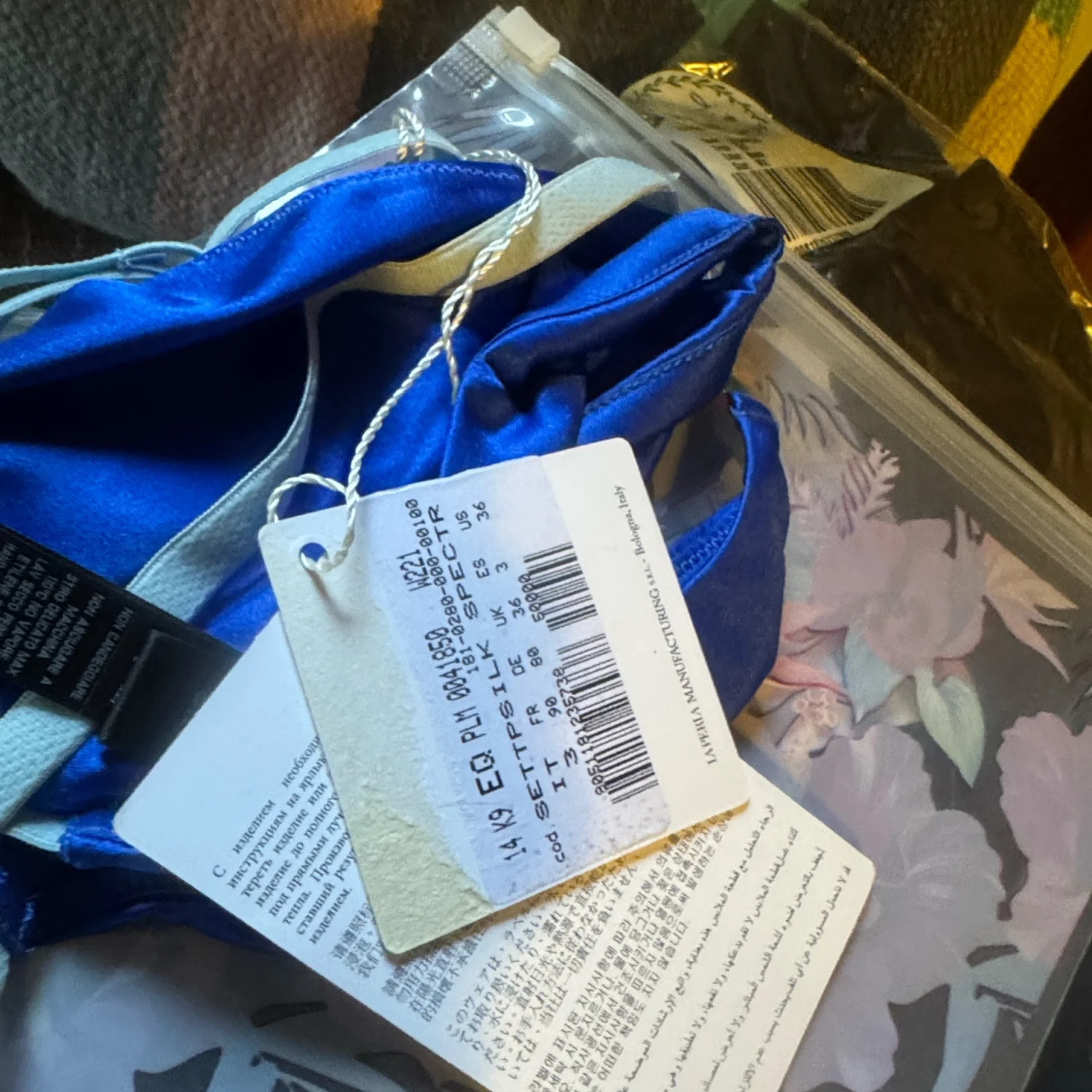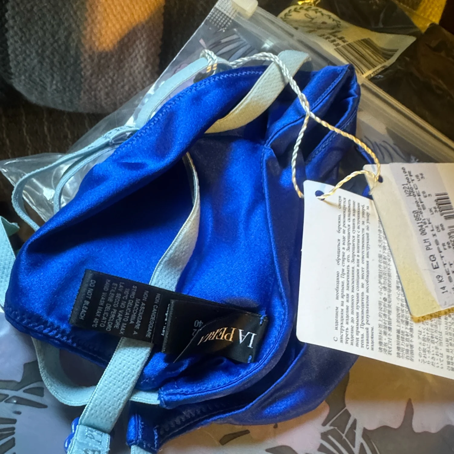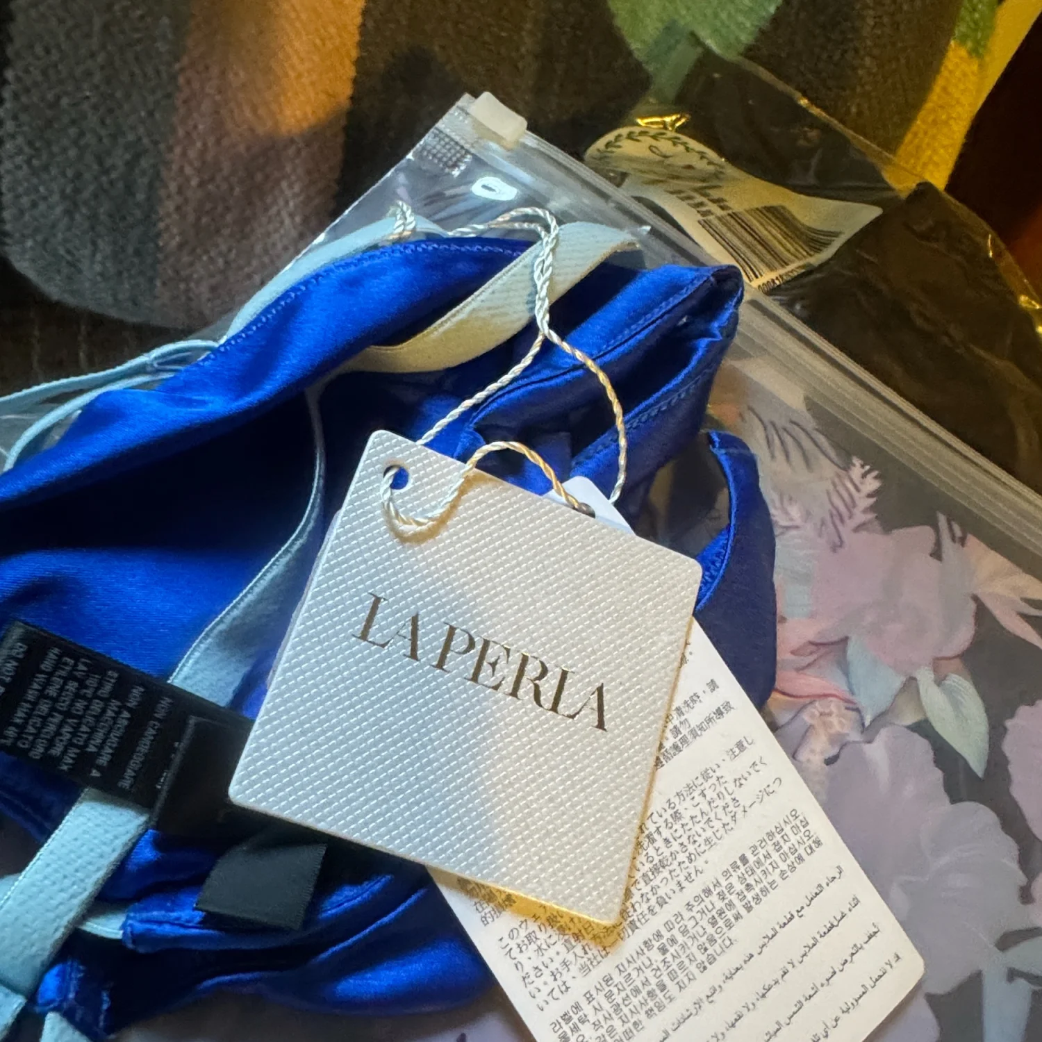 Luxurious La Perla triangle bra in a striking blue satin. Features adjustable light blue straps for a perfect fit. Made from high-quality materials for comfortable wear. This piece is ideal for a stylish and elegant beach day. Tags and packaging intact, indicating new condition. #LaPerla #Luxury