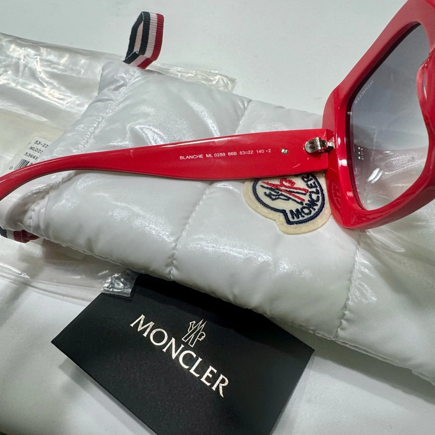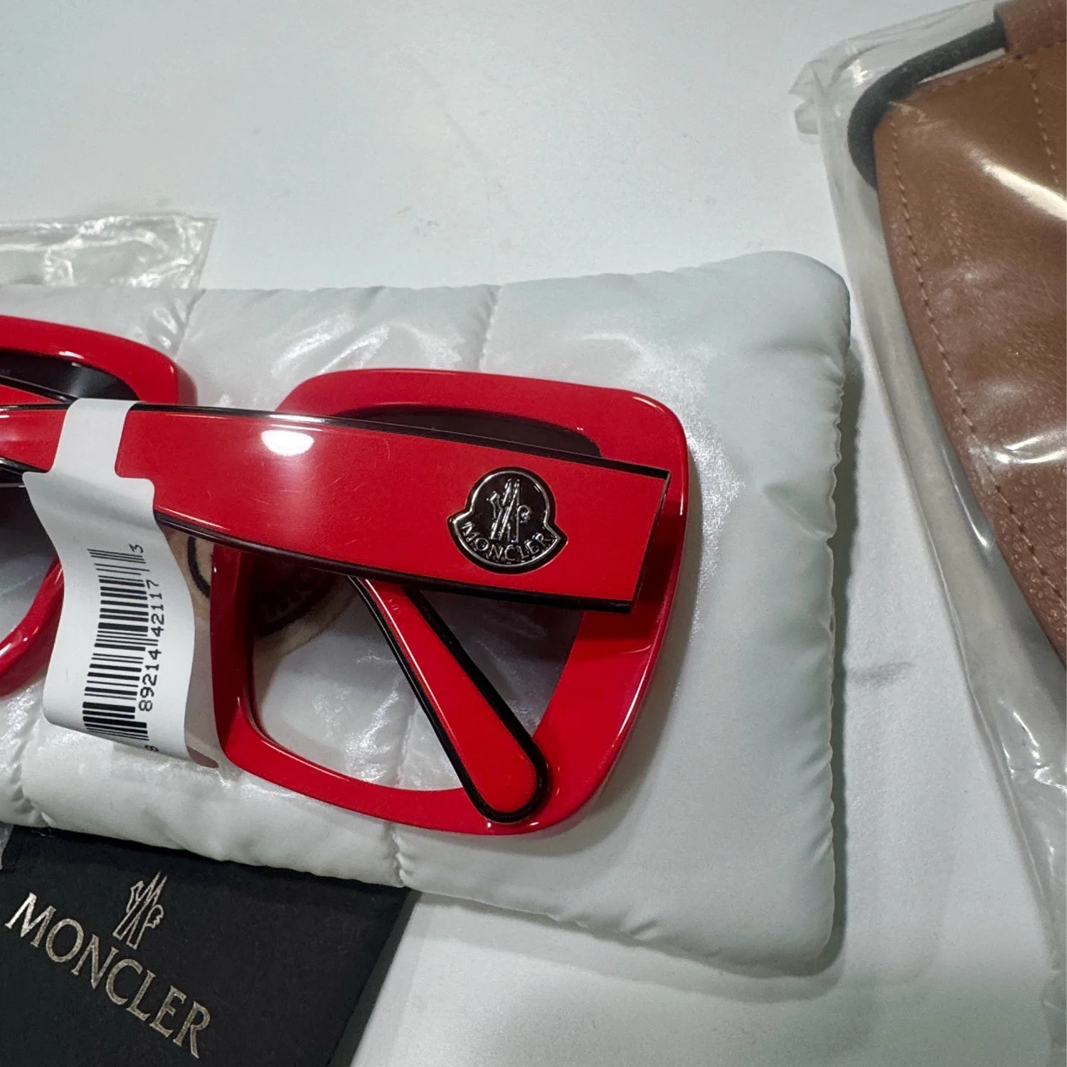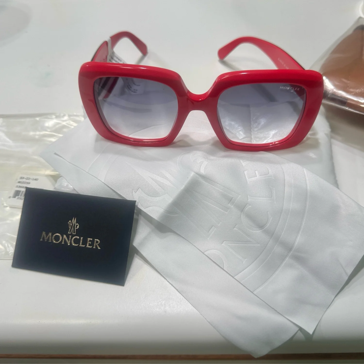 These vibrant red square sunglasses from Moncler feature a bold, oversized frame with gradient lenses. The sunglasses are accented with the Moncler logo on the arms. They come with a protective Moncler-branded case. Perfect for a fashion-forward statement look. #Moncler #Sunglasses #Red