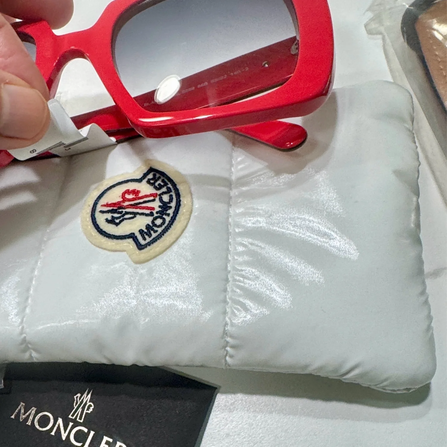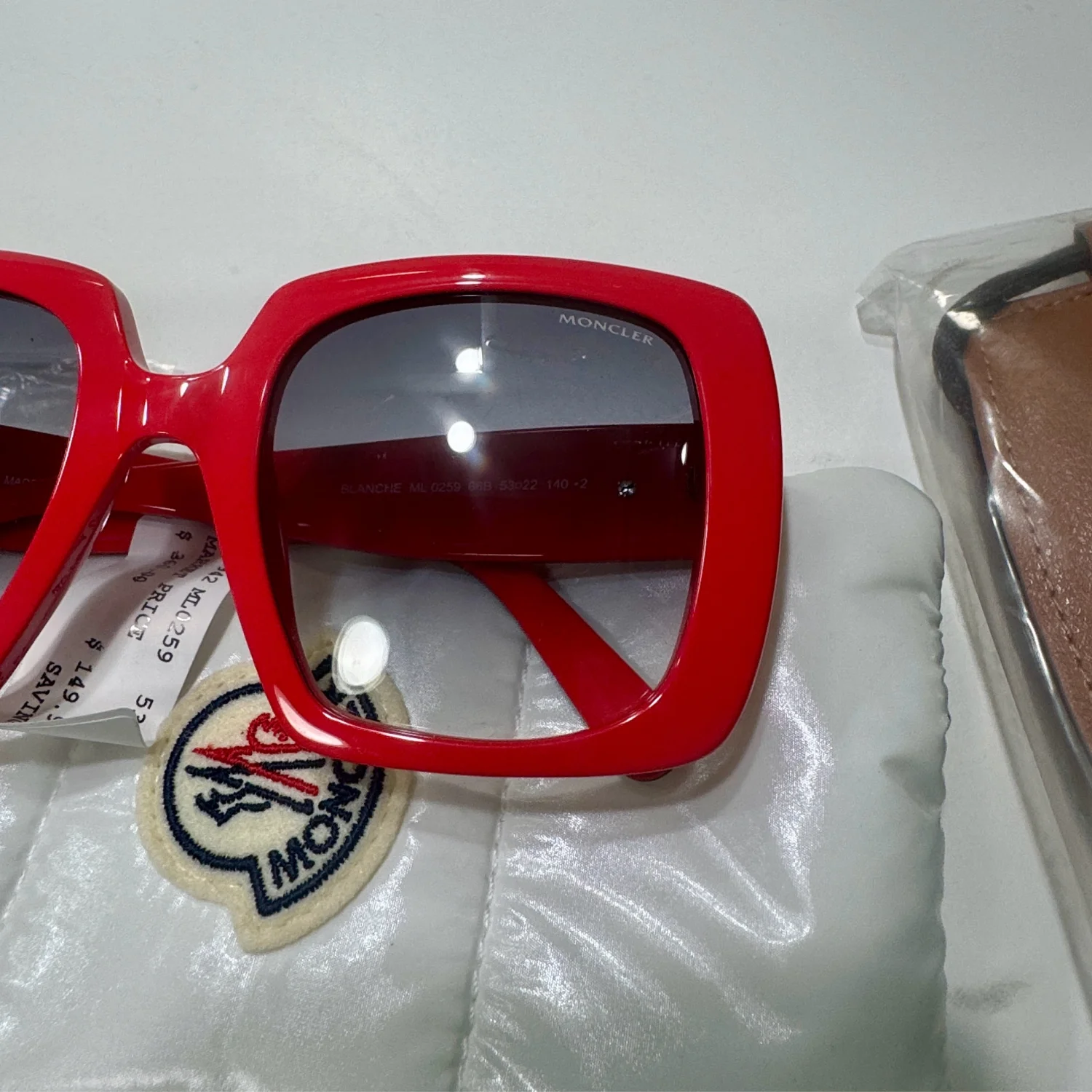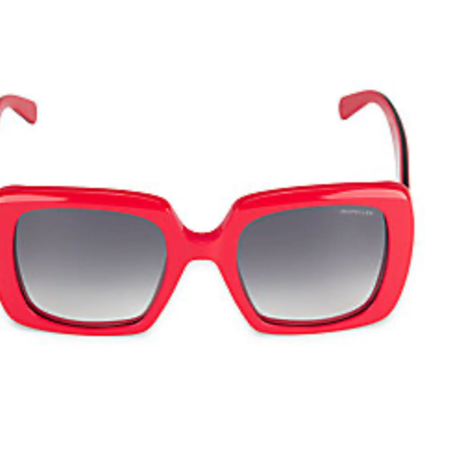 These vibrant red square sunglasses from Moncler feature a bold, oversized frame with gradient lenses. The sunglasses are accented with the Moncler logo on the arms. They come with a protective Moncler-branded case. Perfect for a fashion-forward statement look. #Moncler #Sunglasses #Red