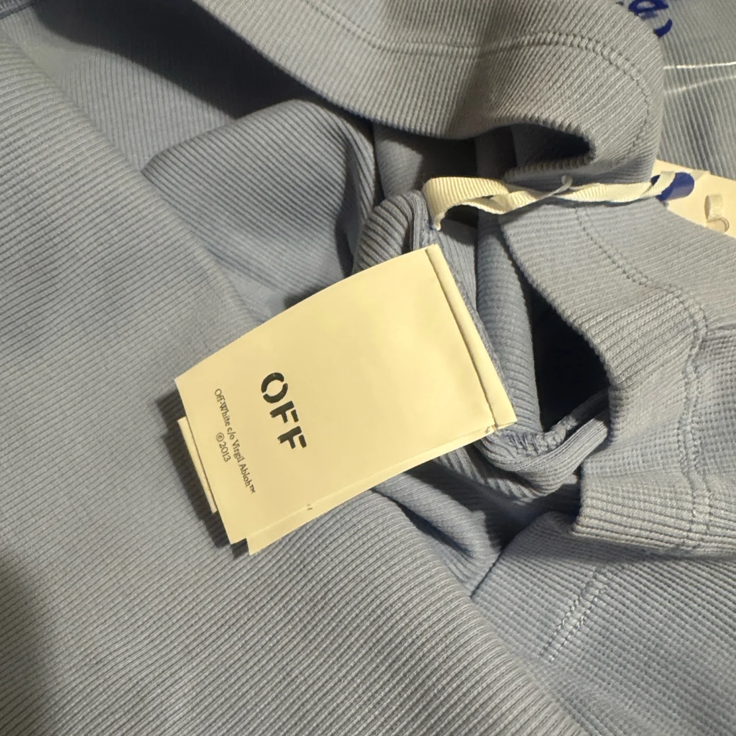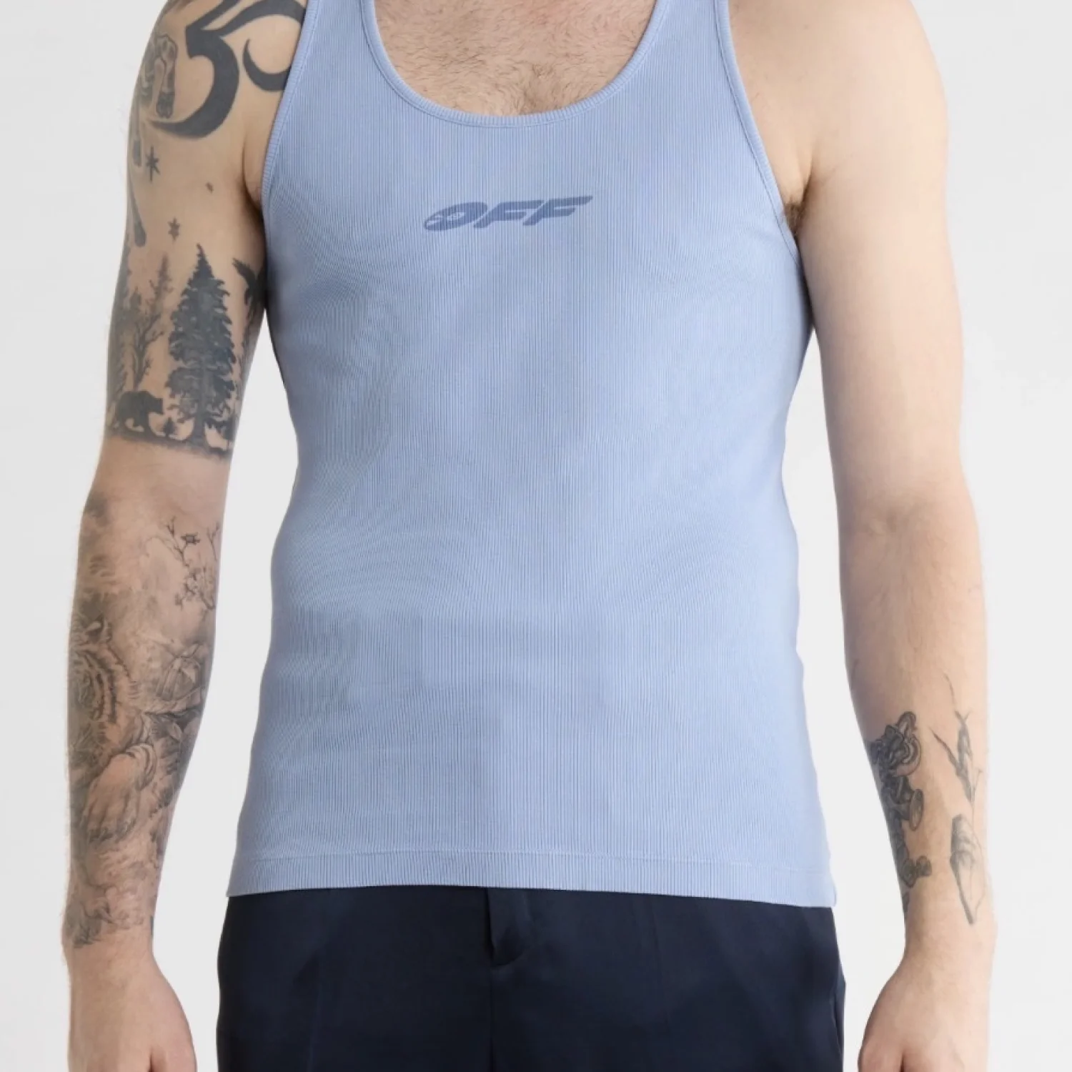 This stylish light blue tank top from Off-White features a ribbed texture and a subtle logo on the front. Made from high-quality materials, it's perfect for casual wear. The tank top is a size L, designed to provide a comfortable fit. Ideal for layering or wearing on its own during warmer days. #OffWhite #TankTop #CasualWear