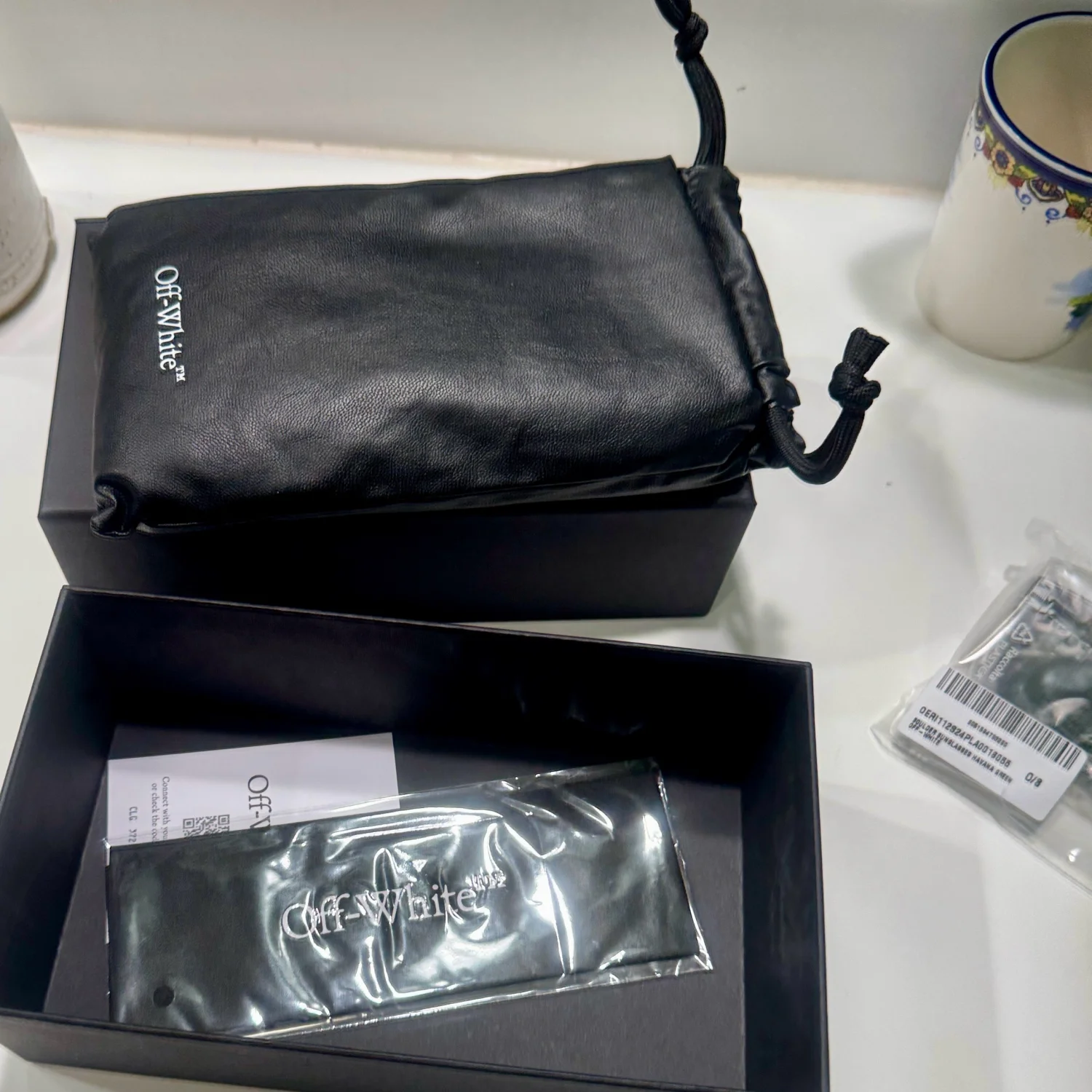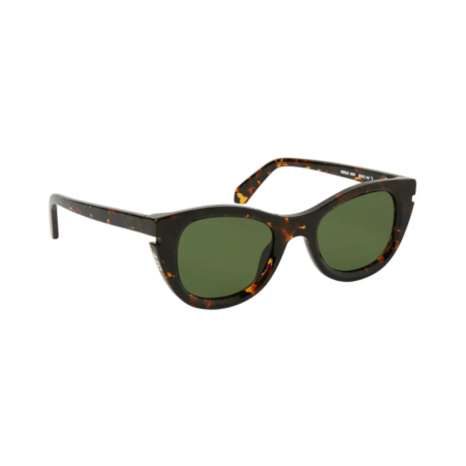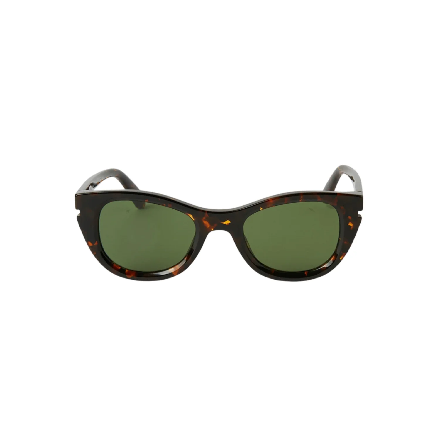 Stylish Off-White sunglasses featuring a bold tortoiseshell frame with green lenses. Perfect for making a fashion statement while protecting your eyes. Comes with original packaging, including a branded case and box. #OffWhite #DesignerSunglasses #Fashion