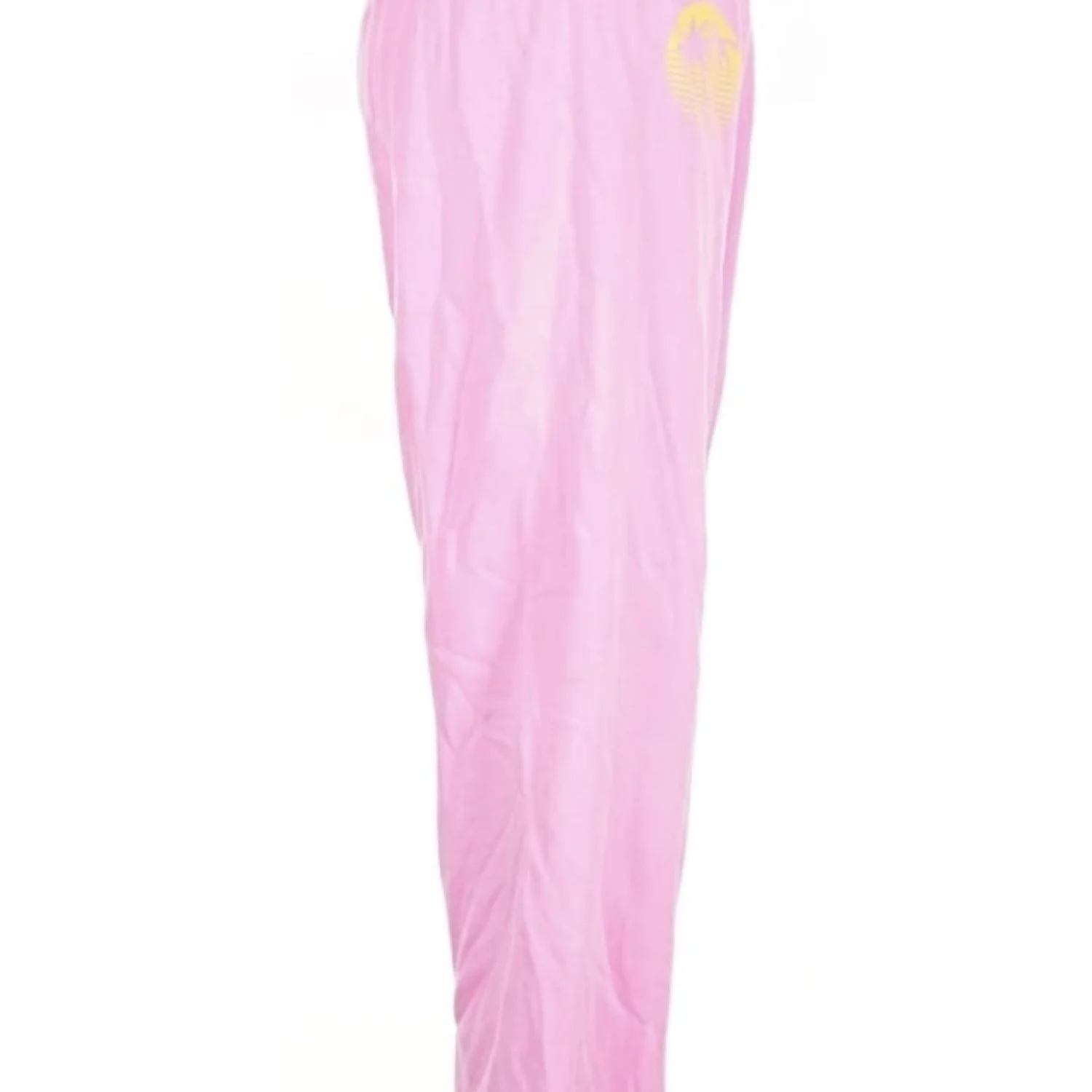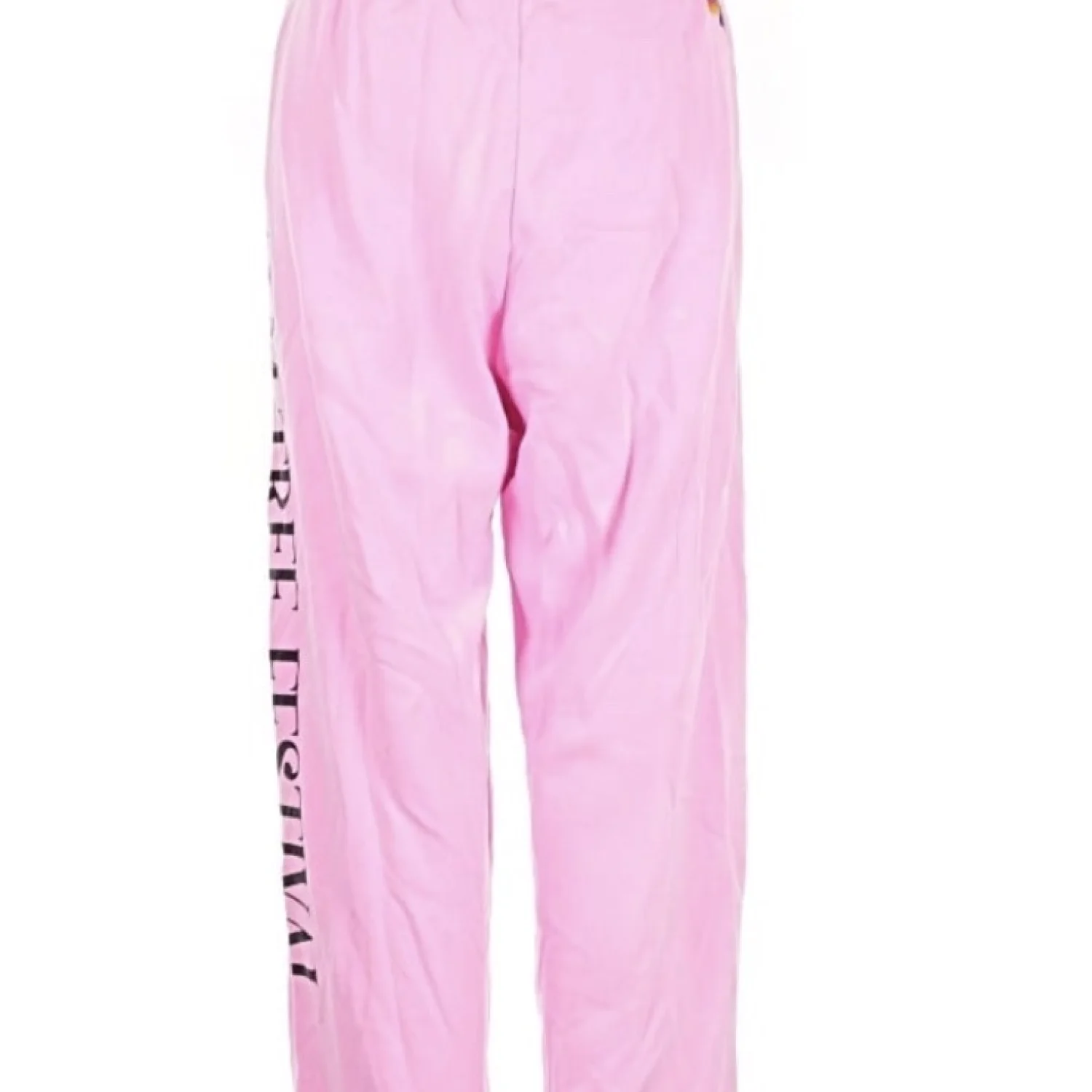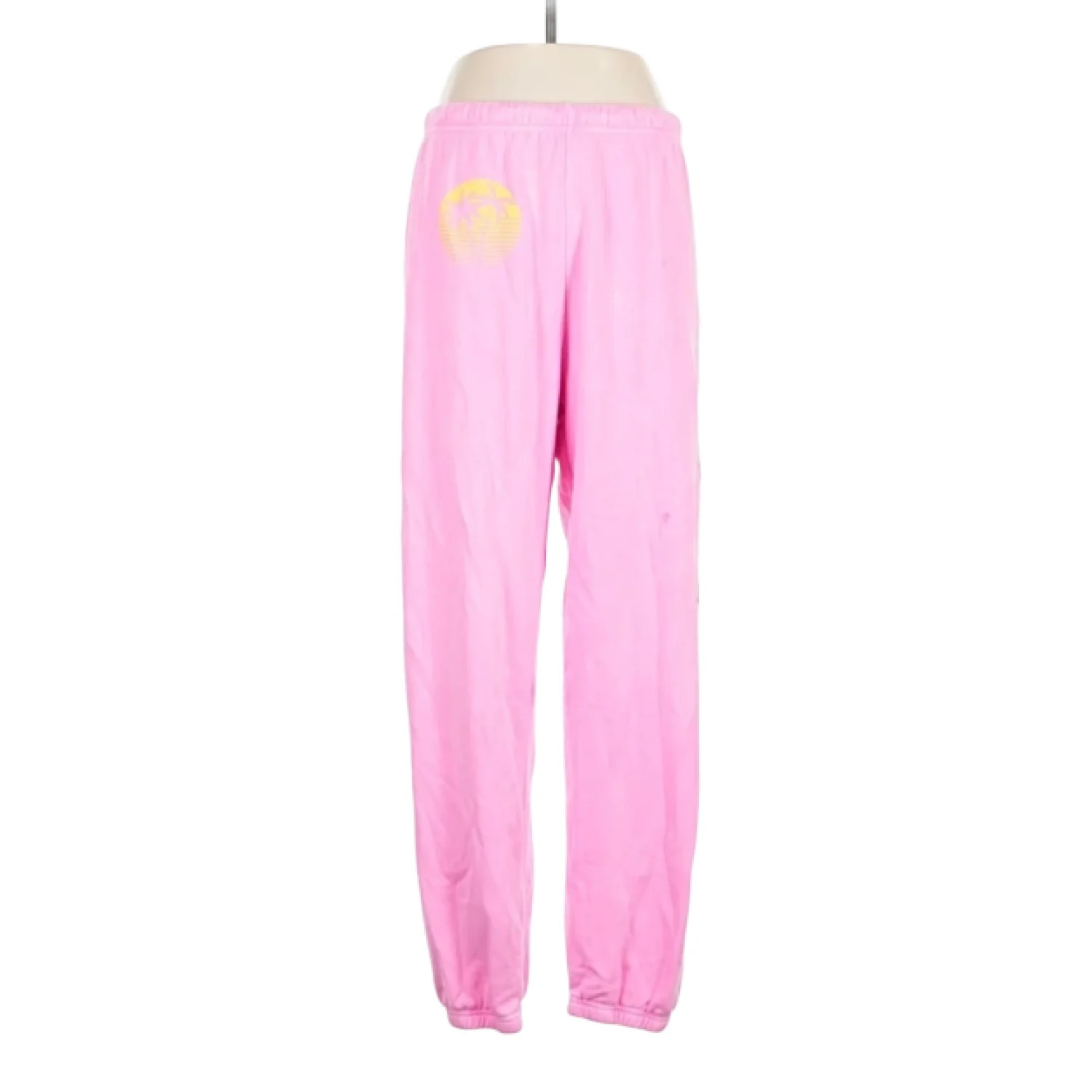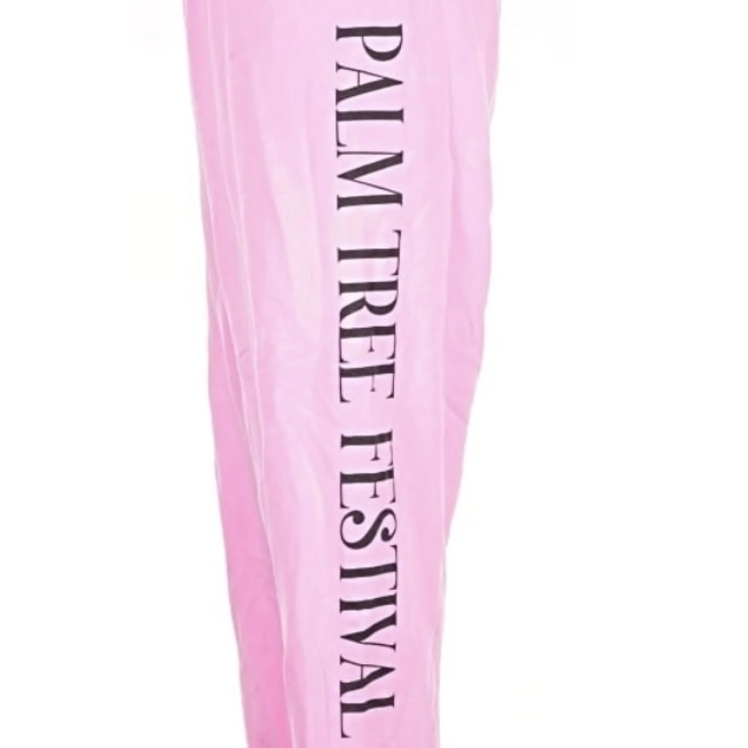 Vibrant pink track pants featuring 'Palm Tree Festival' text along one leg, with an elastic waistband and yellow logo detail. Perfect for casual wear or lounging, these pants offer comfort and a bold statement. The fabric is lightweight and breathable, ideal for warm weather activities. Brand detail indicates 'Aviator Nation'. #festival #tracks