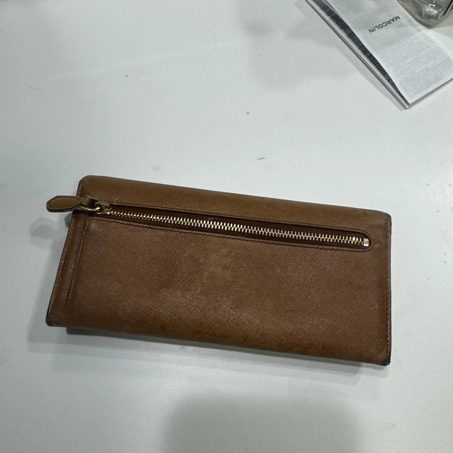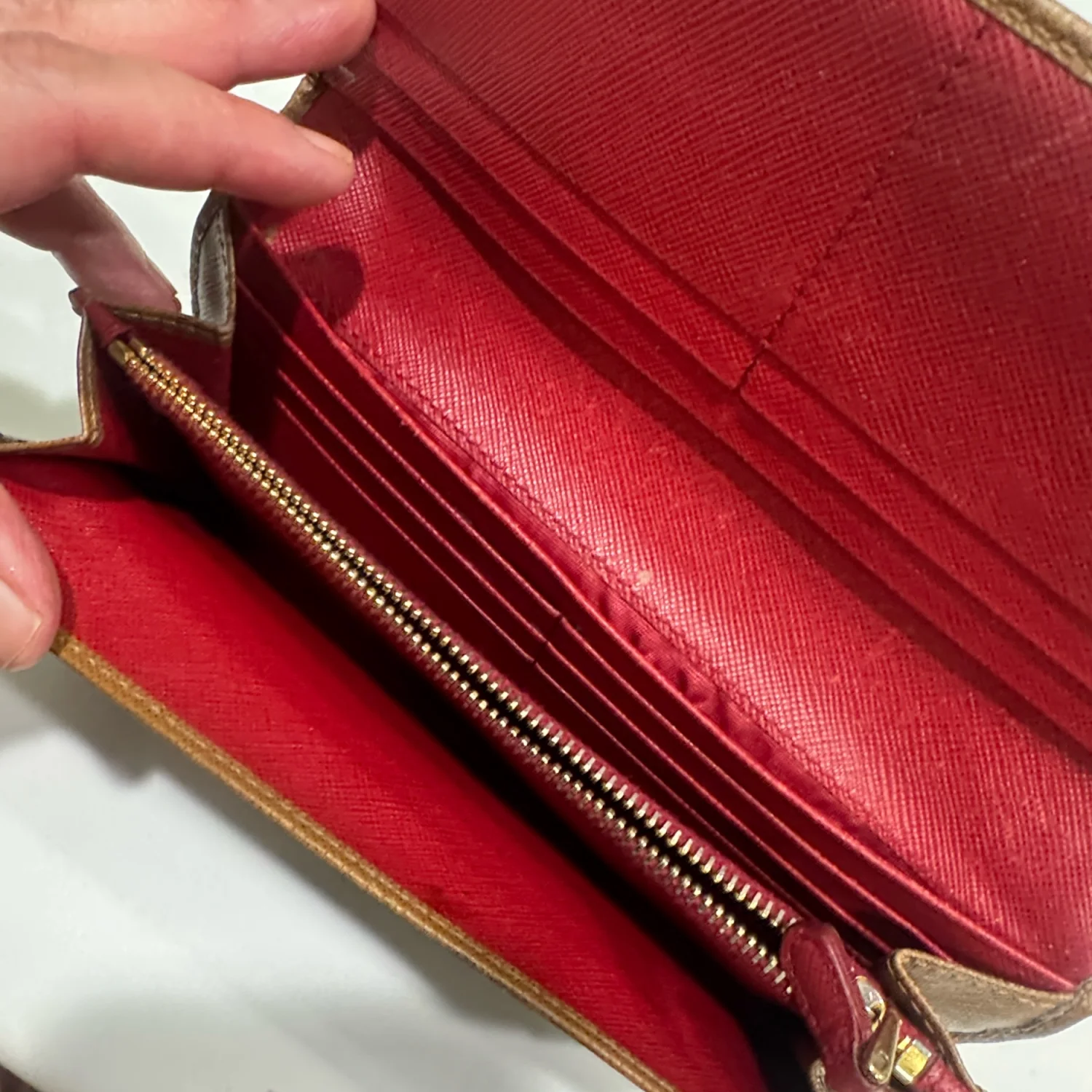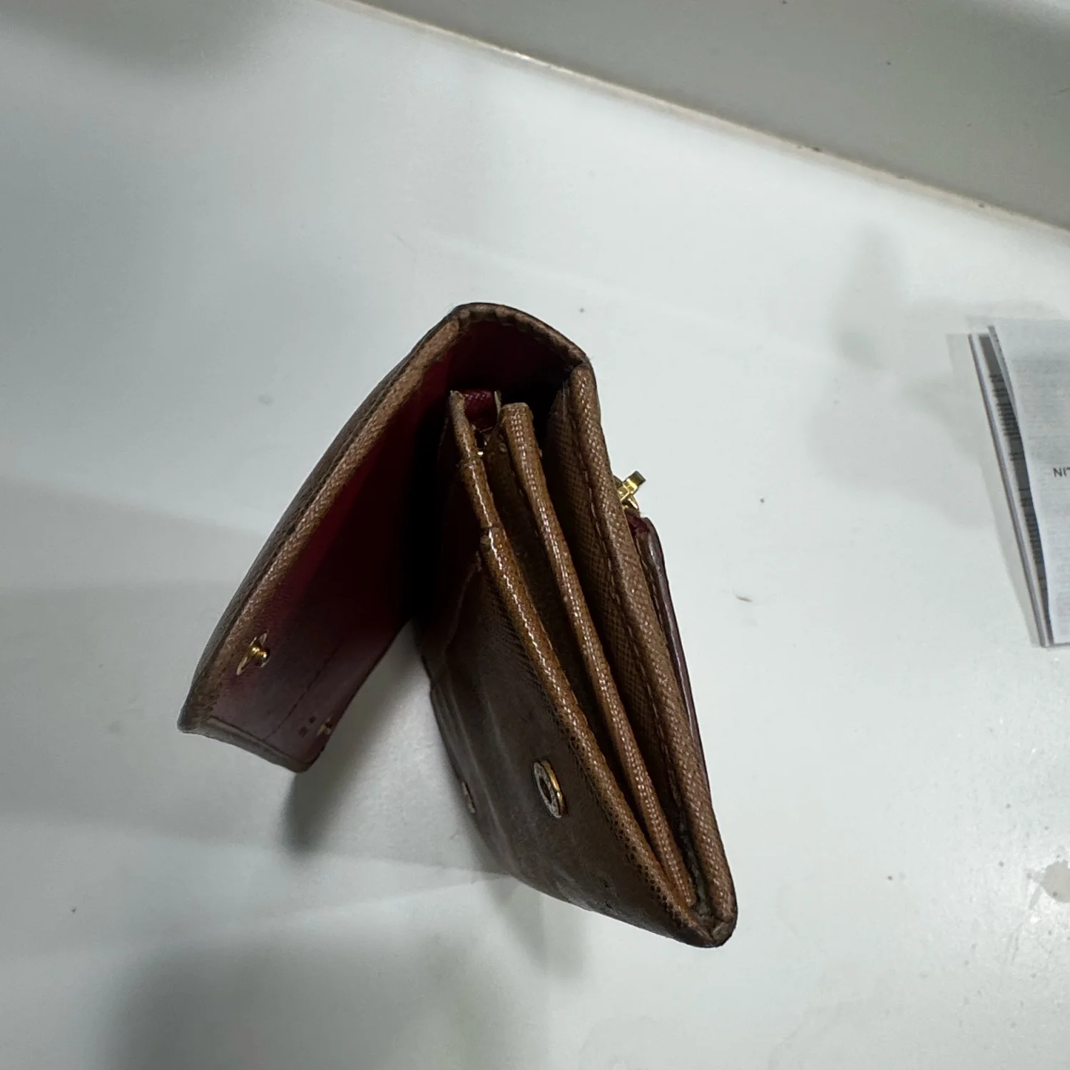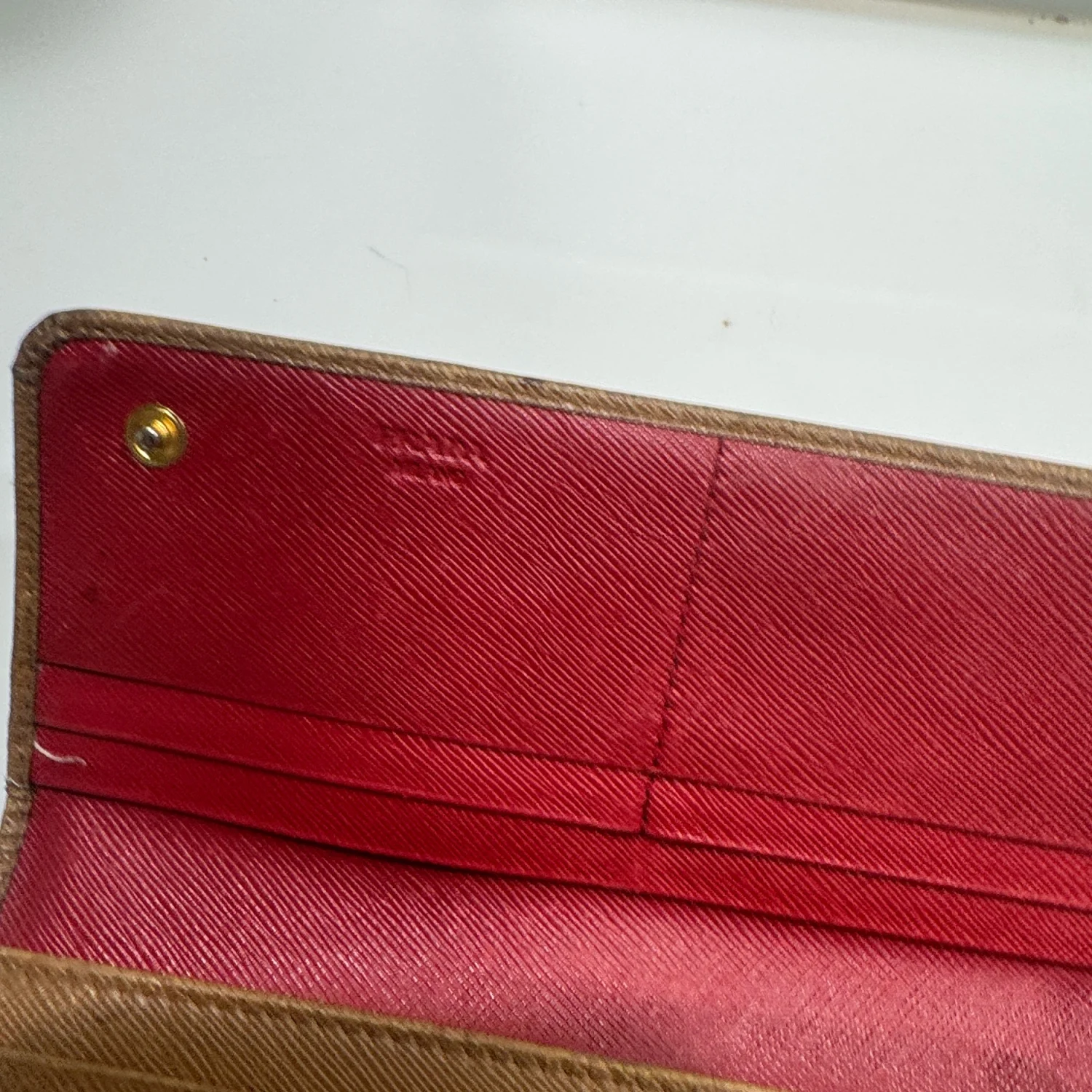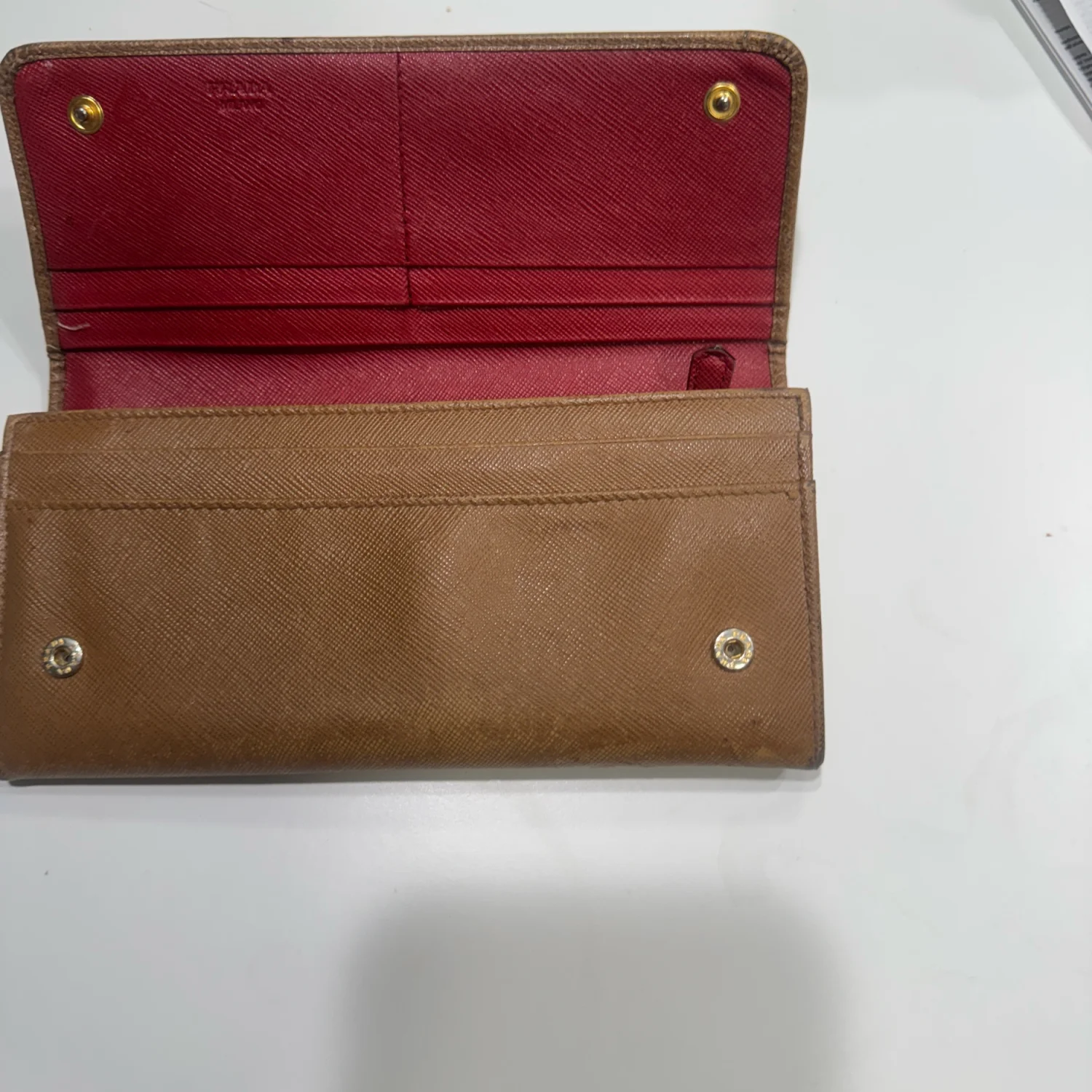 This Prada wallet features a sophisticated brown leather exterior with a contrasting red interior, providing both style and functionality. It includes multiple card slots and a zippered back pocket for additional storage. The wallet shows signs of wear on the leather, indicating gentle use. Perfect for everyday elegance. #Prada #LeatherWallet #LuxuryAccessories