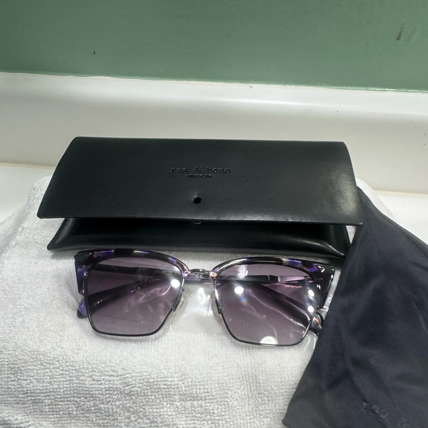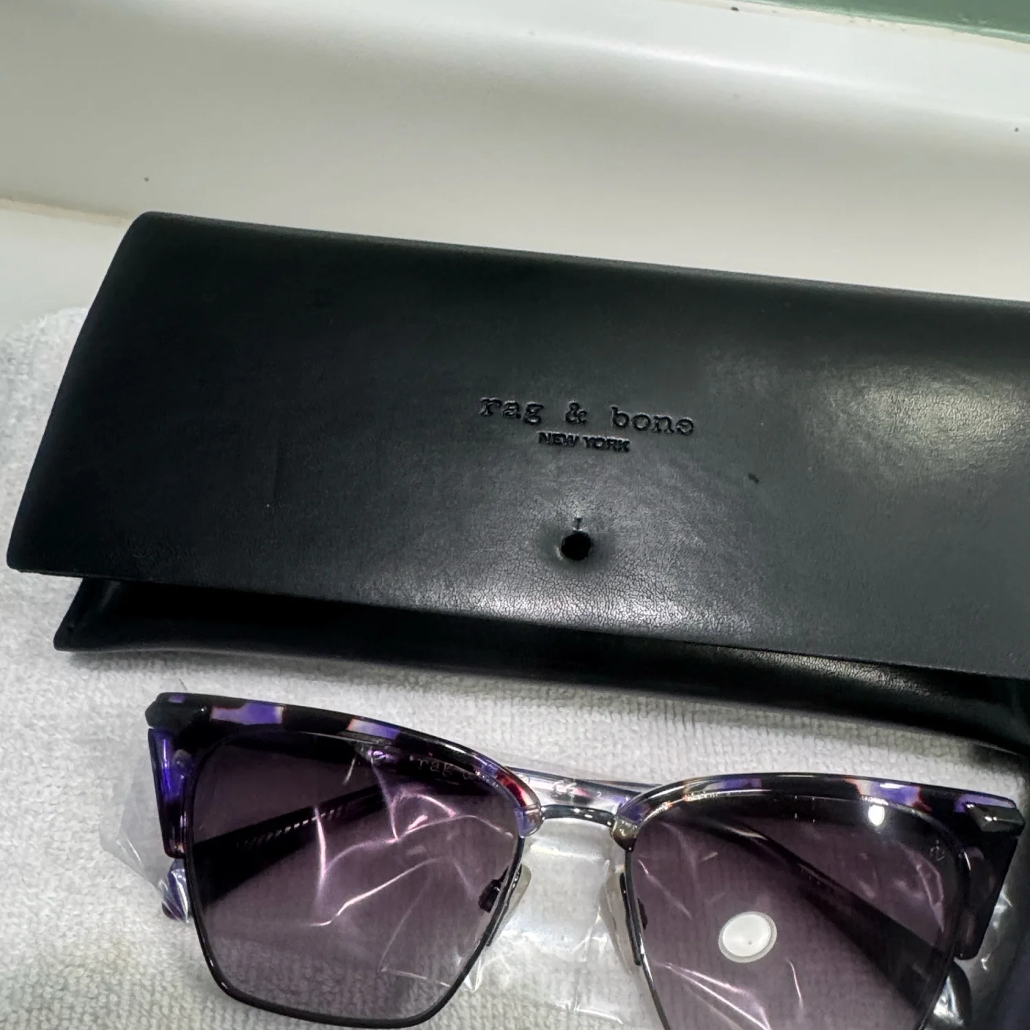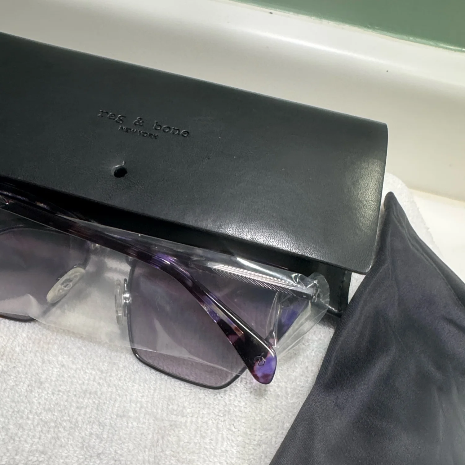 Rag & Bone sunglasses with stylish purple-tinted lenses and frames. Comes with an official black case and cloth for storage and cleaning. Perfect for adding a touch of elegance to your look. #sunglasses #purple #ragandbone