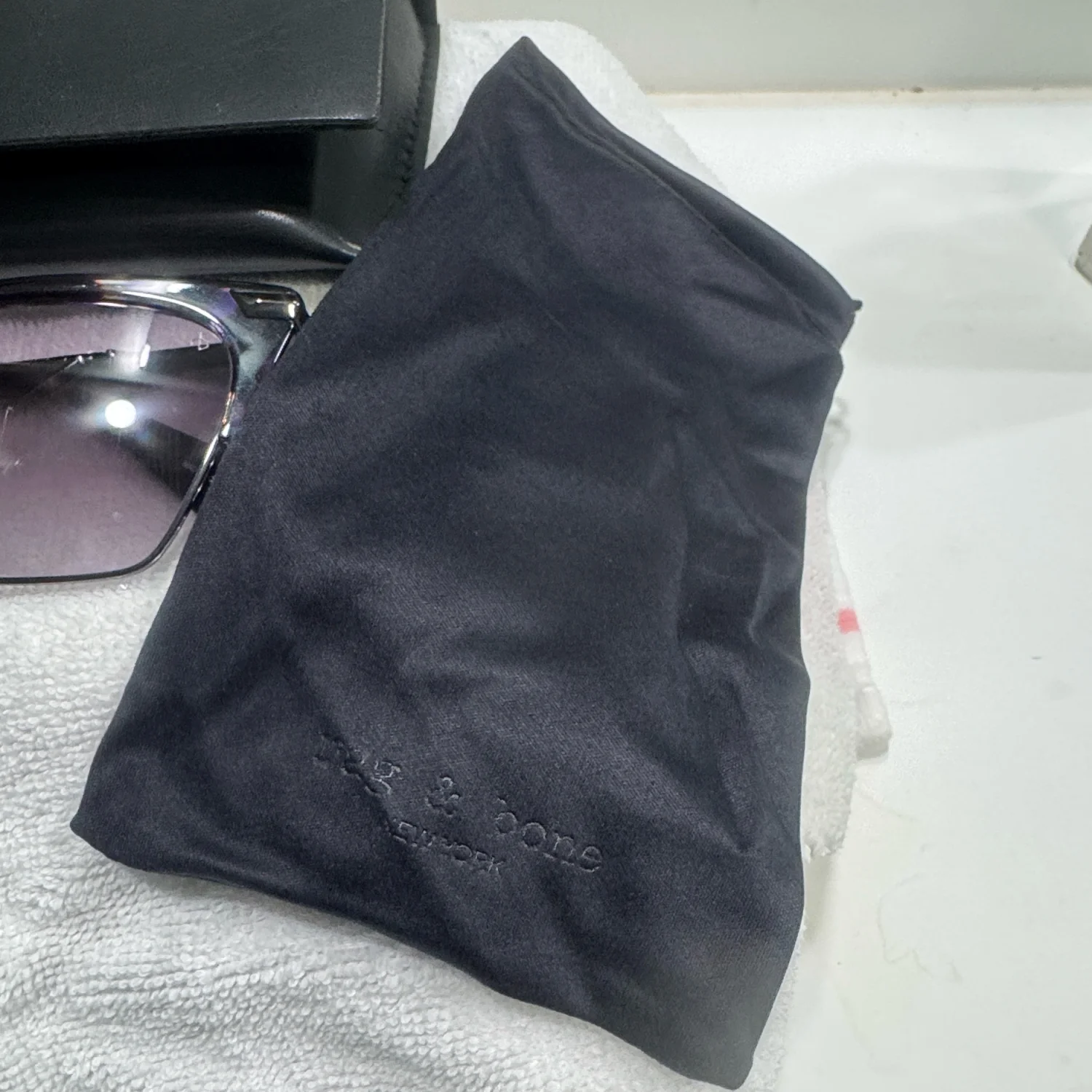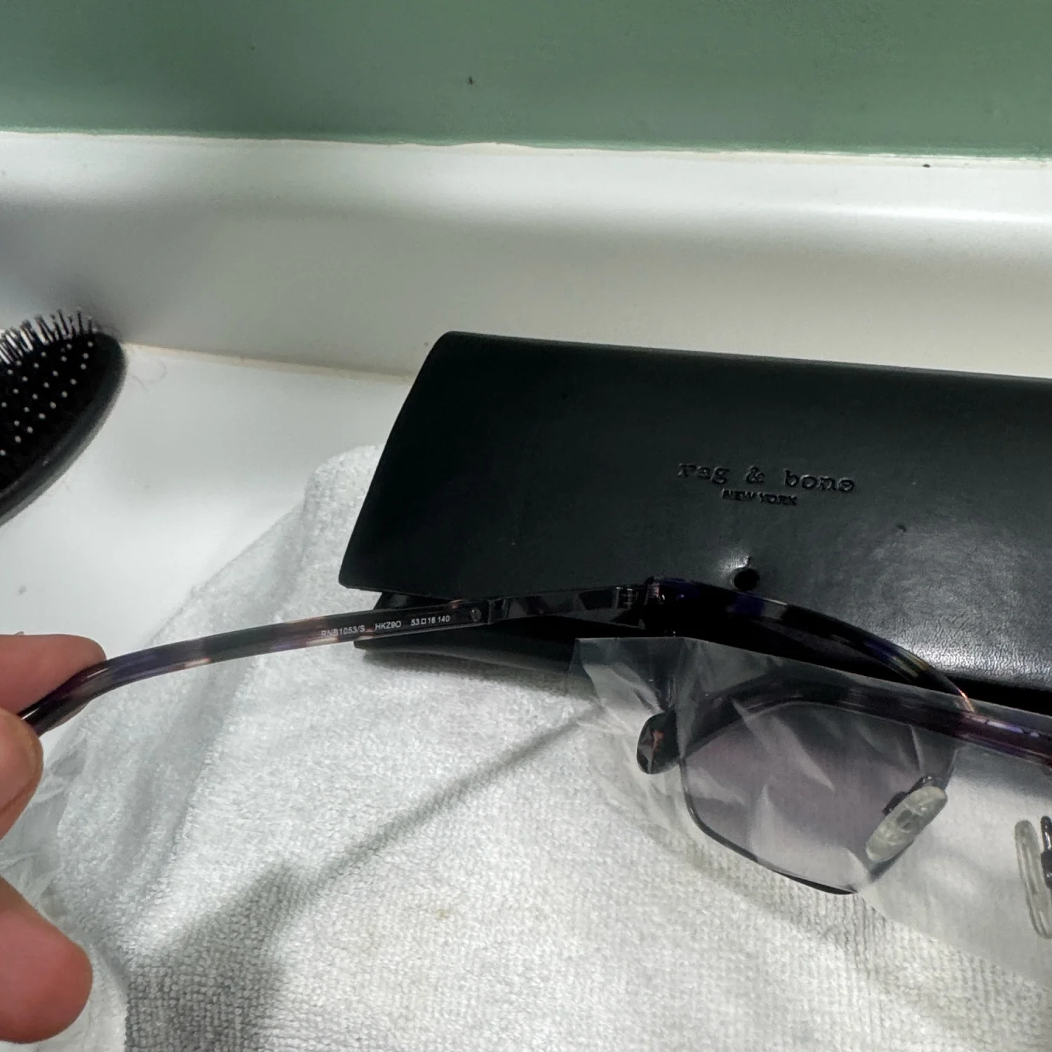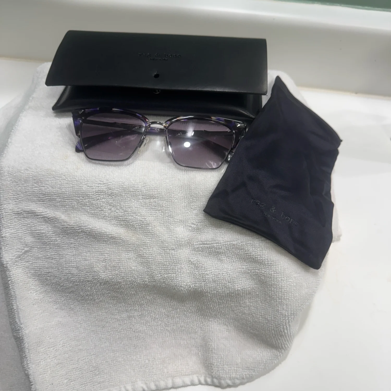 Rag & Bone sunglasses with stylish purple-tinted lenses and frames. Comes with an official black case and cloth for storage and cleaning. Perfect for adding a touch of elegance to your look. #sunglasses #purple #ragandbone