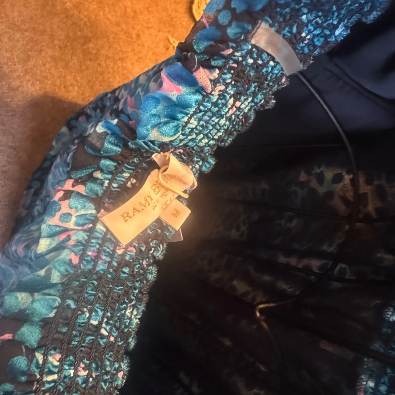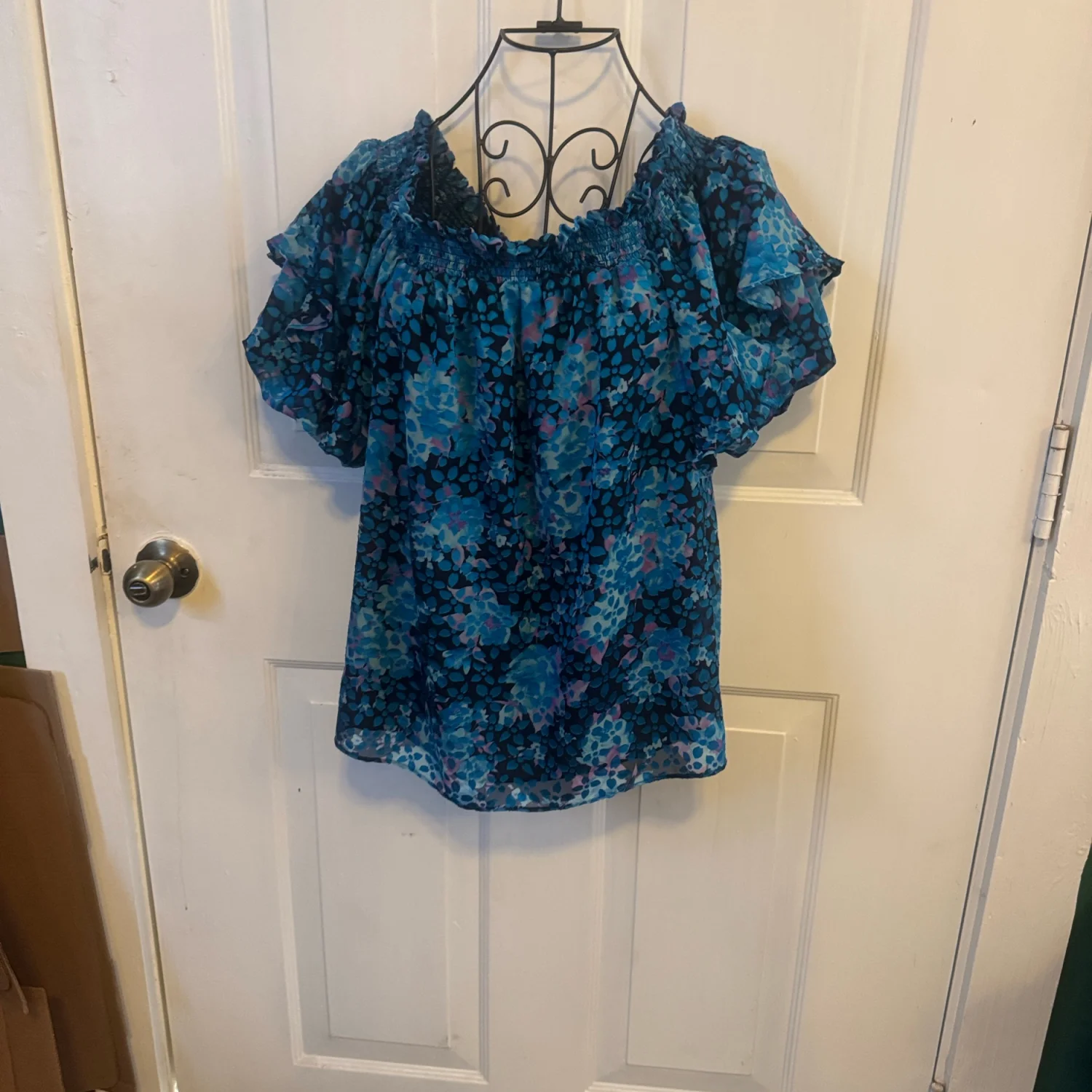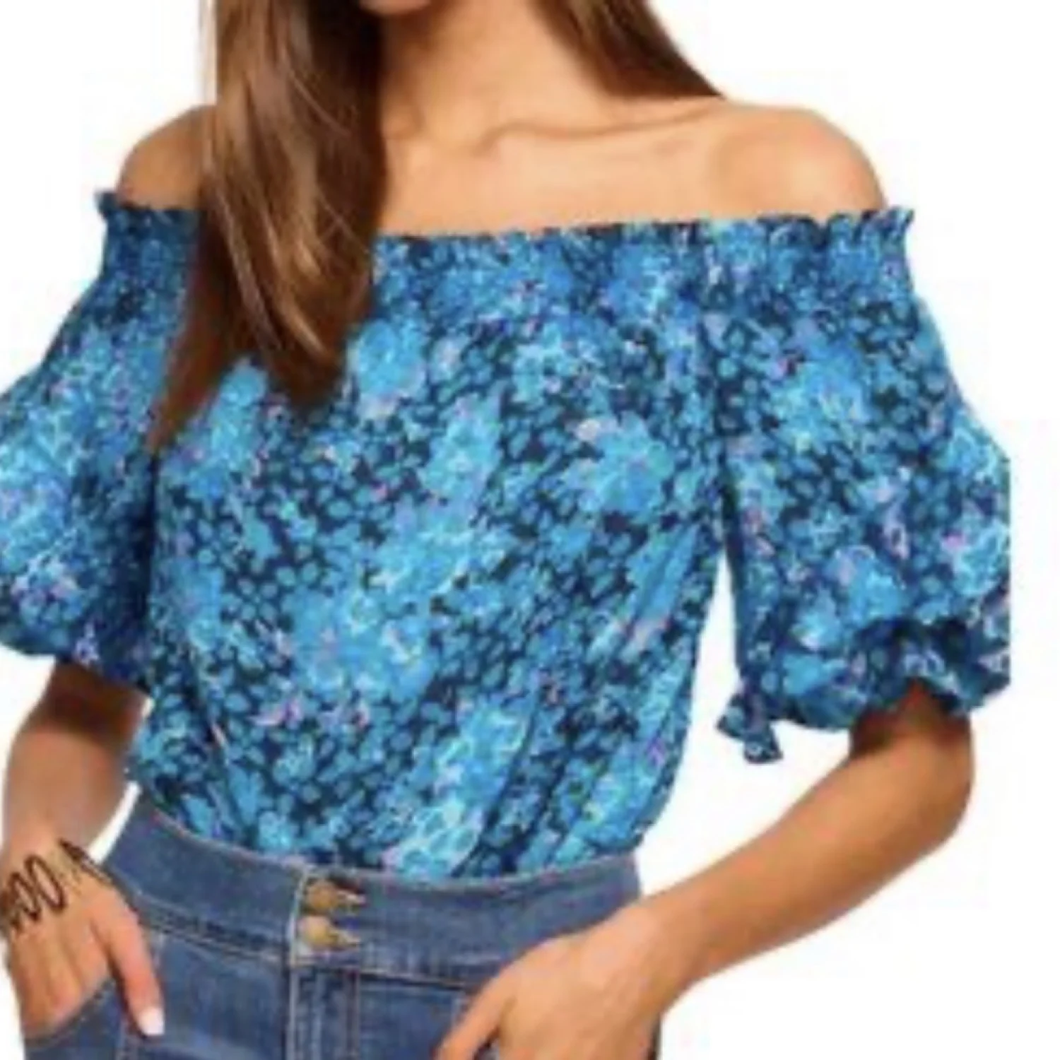 This Ramy Brook off-shoulder blouse features a vibrant floral pattern in shades of blue and pink. The design includes ruffled sleeves for an elegant look. Perfect for casual outings or a summer event. Size: Large. Made from lightweight, breathable fabric for comfort. #floral #offshoulder #summerwear