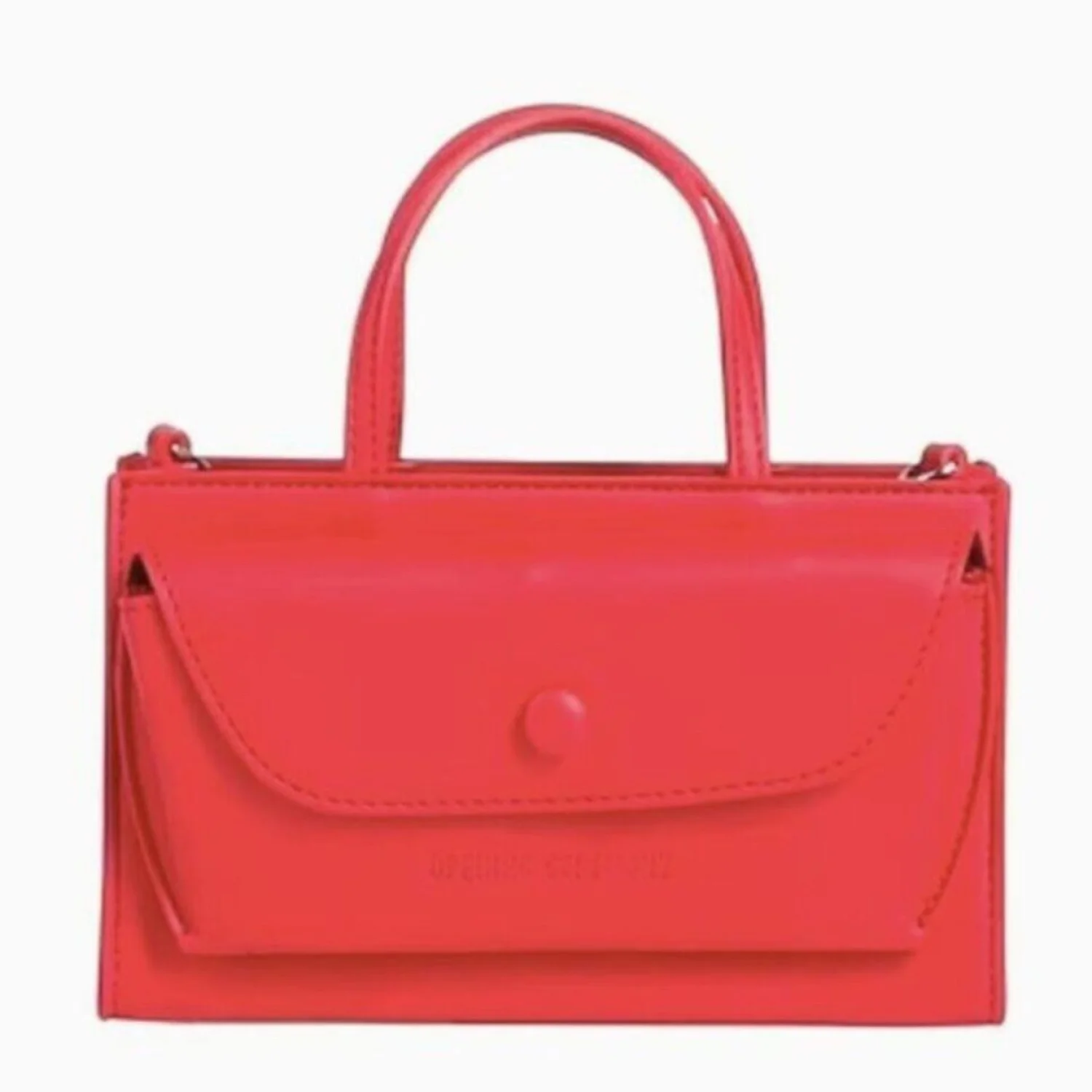 This red mini top handle bag from Opening Ceremony features a sleek, compact design. Made with faux leather, it includes a front flap with a button closure and prominent handle detail. The bag is perfect for carrying essentials in style. Ideal for casual outings or as an eye-catching accessory. Brand: Opening Ceremony. Tags include #fauxleather, #minibag, #redbag.