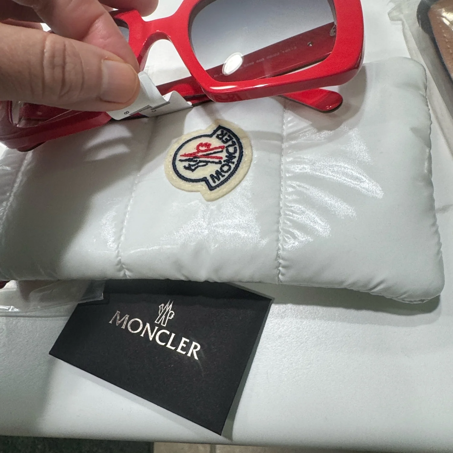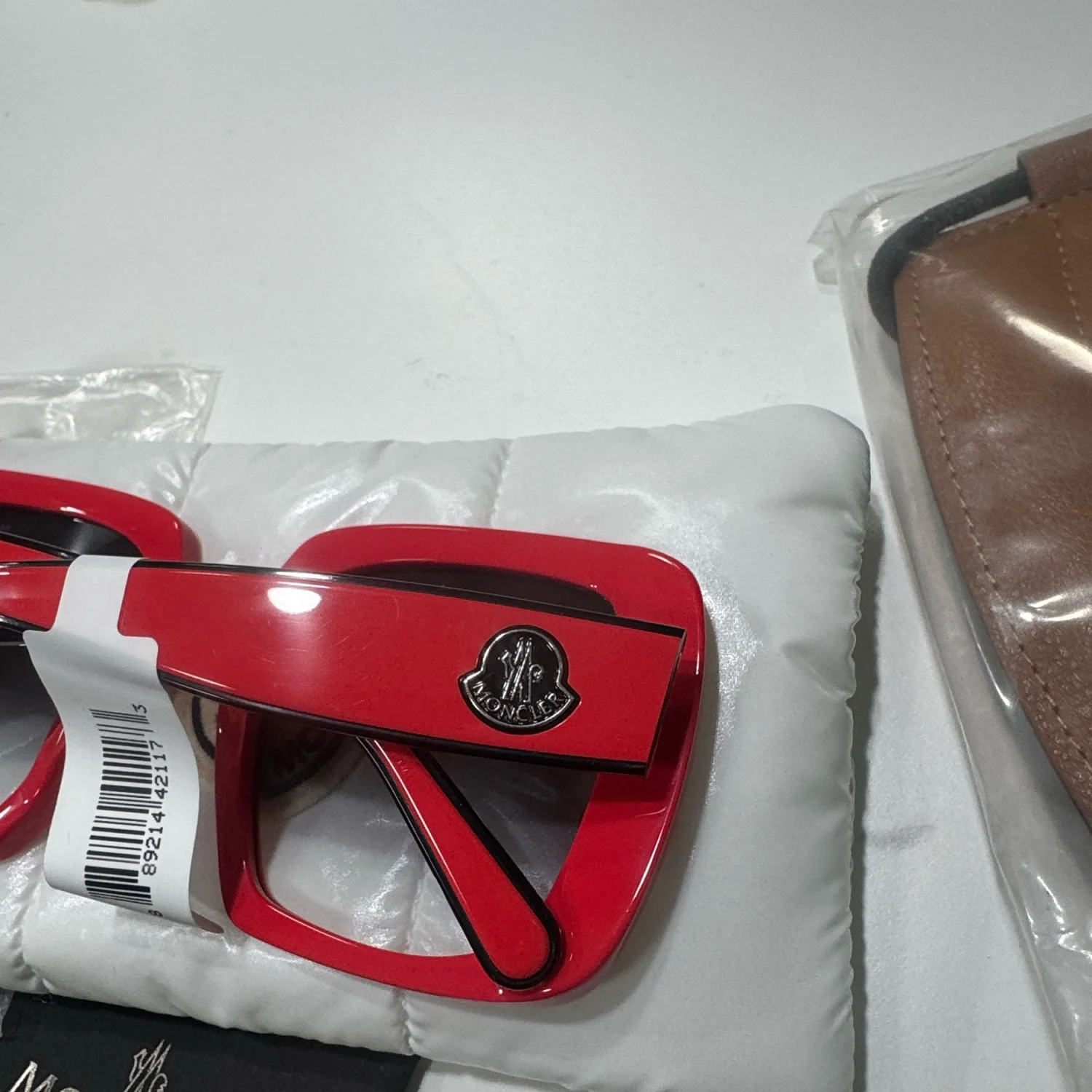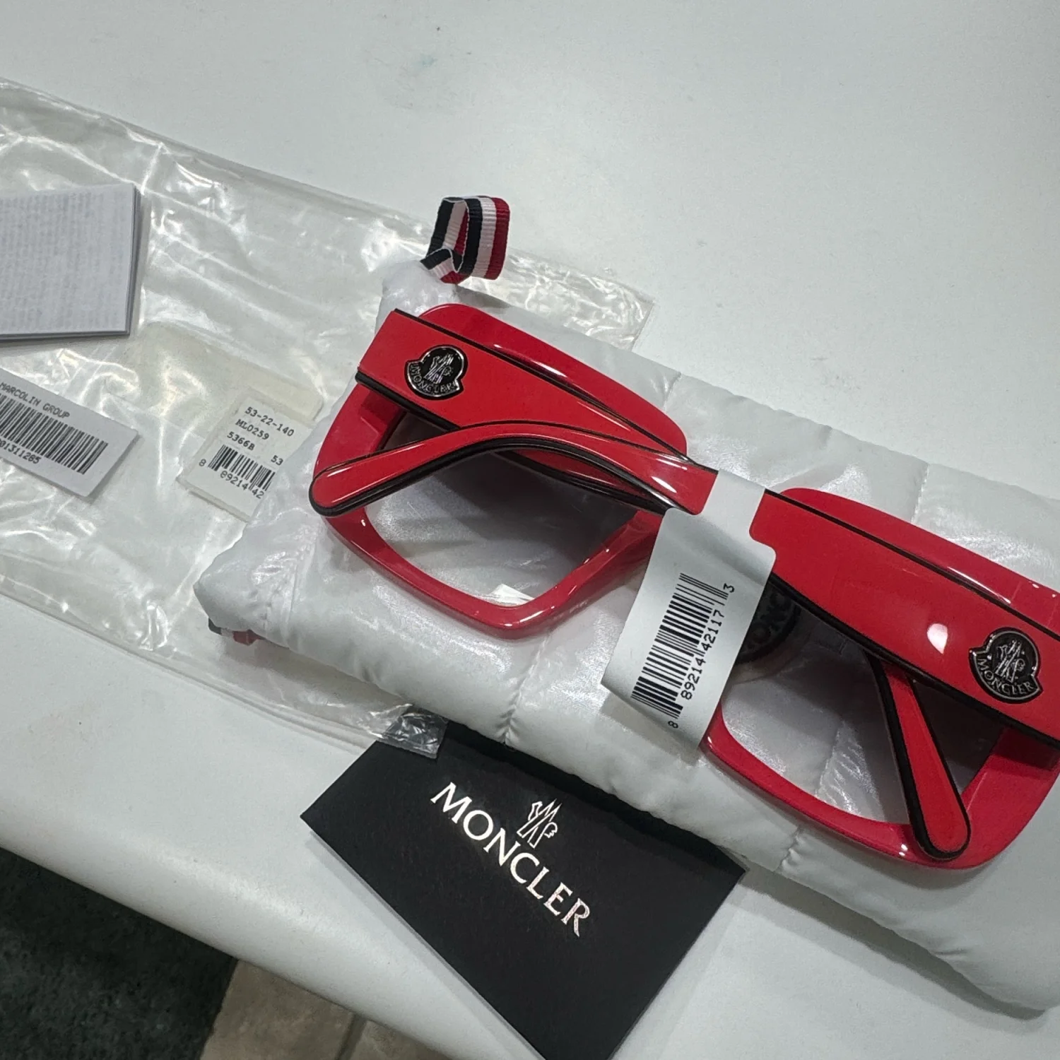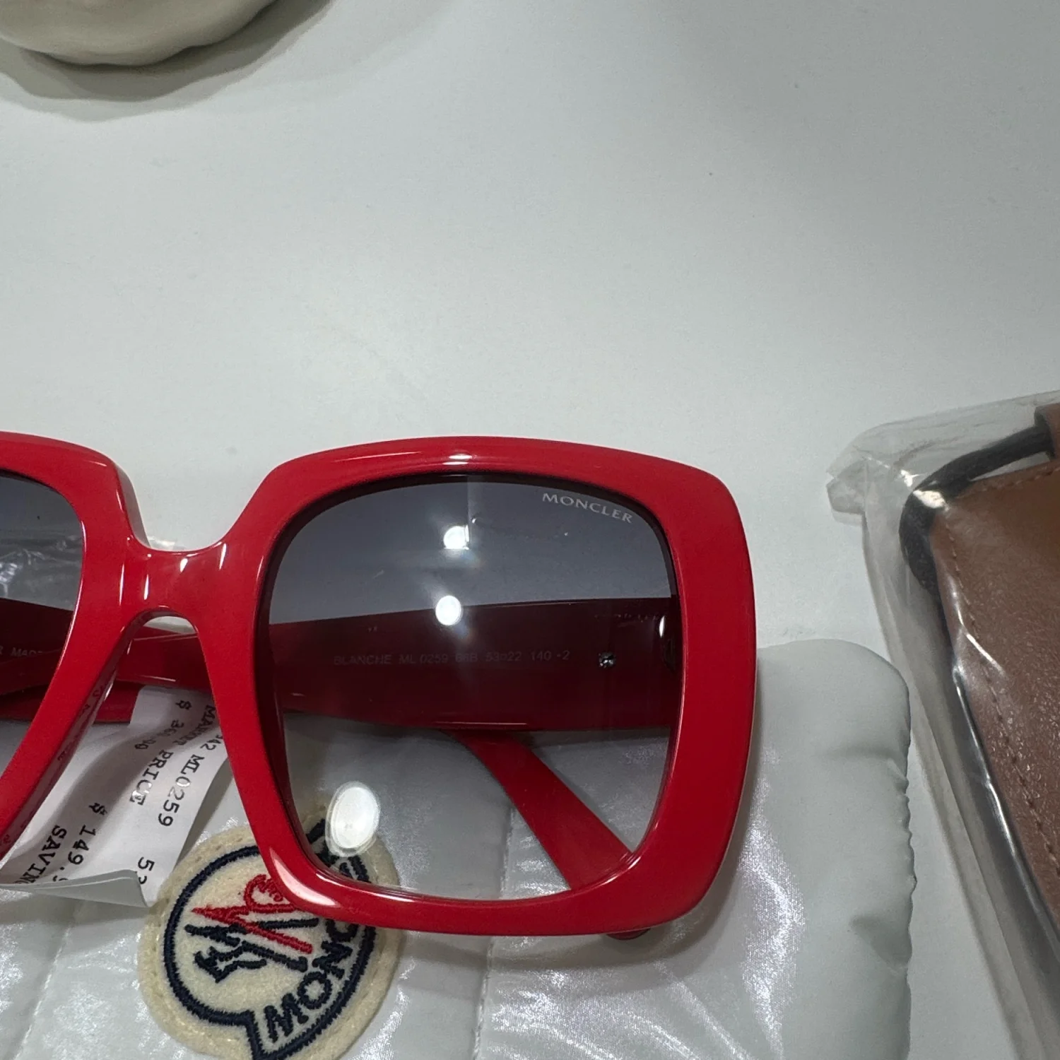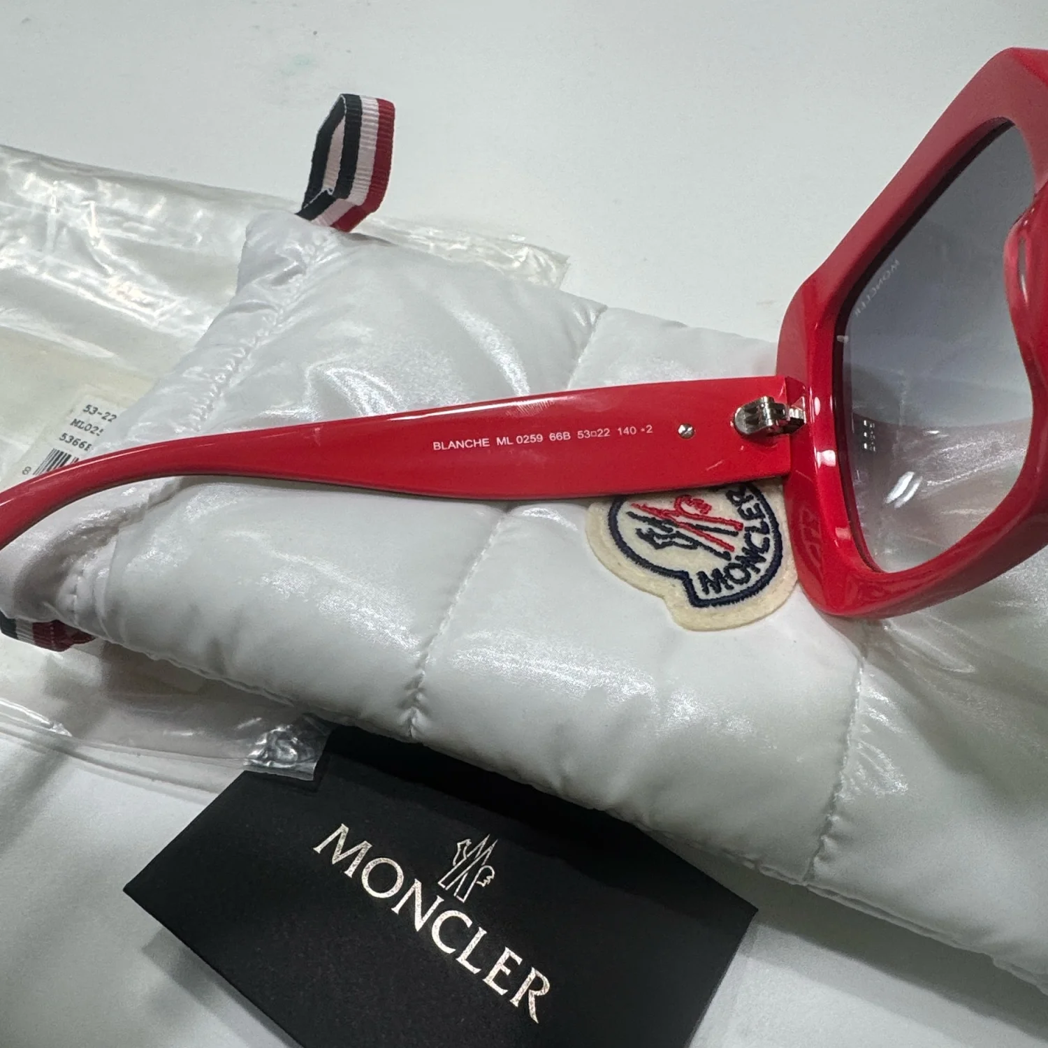 Bold and stylish red square sunglasses by Moncler, featuring gradient lenses for a modern look. Perfect accessory for adding a pop of color to any outfit. Comes with a protective logo pouch and an authenticity card. Ideal for sunny days and fashion-forward individuals. #Moncler #Sunglasses #Red #Fashion