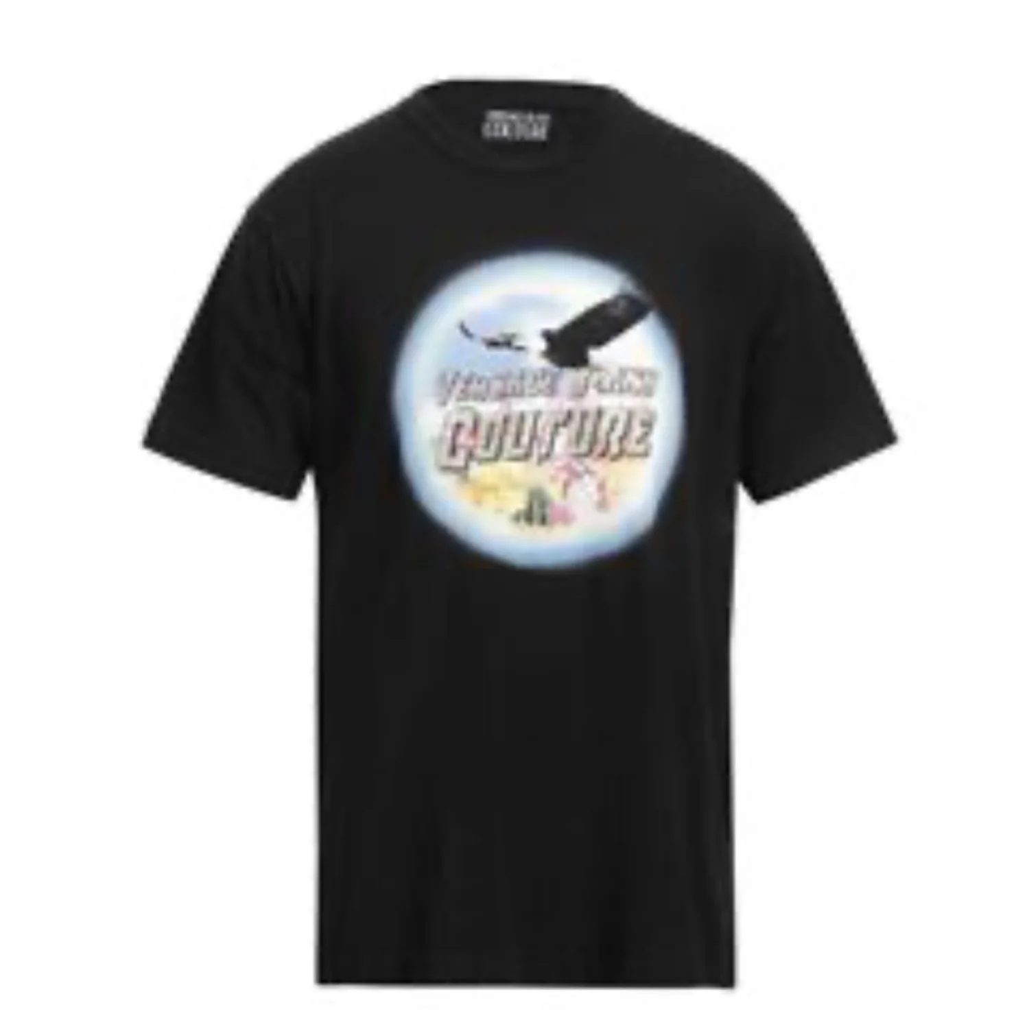 This Versace Jeans Couture T-shirt features a bold circular graphic design with an eagle and floral elements. The shirt is black and crafted from high-quality fabric, showcasing the distinctive Versace logo on the front. Perfect for casual wear and making a stylish statement. Tags: #Versace #BlackTee #GraphicTee