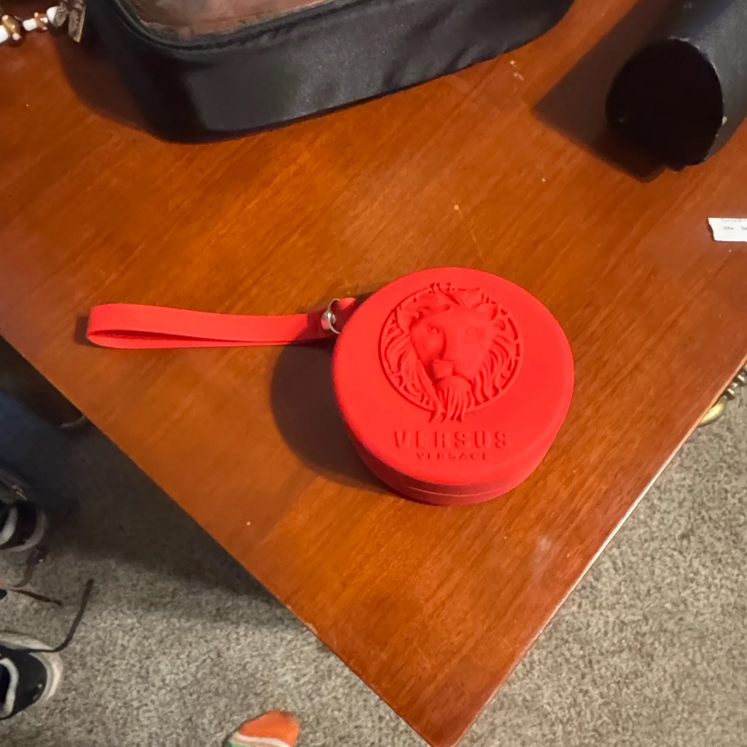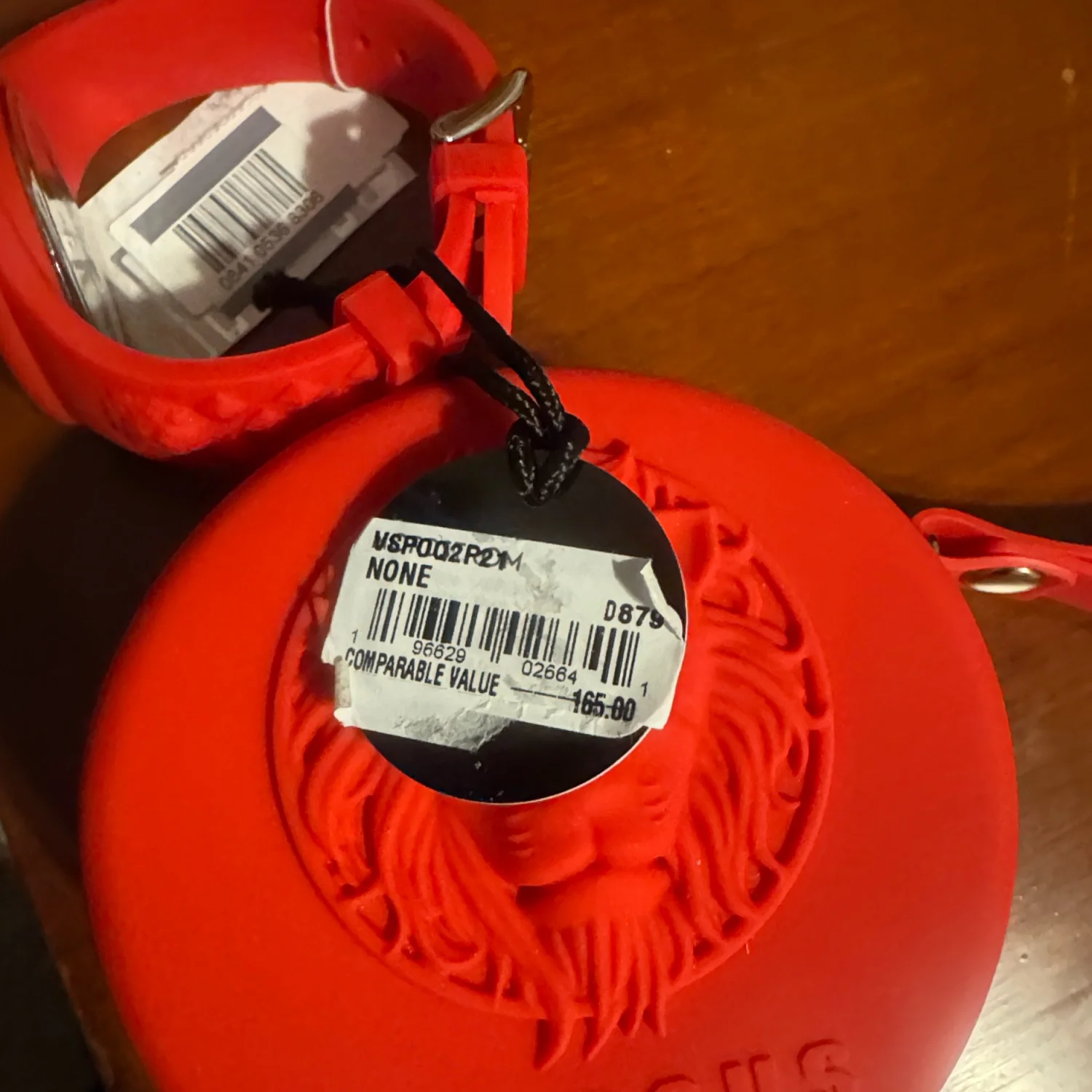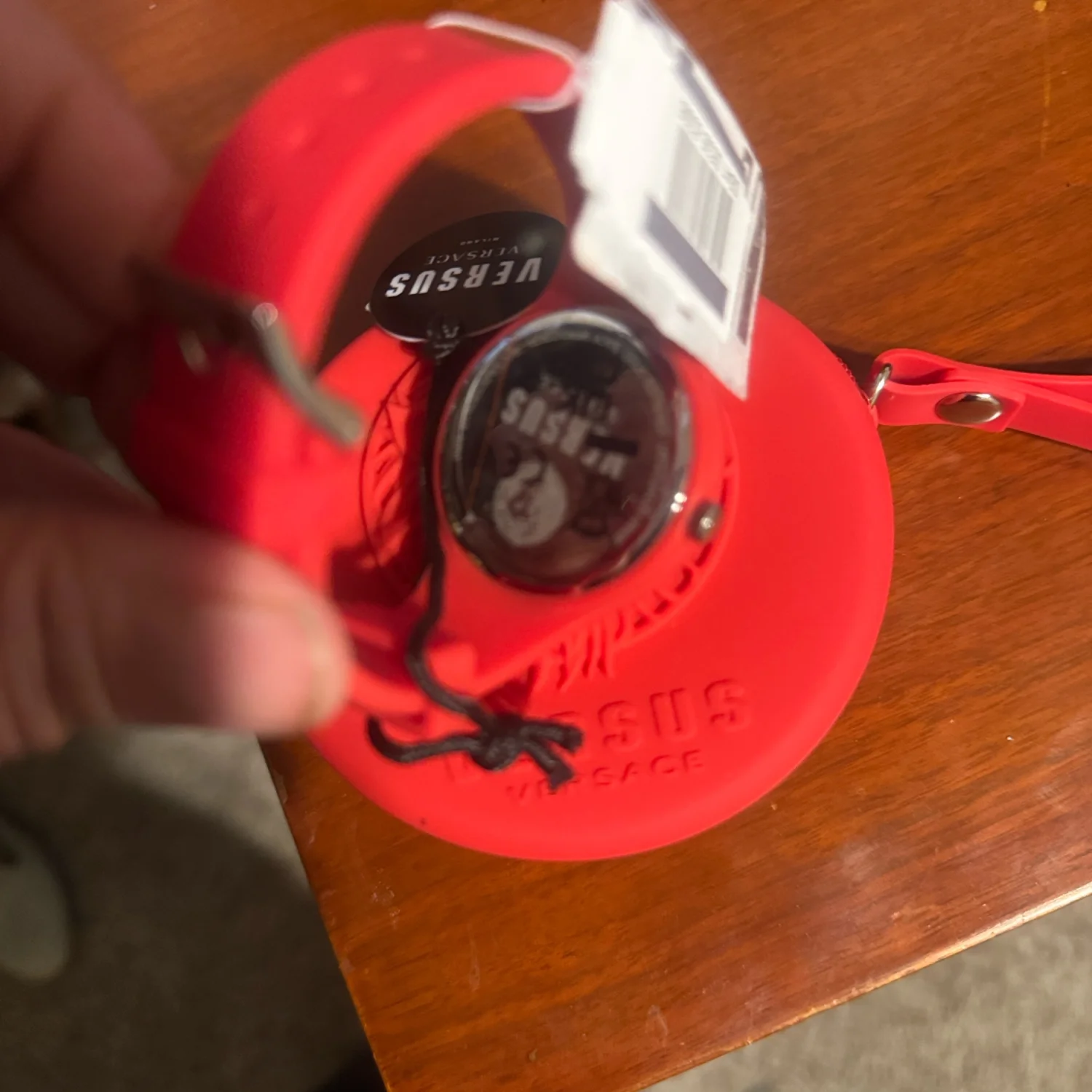 Versus Versace women's watch featuring a bold red silicone strap and a round face with red and silver accents. The watch comes with a beautifully designed red case embossed with the Versus lion logo. This stylish accessory is perfect for adding a vibrant touch to any outfit. Includes original tags and packaging. #Versus #Versace #FashionWatch
