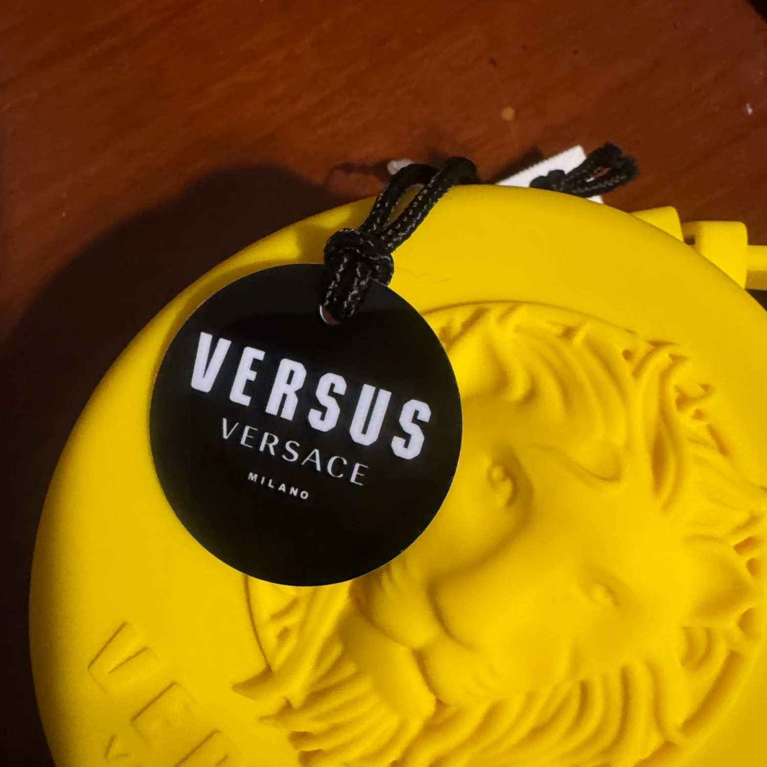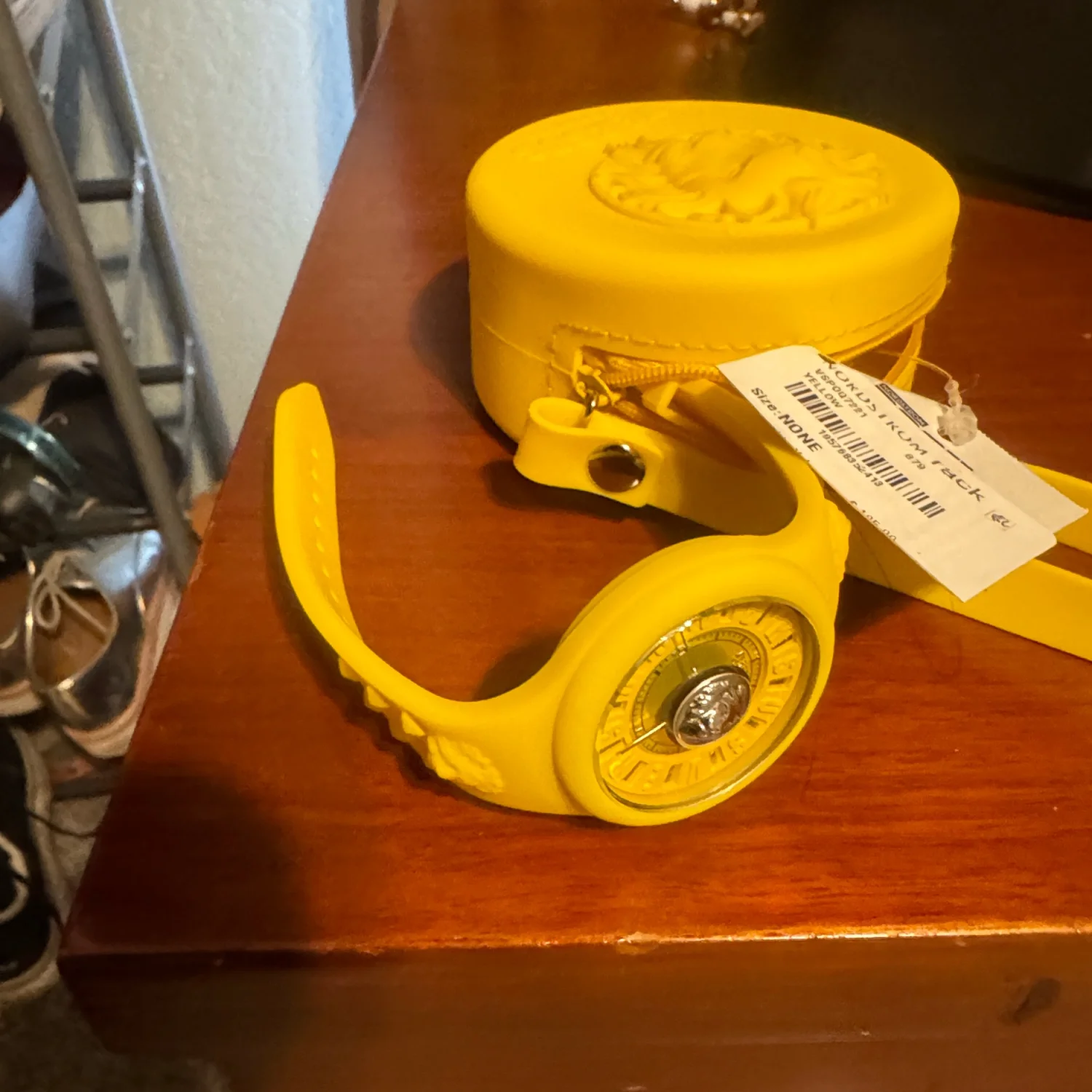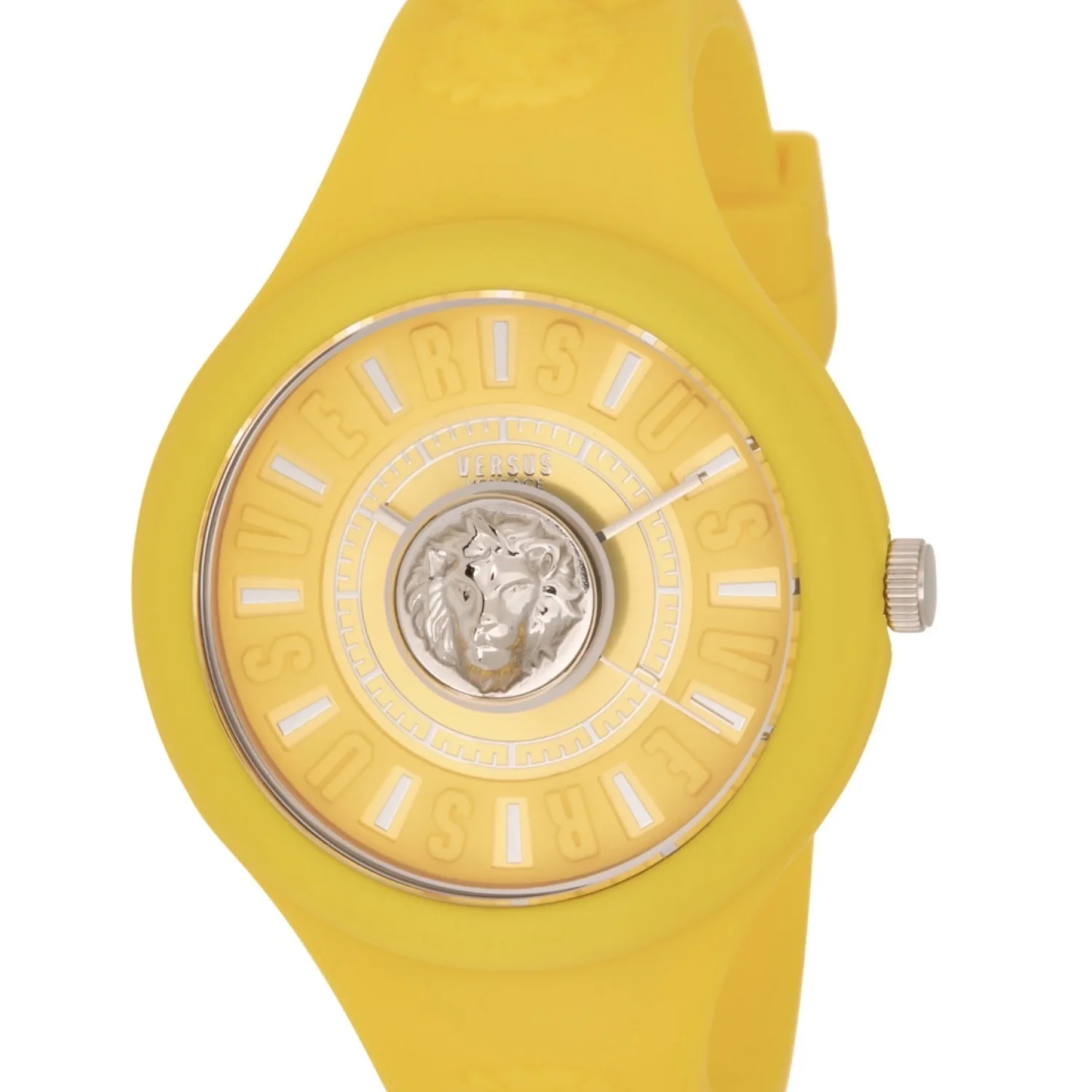 This vibrant yellow watch by Versus Versace features a bold rubber strap and case, adorned with a signature lion head emblem on the dial and the case. The watch comes in a matching yellow carrying case stamped with the Versus logo. It includes a metal buckle for secure closure and is ideal for making a striking fashion statement. Perfect for casual wear. #VersusVersace #YellowWatch #Fashion