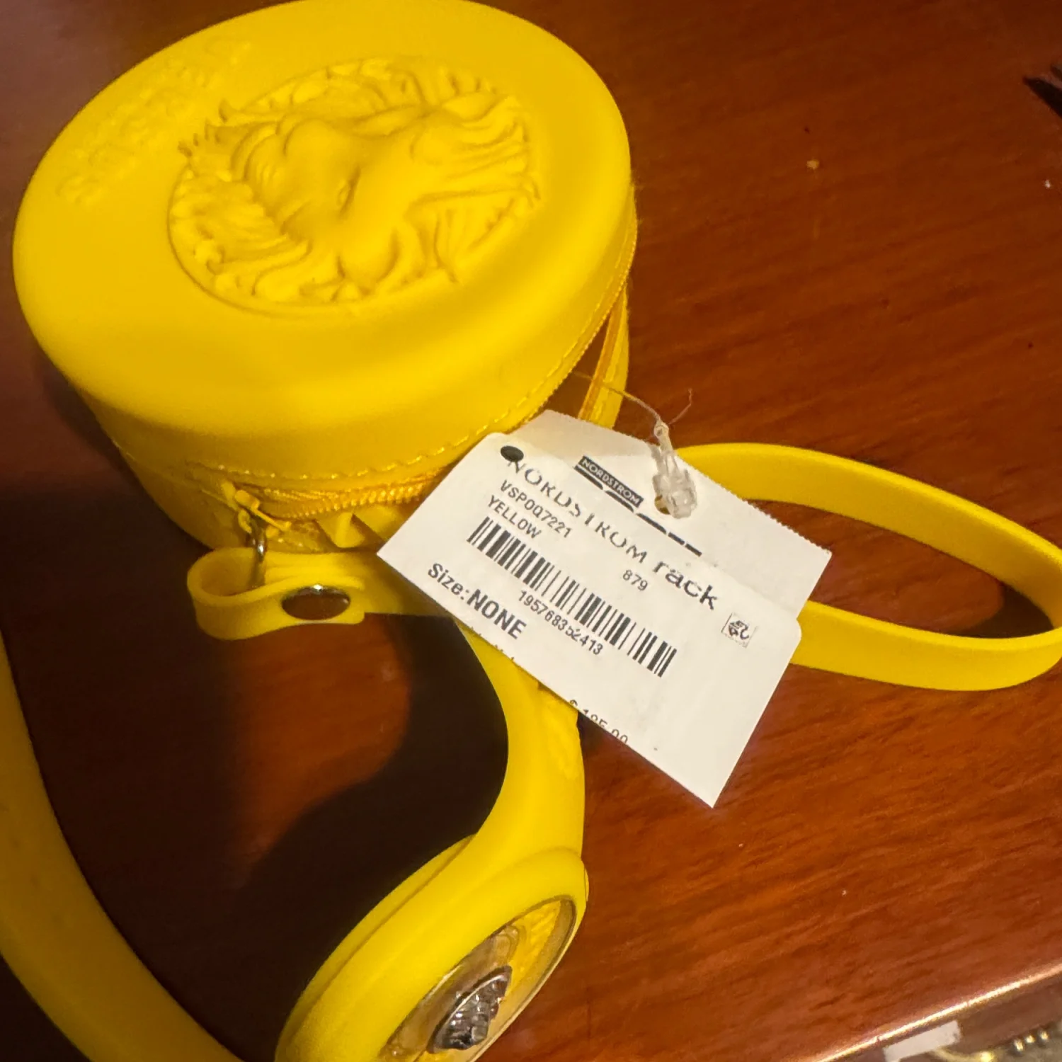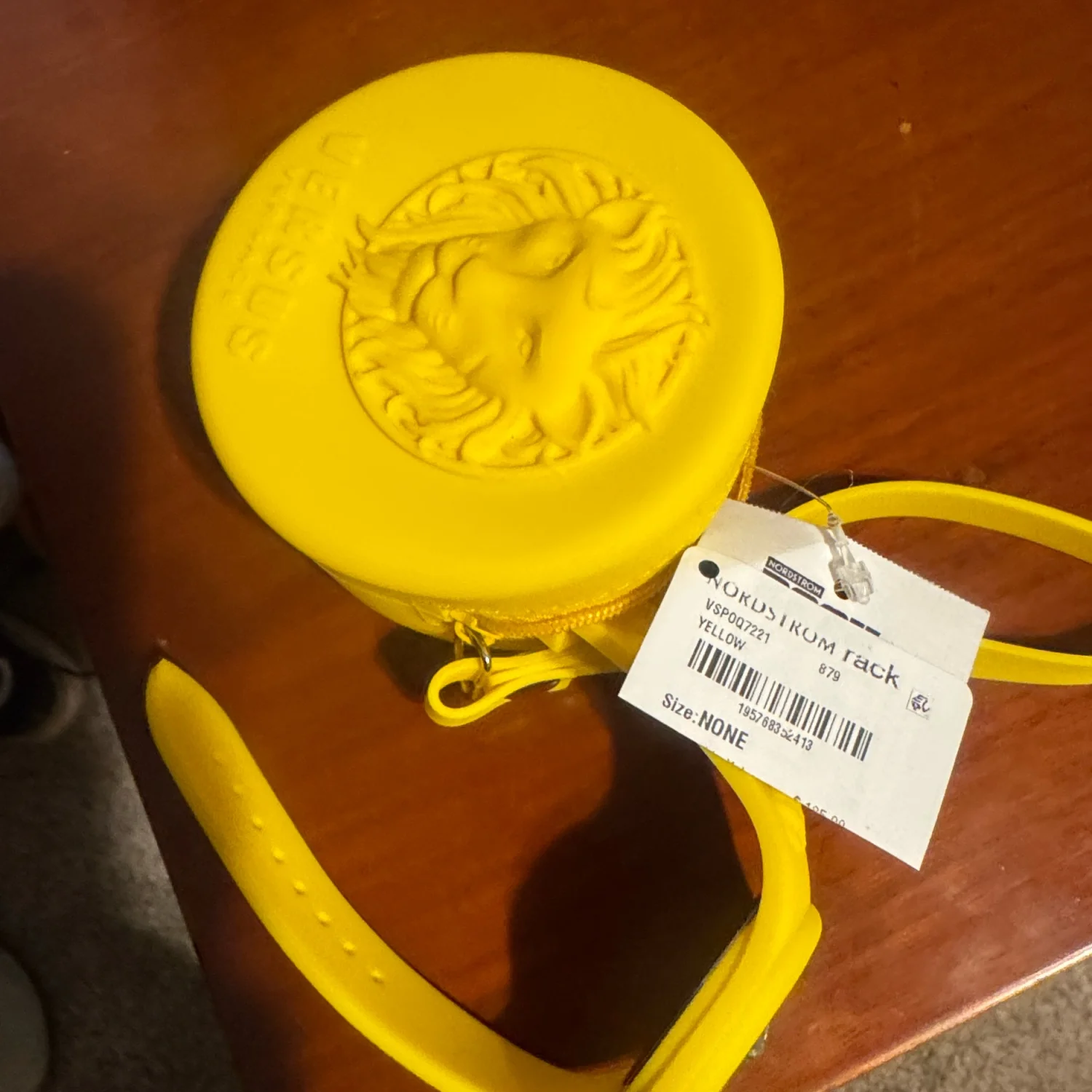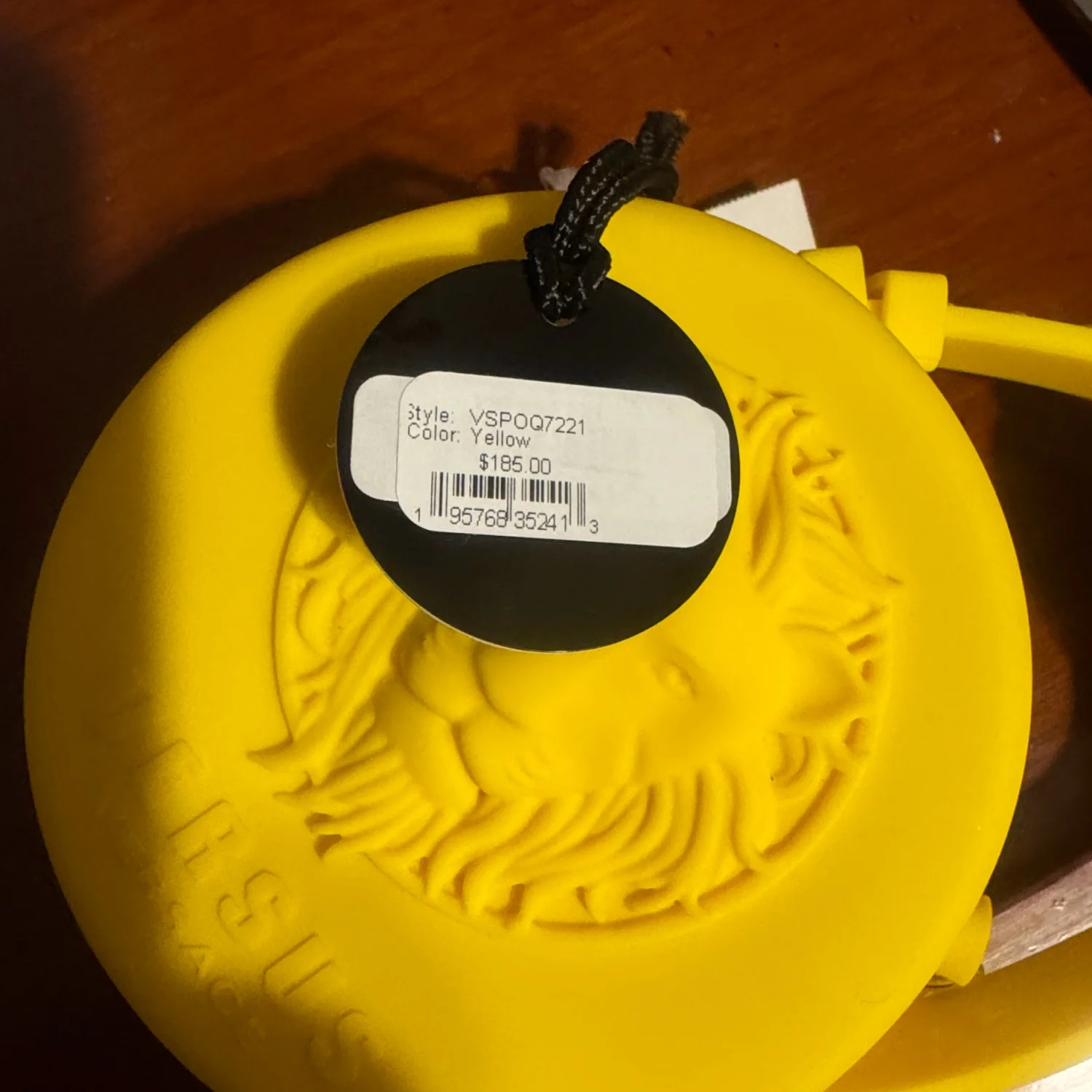 This vibrant yellow watch by Versus Versace features a bold rubber strap and case, adorned with a signature lion head emblem on the dial and the case. The watch comes in a matching yellow carrying case stamped with the Versus logo. It includes a metal buckle for secure closure and is ideal for making a striking fashion statement. Perfect for casual wear. #VersusVersace #YellowWatch #Fashion