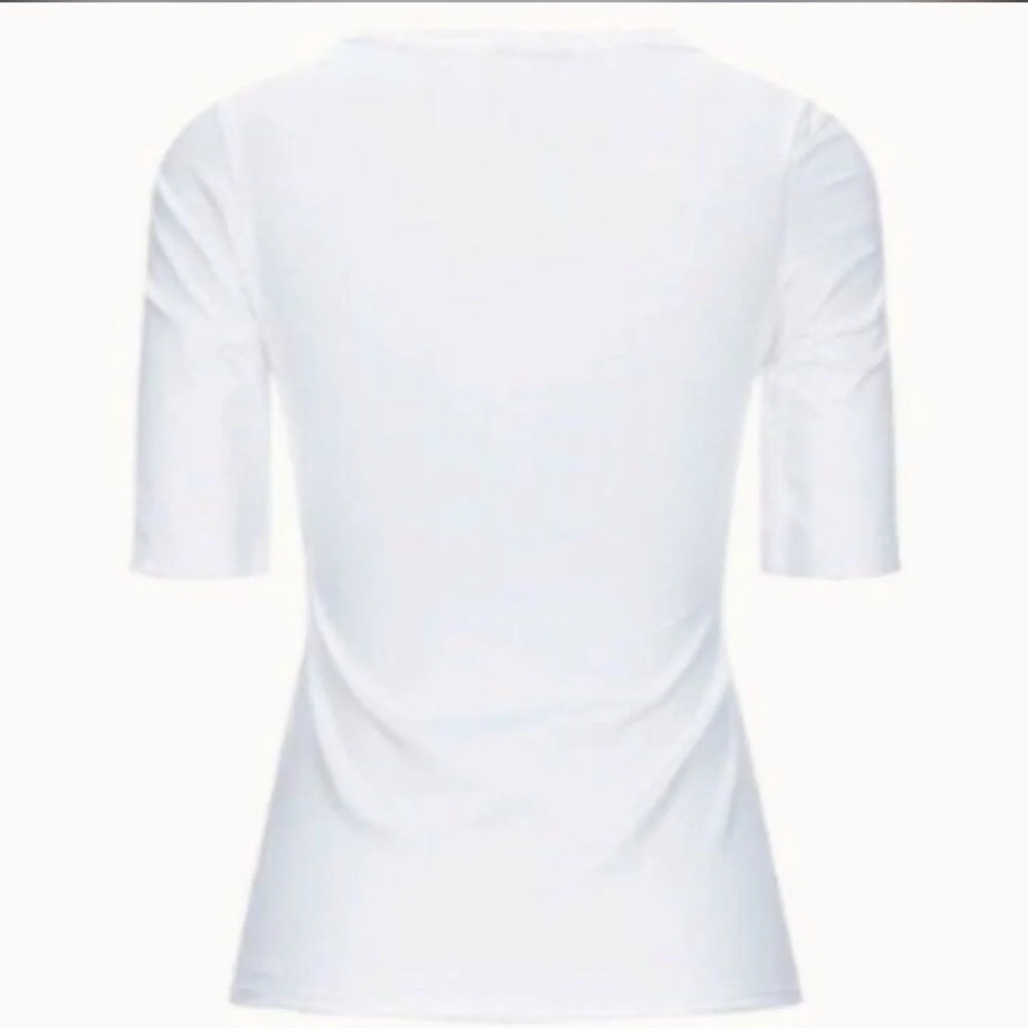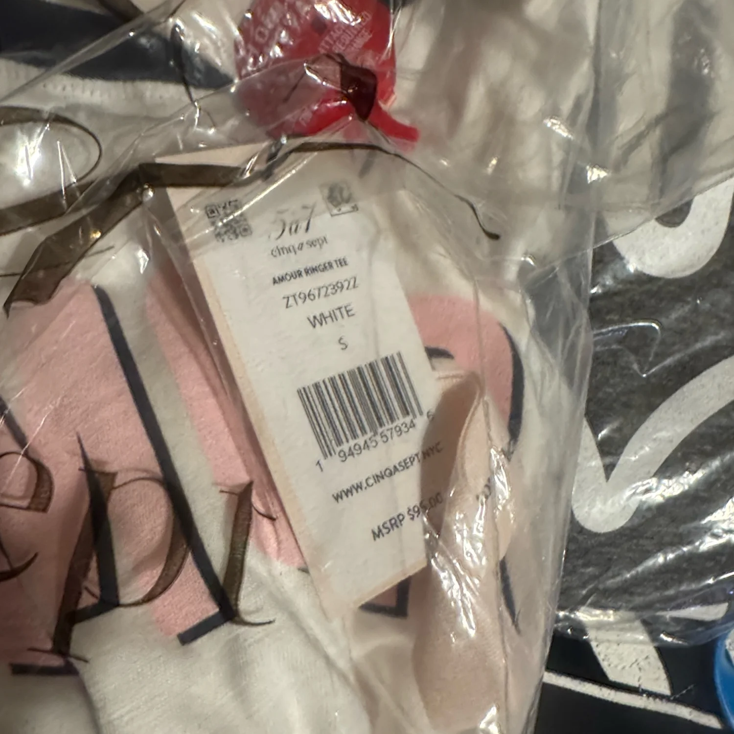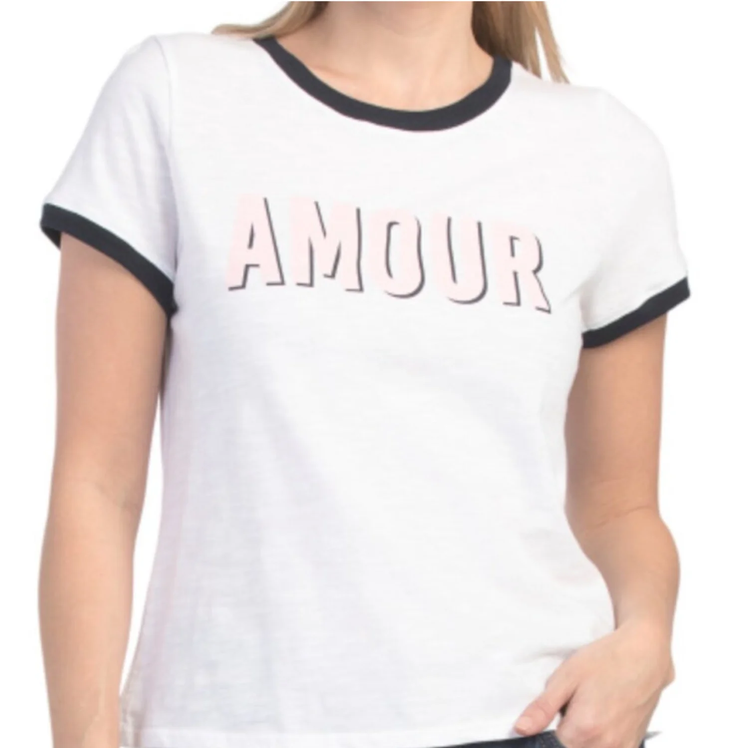 This chic white t-shirt features a modern graphic print with the word 'Amour' on the front. It has stylish black trim on the neckline and sleeves, giving it a fashionable contrast. Made from a comfortable fabric blend, it's perfect for casual wear. #casual #graphictee #monochrome