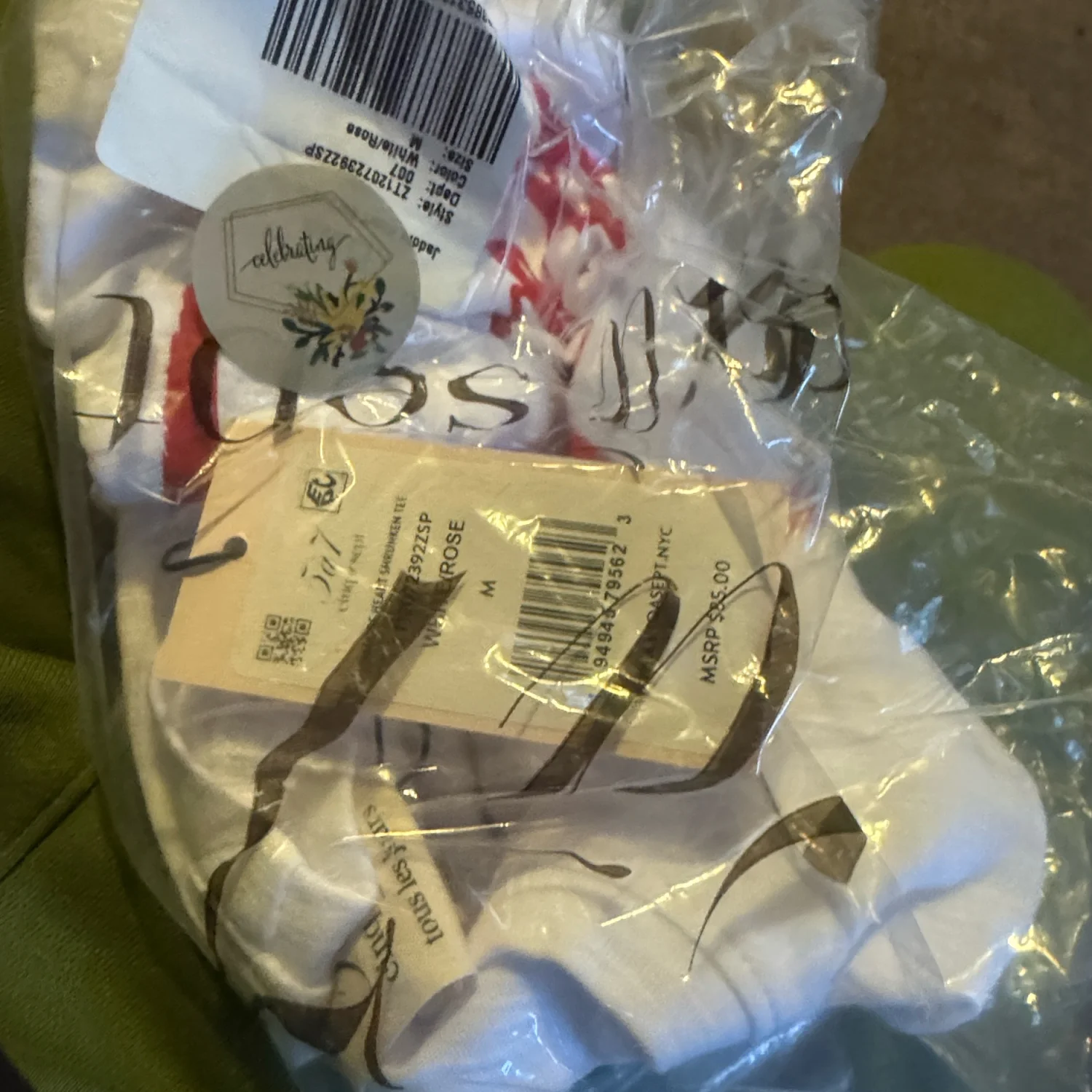 This white t-shirt features a stylish red heart design with the word 'J'adore' in a script font on the front. It's perfect for a casual, laid-back look. Made from a soft and breathable fabric, this tee is comfortable for everyday wear. Brand new and packaged for sale. Tags: #graphictee #casual #j'adore