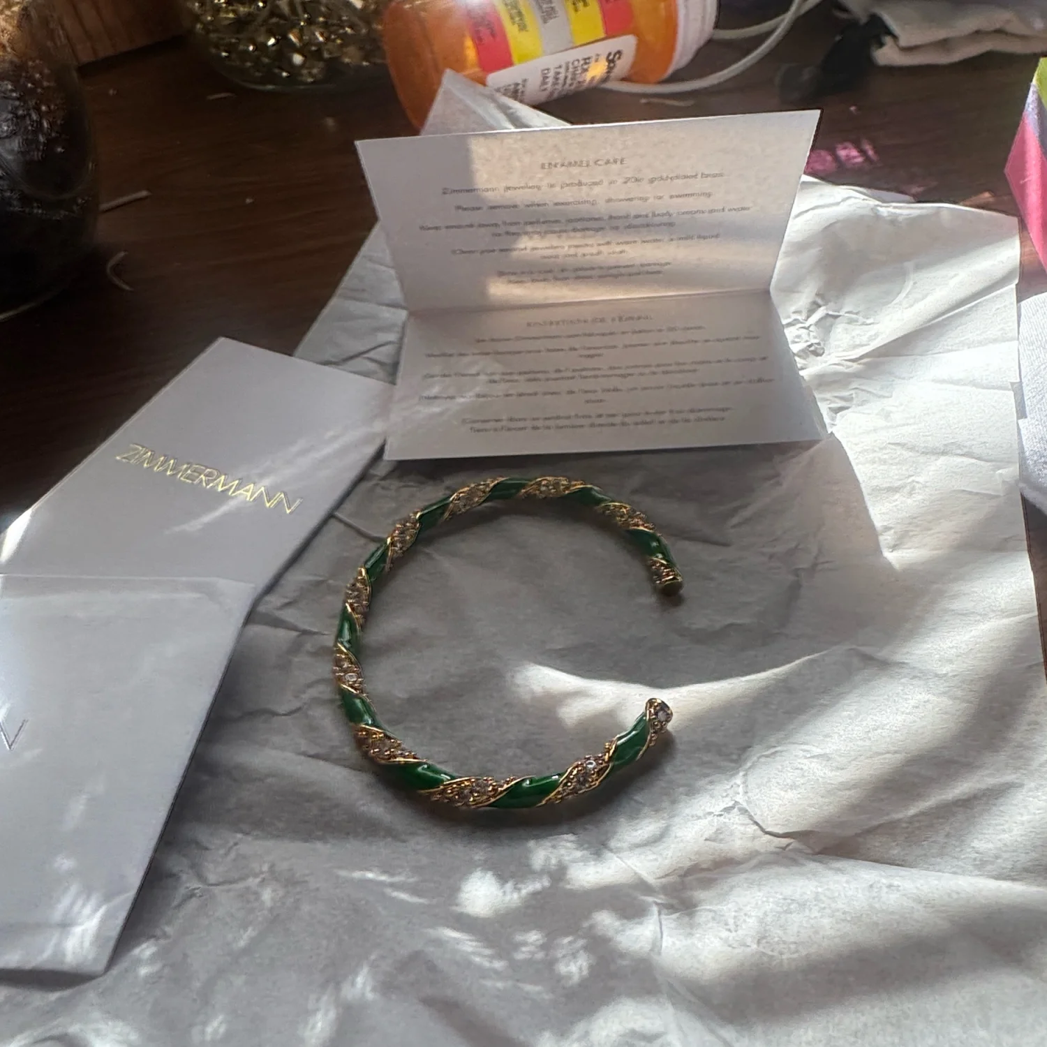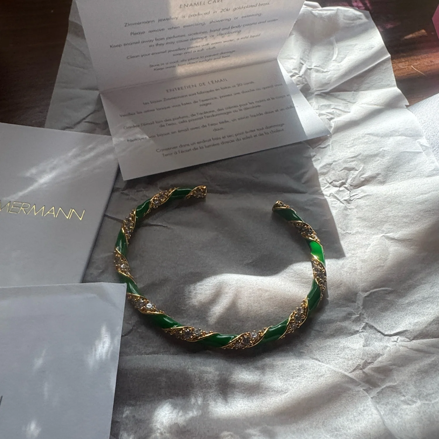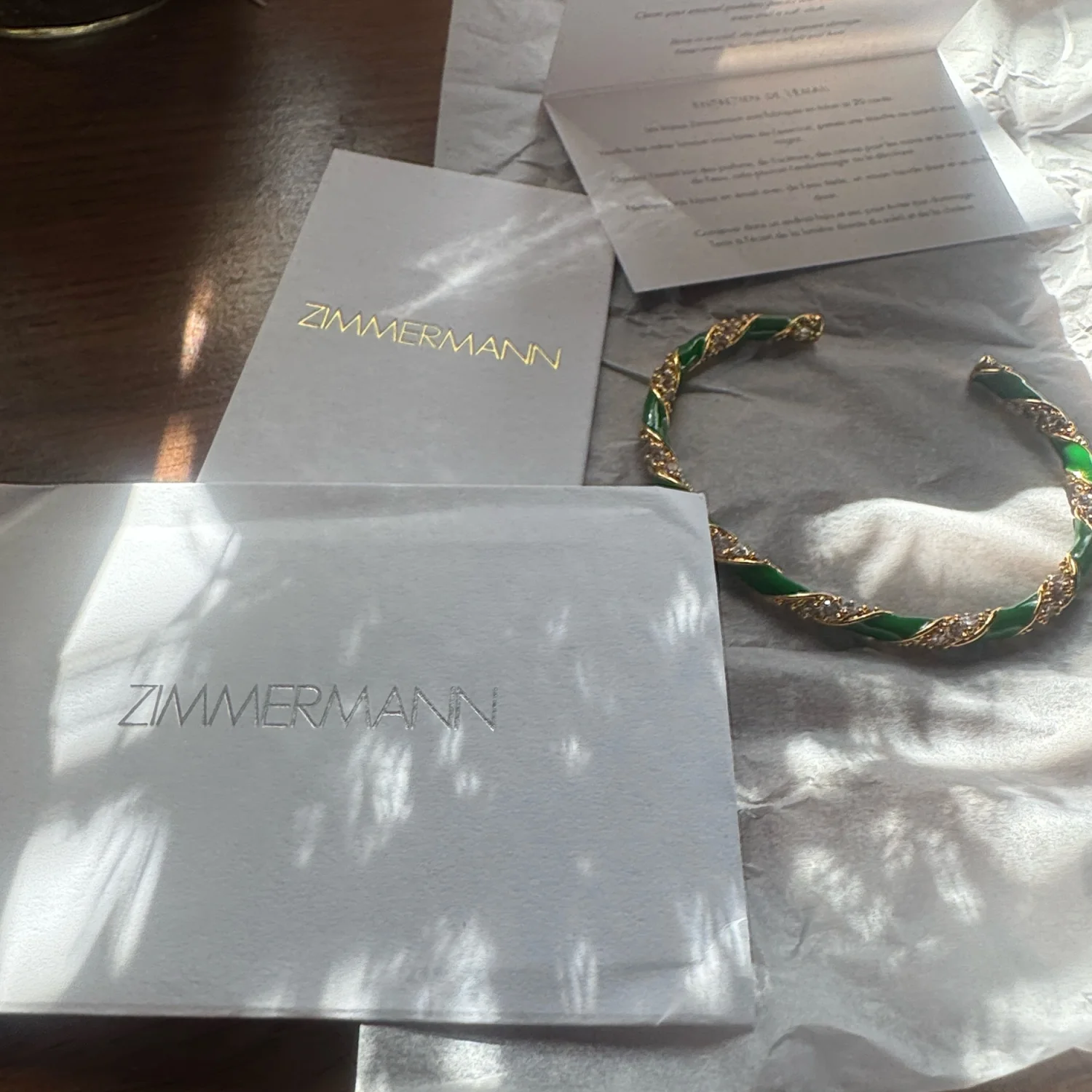 This elegant bangle from Zimmermann features a striking twisted design with vibrant green and gold tones. Crafted to offer a sophisticated finish to your outfit, this piece is perfect for both casual and formal wear. Made from high-quality materials for lasting durability and charm. #Zimmermann #Bangle #Jewelry