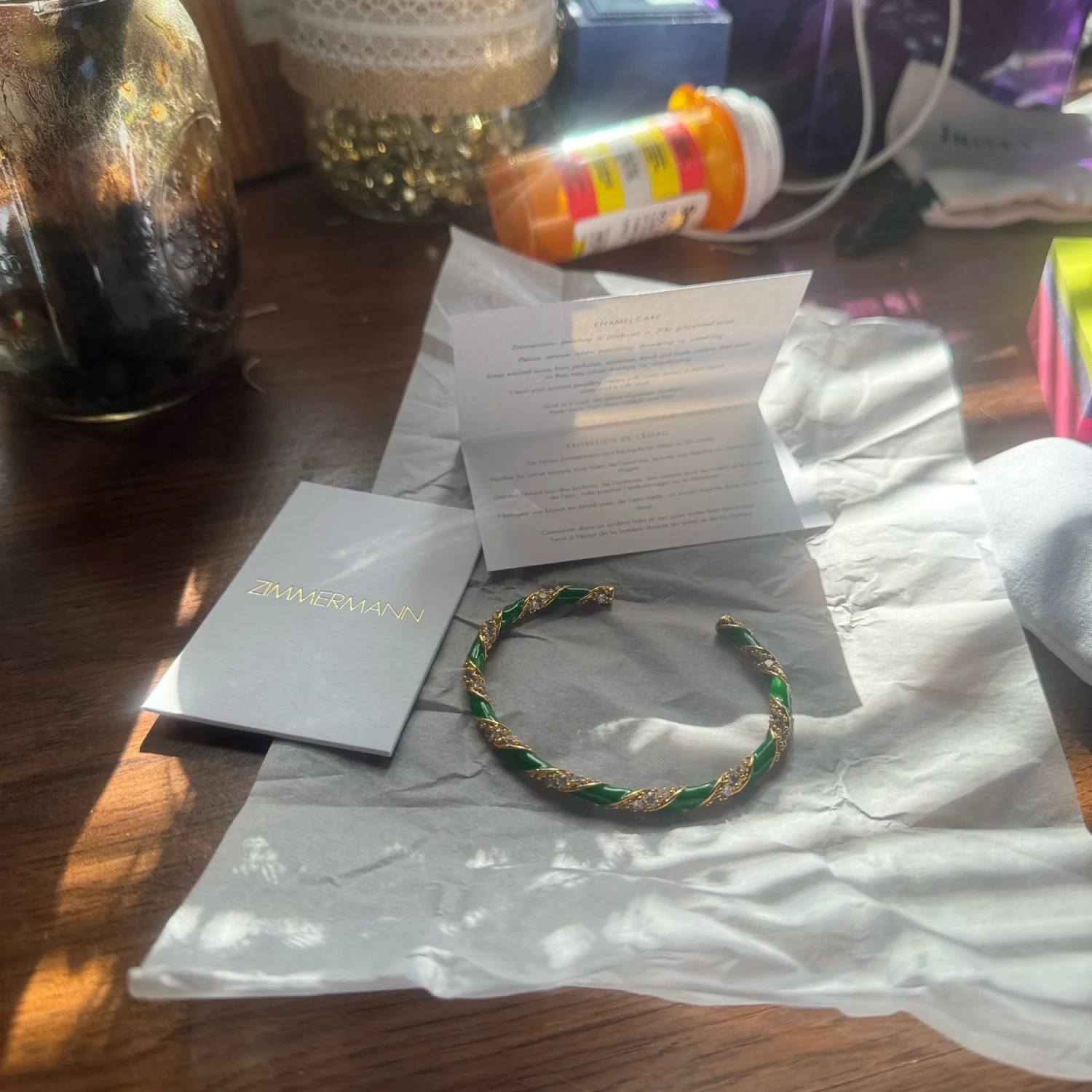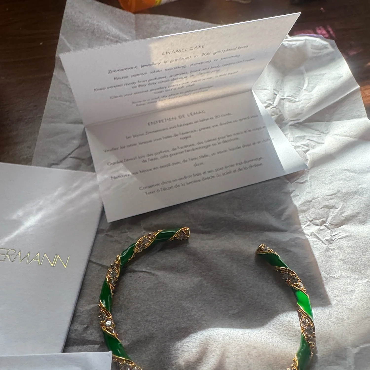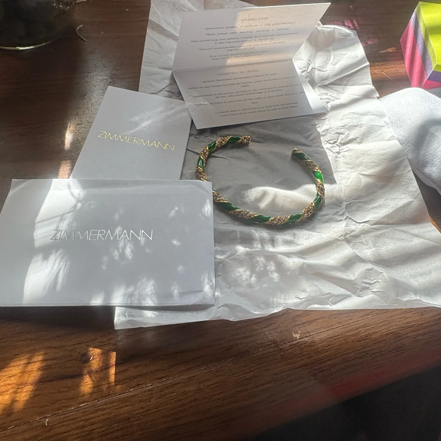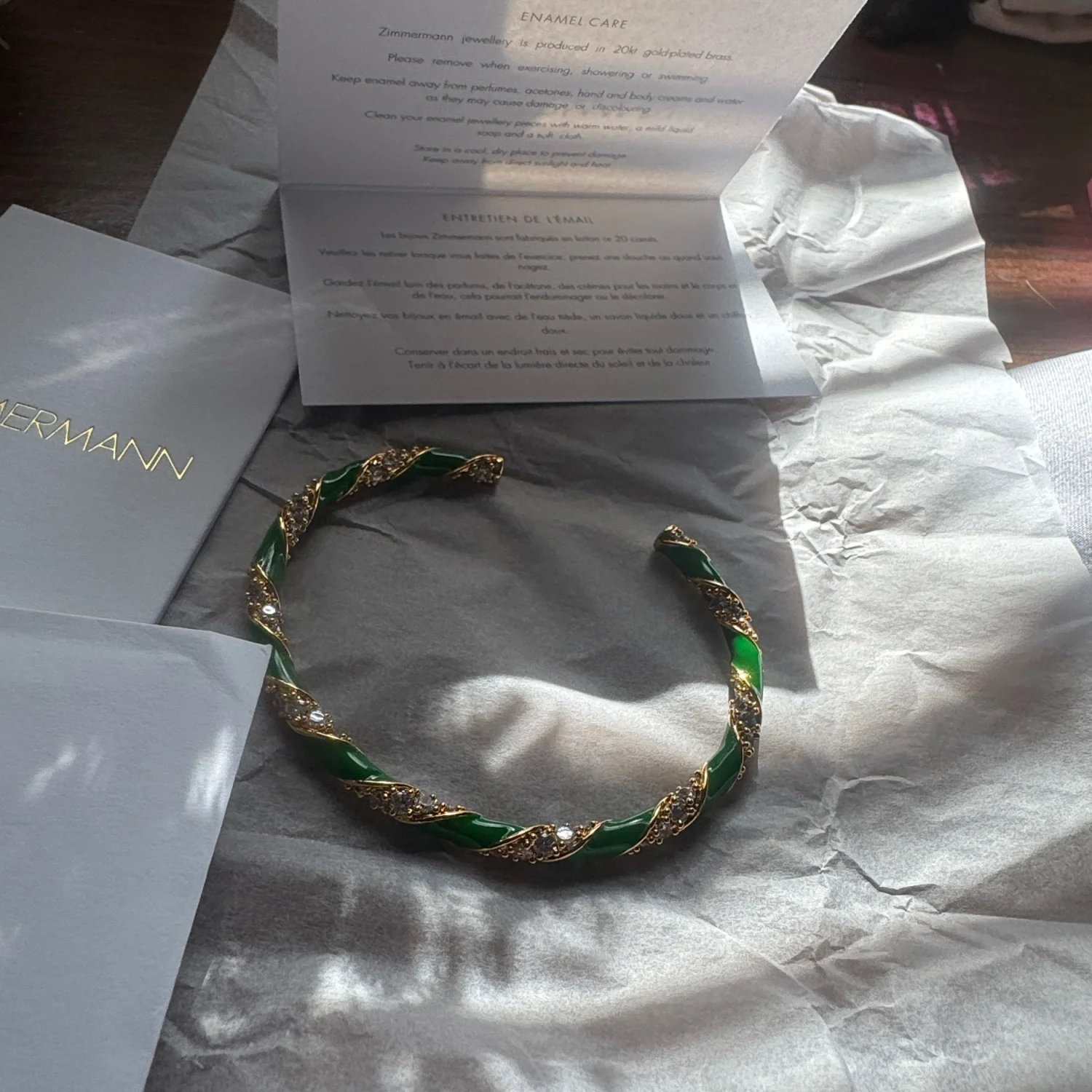 This elegant bangle from Zimmermann features a striking twisted design with vibrant green and gold tones. Crafted to offer a sophisticated finish to your outfit, this piece is perfect for both casual and formal wear. Made from high-quality materials for lasting durability and charm. #Zimmermann #Bangle #Jewelry
