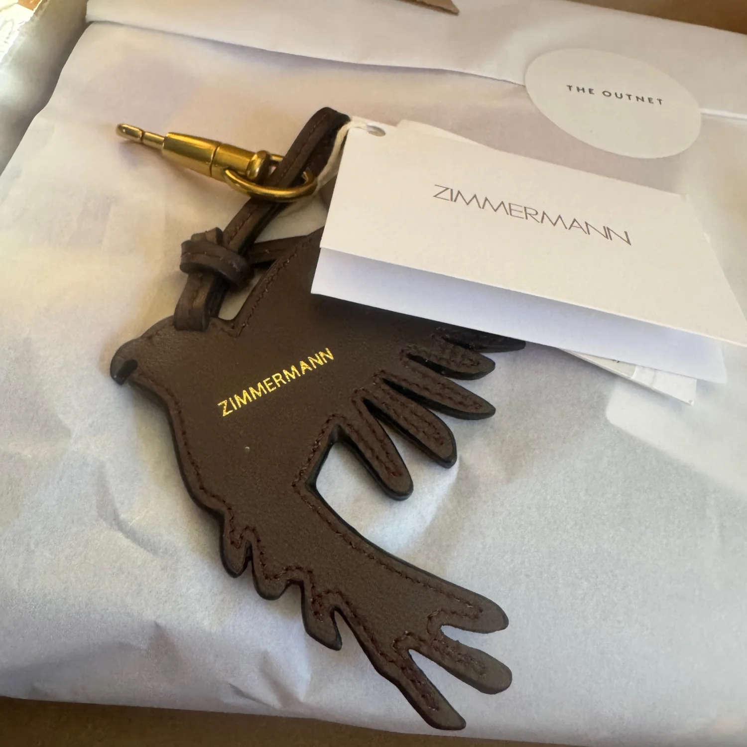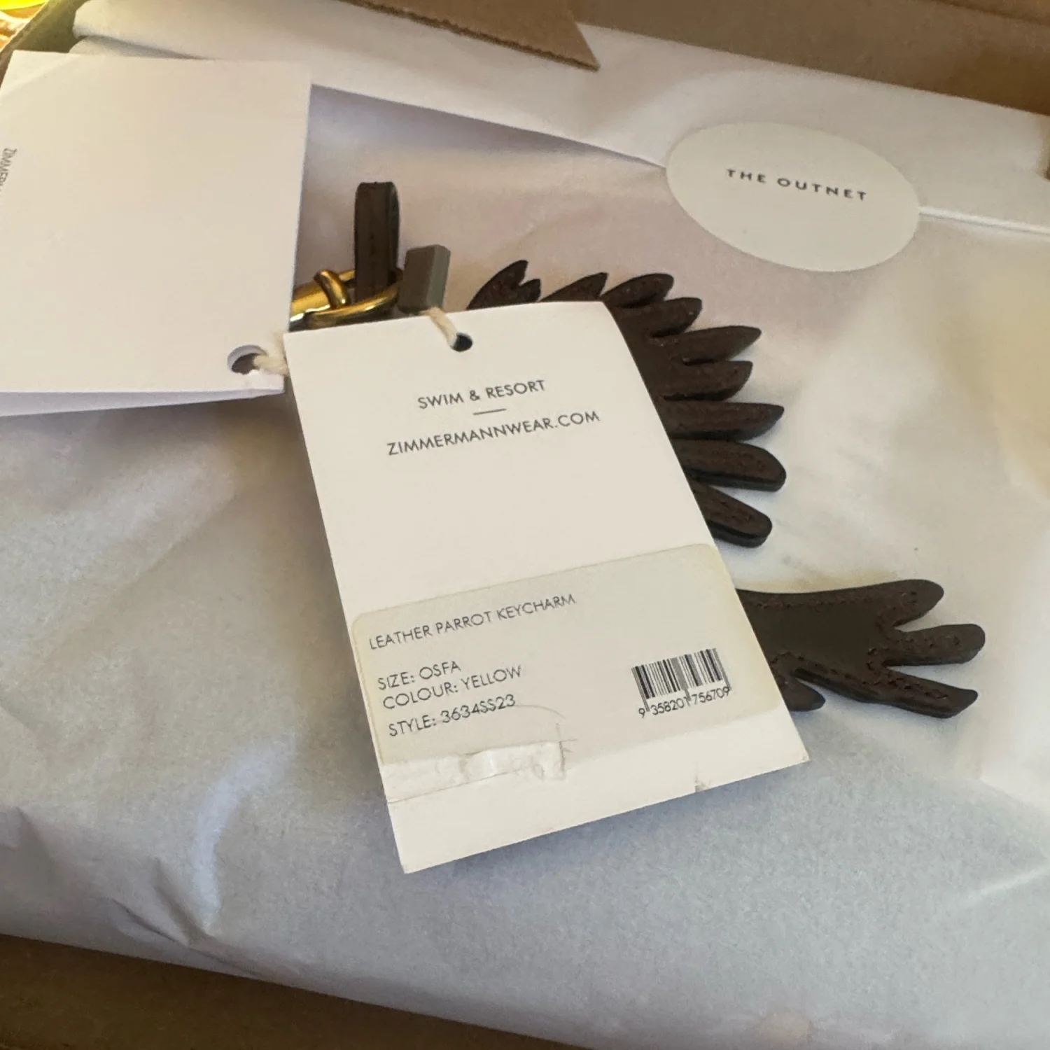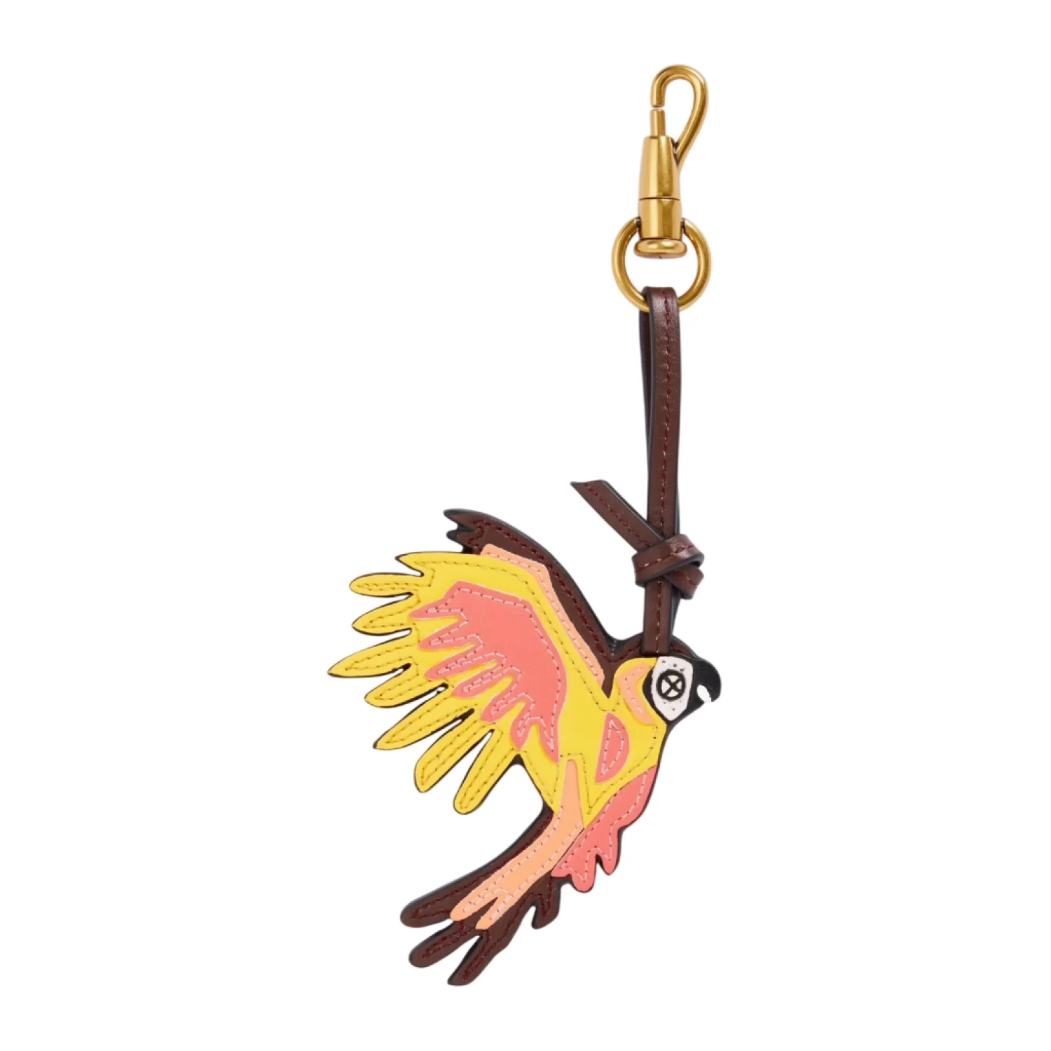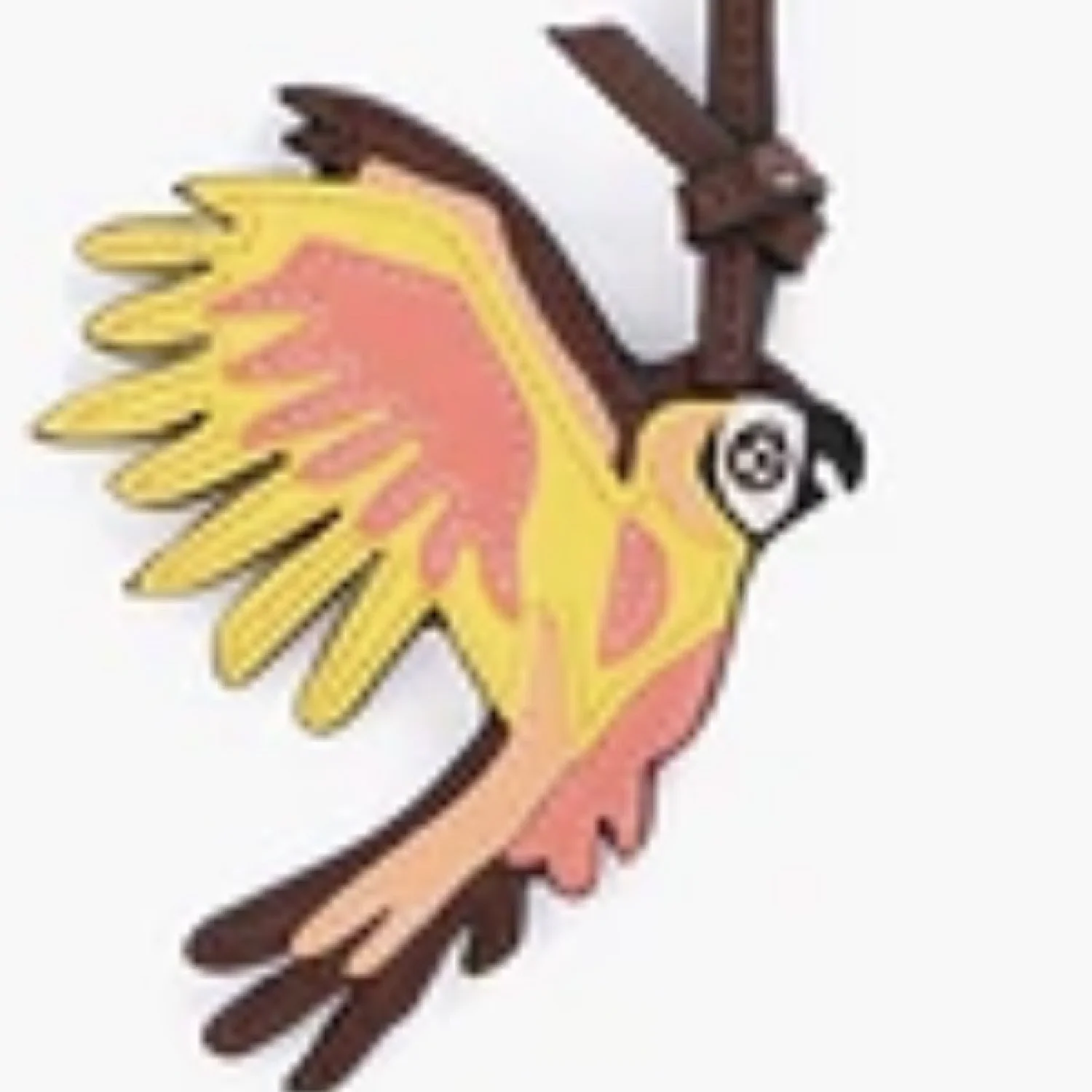 This Zimmermann leather keychain features a vibrant parrot design in shades of yellow, pink, and brown. Equipped with a gold-tone clasp, it's perfect for adding a playful touch to your keys or bag. The piece is crafted with attention to detail, ensuring high quality and durability. Ideal as a fun accessory or a gift. #Keychain #Leather #ParrotDesign