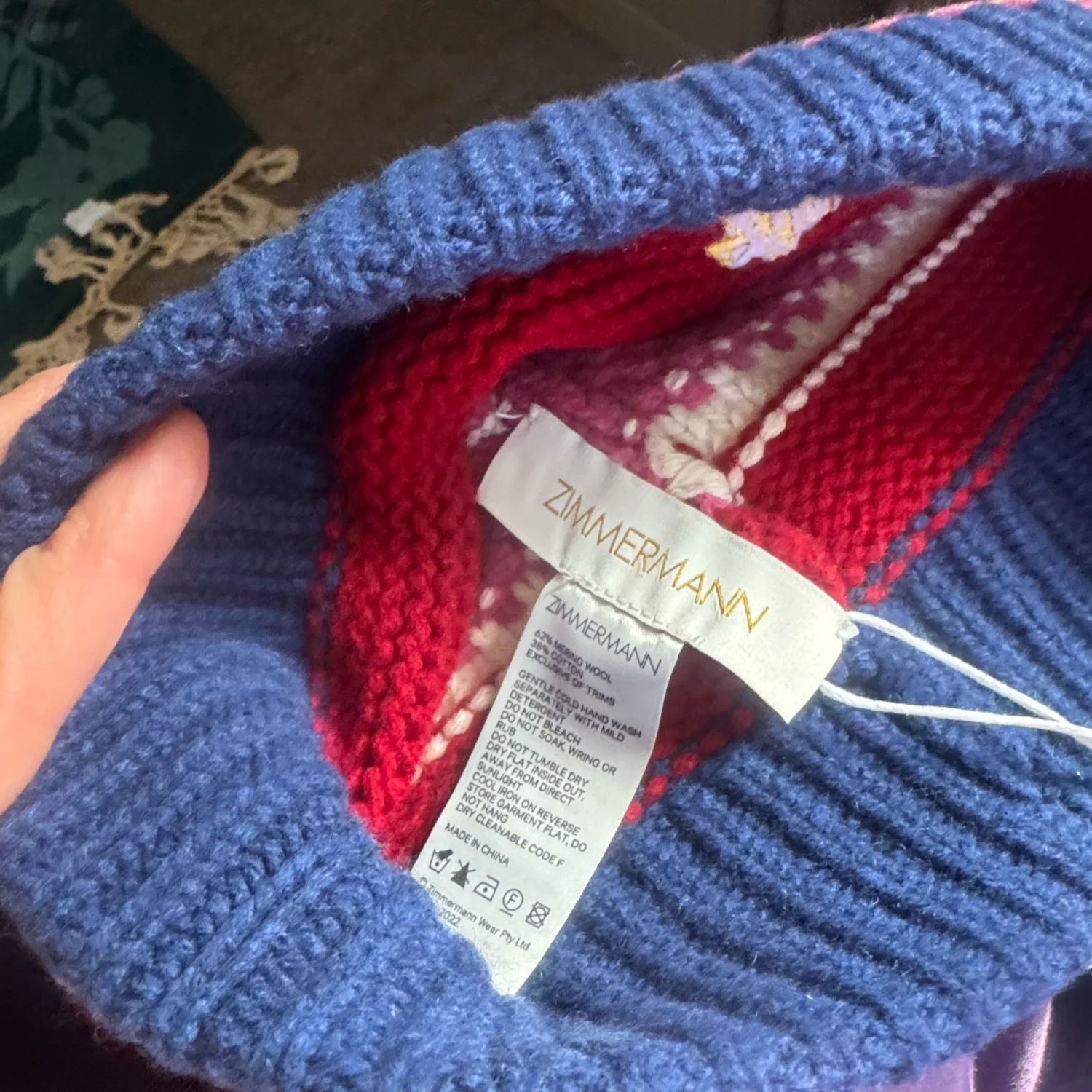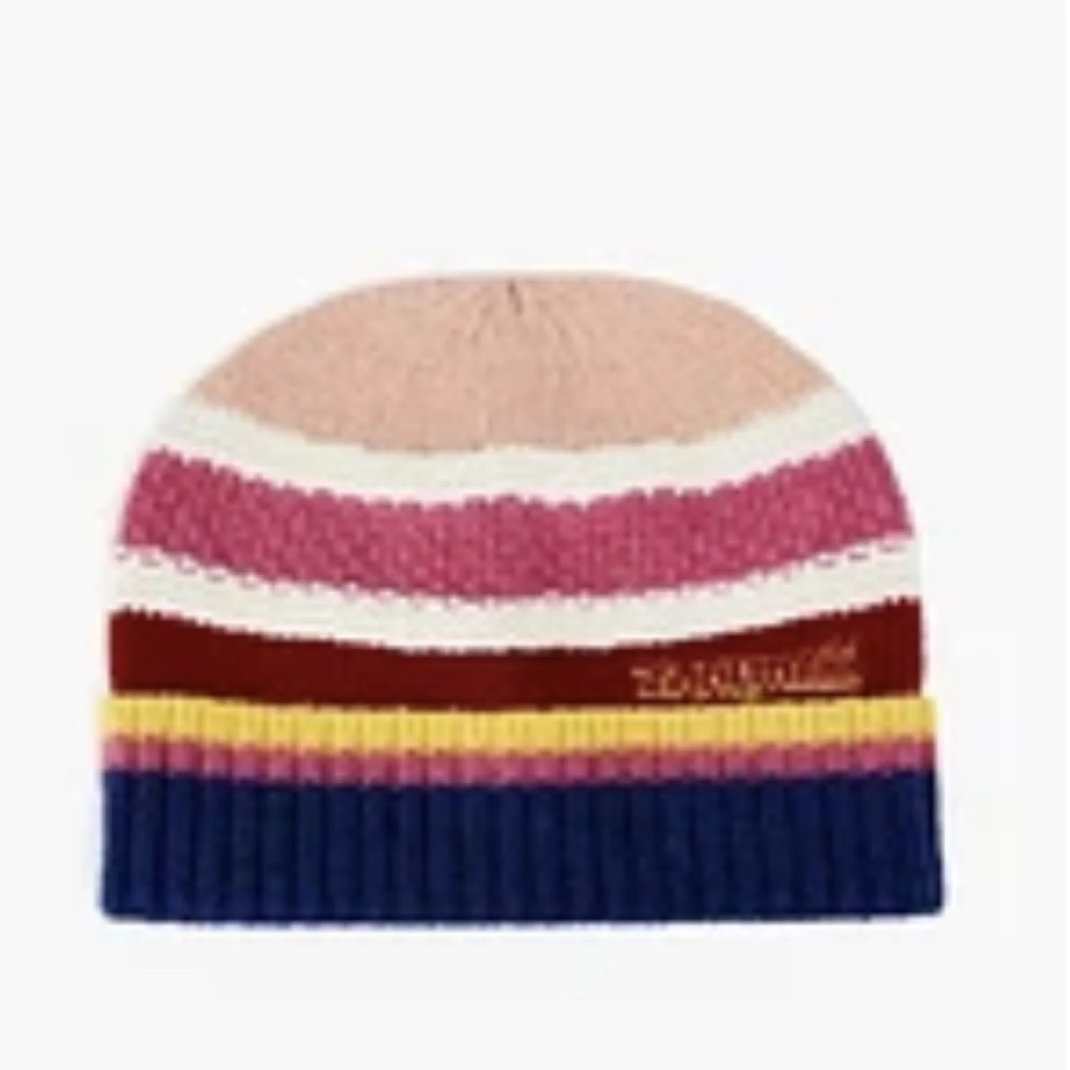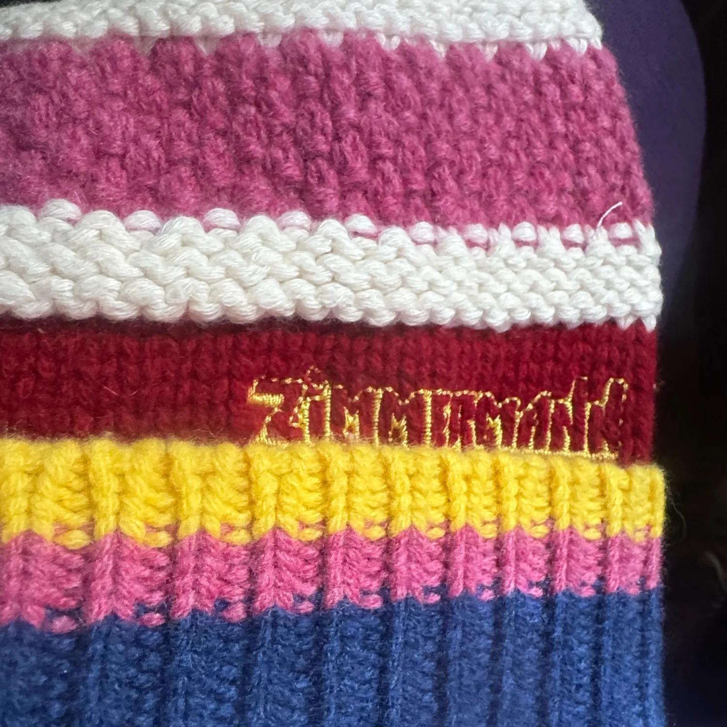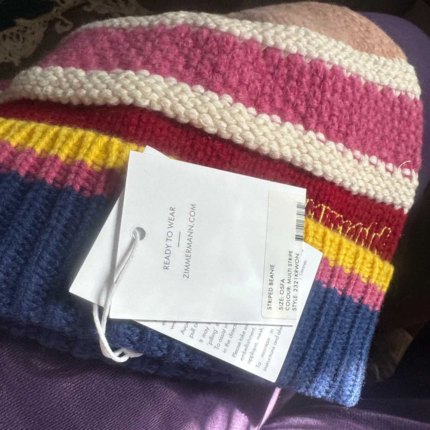 This stylish Zimmermann beanie features a vibrant stripe design in shades of pink, blue, red, yellow, and beige. Made from high-quality knit material, it offers both warmth and a fashion-forward look. The beanie comes with the original tags, indicating it is new. This is a perfect accessory for adding a pop of color to your winter wardrobe. #Zimmermann #Beanie #WinterFashion