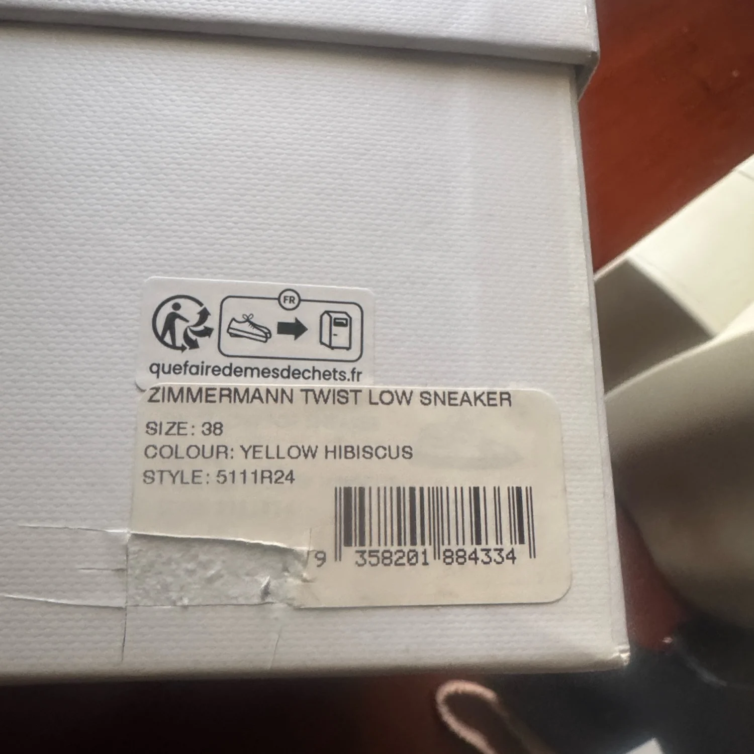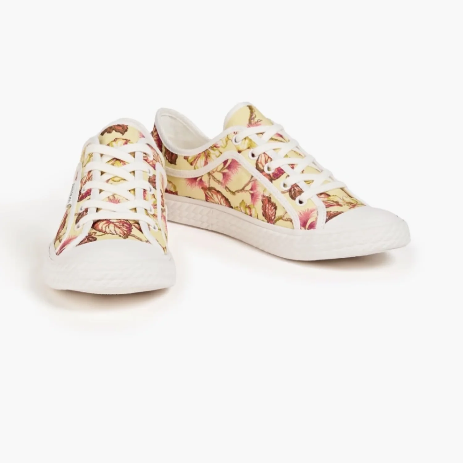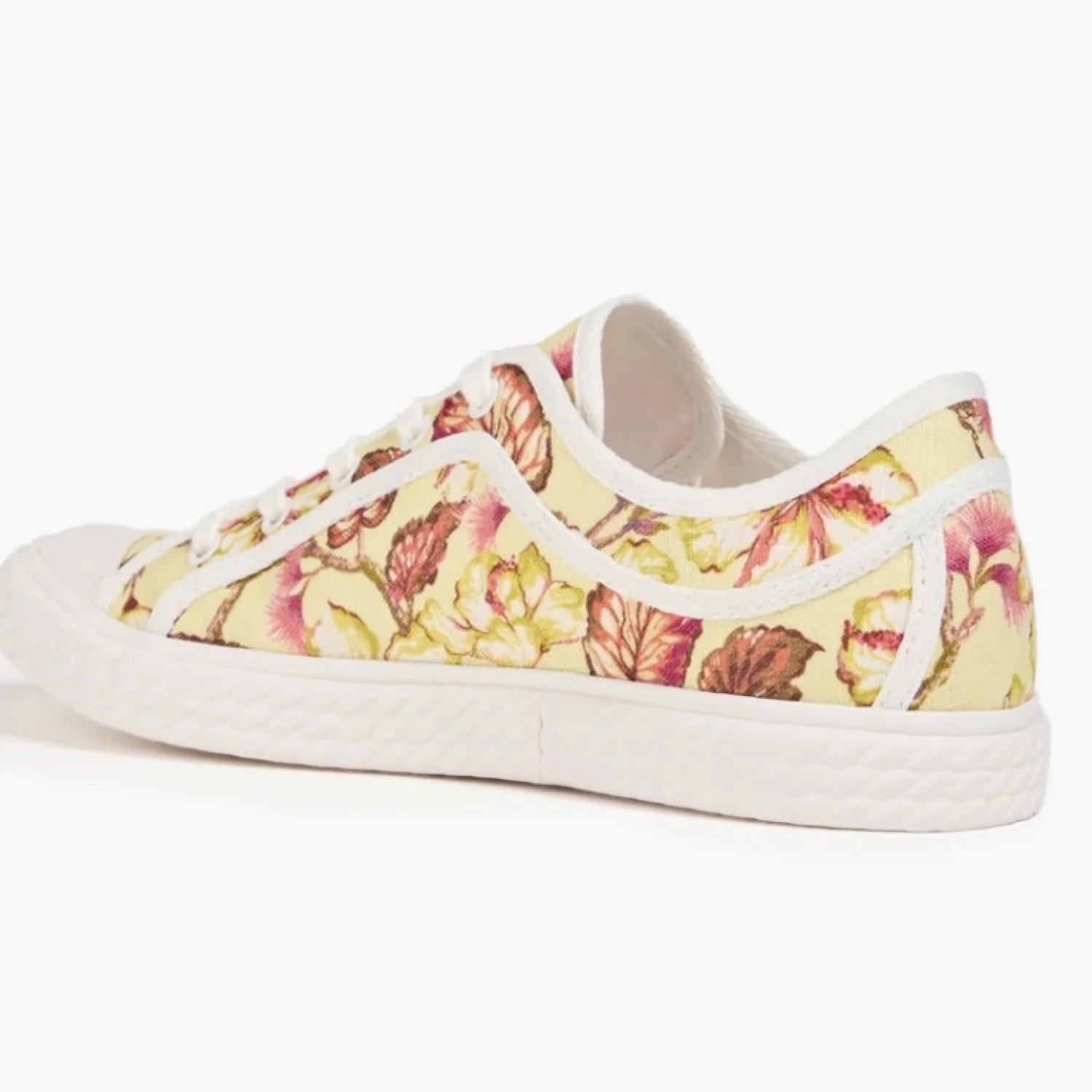 Zimmermann Twist Low Sneakers featuring a vibrant floral print dubbed 'Yellow Hibiscus'. These sneakers have a classic low-top design with a rubber sole and lace-up closure. Perfect for adding a playful touch to any outfit. Comes in original packaging. #Zimmermann #Floral #Sneakers