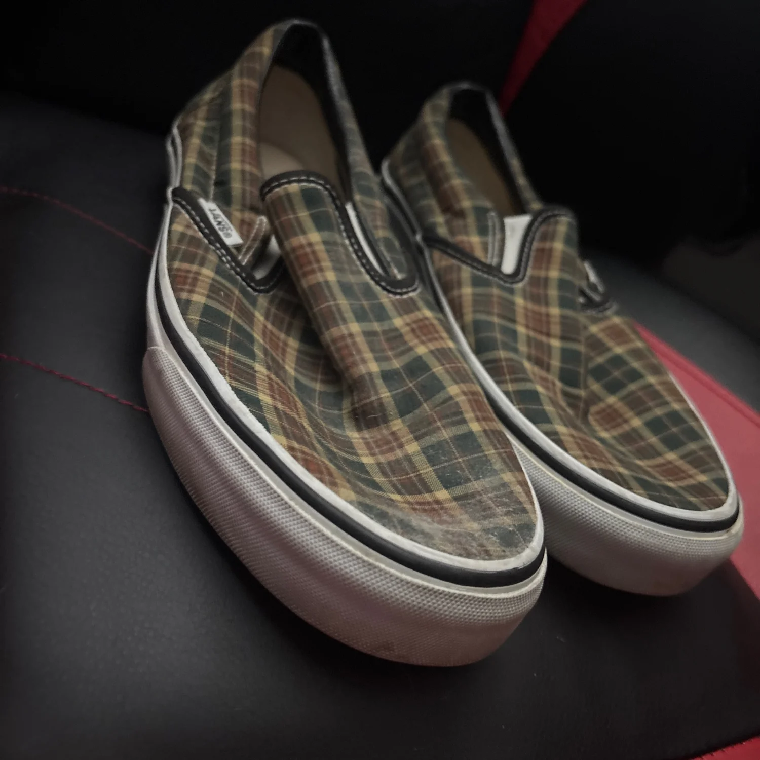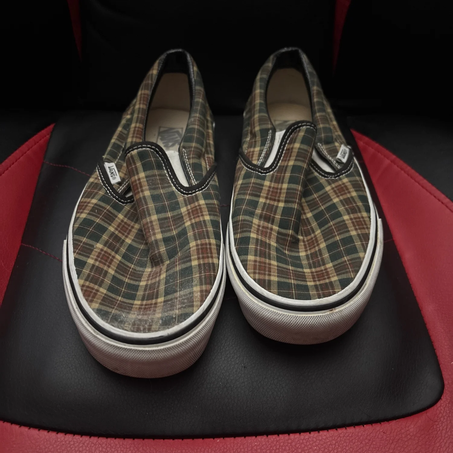 Add some vintage flair to your rotation with these Vans Classic Slip-Ons in a unique plaid pattern. These shoes feature the iconic Vans silhouette, elastic side accents, and padded collars for comfort. • Condition: Lightly used, minor creasing on the toe box (see photos) • Timeless plaid canvas upper • Vans Off The Wall rubber sole for grip and durability • Easy slip-on style, great for casual wear Message me if you’re interested or need more info!