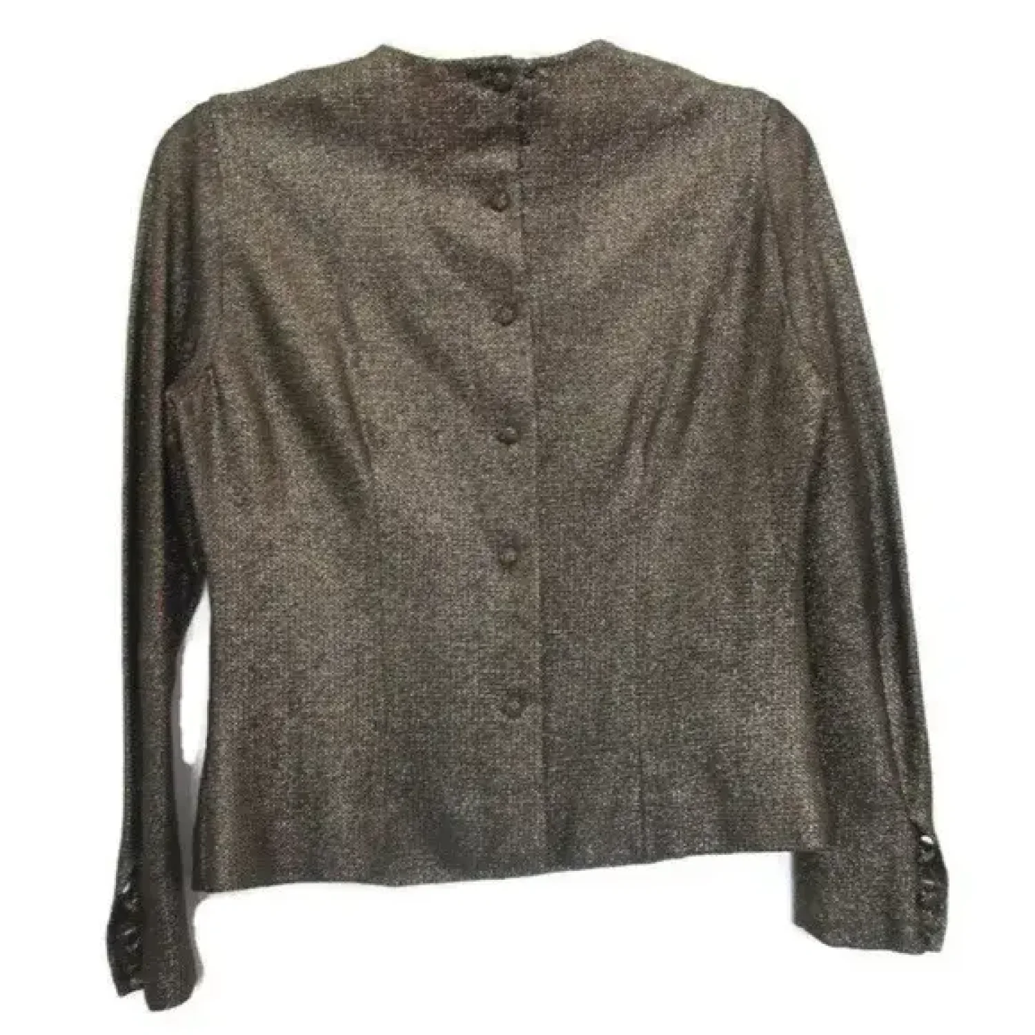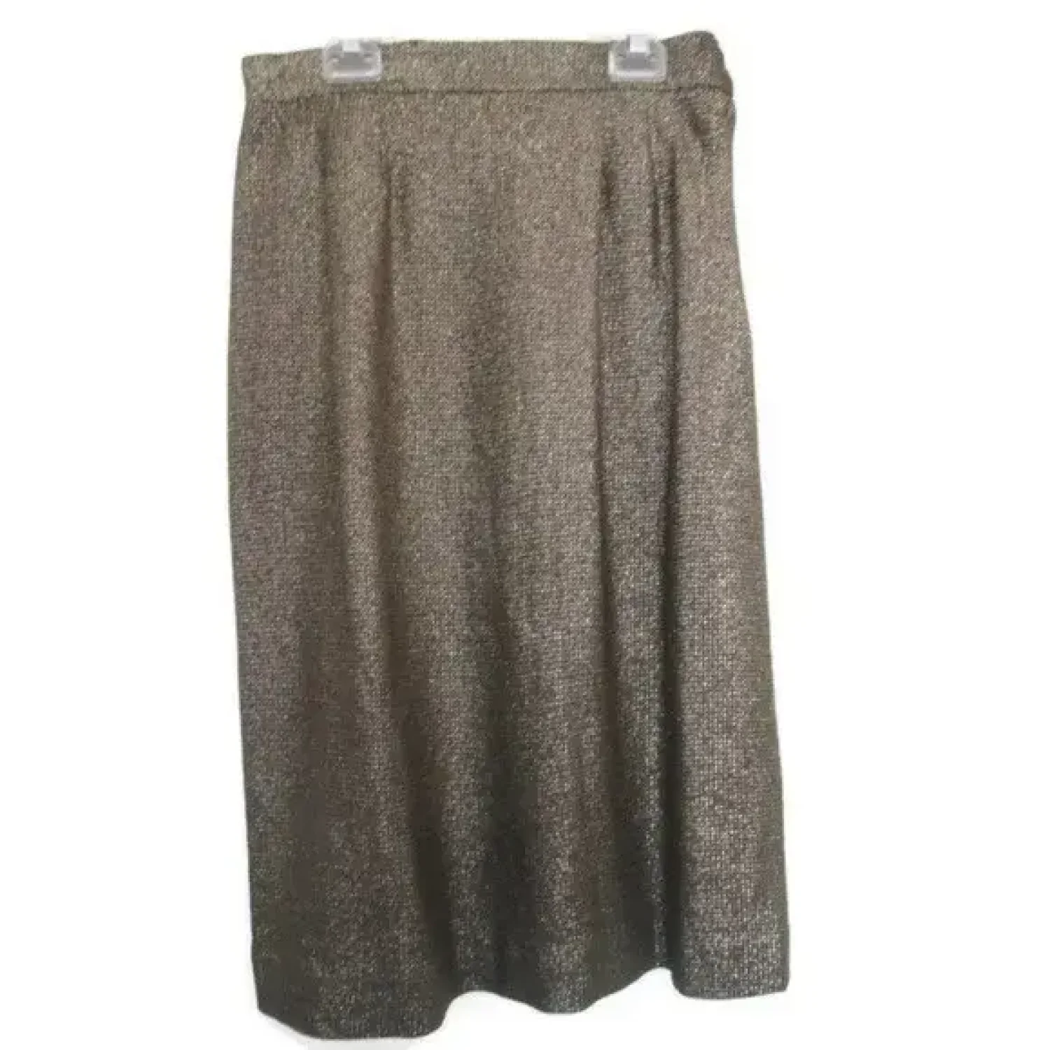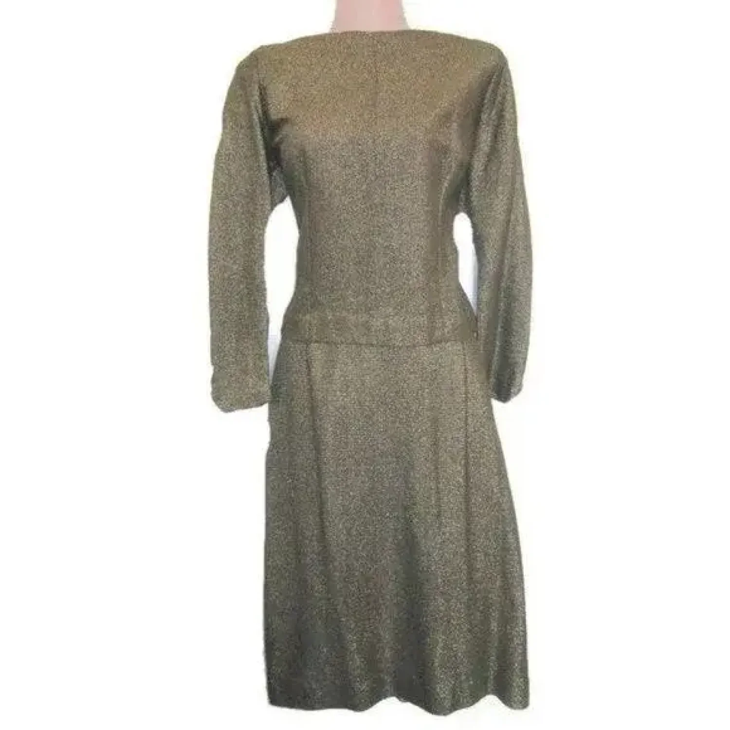 NO HAGGLING ----- blouse length-20,bust-36,waist-32 ------ midi skirt length-27,waist-28,hips-40 ------ 1 small snag on shoulder ---------metallic lurex 1960s 60s mod co-ord set skirt suit co ord coord golden party cocktail dress lined lining pencil below the knee modest high neck 2 piece set