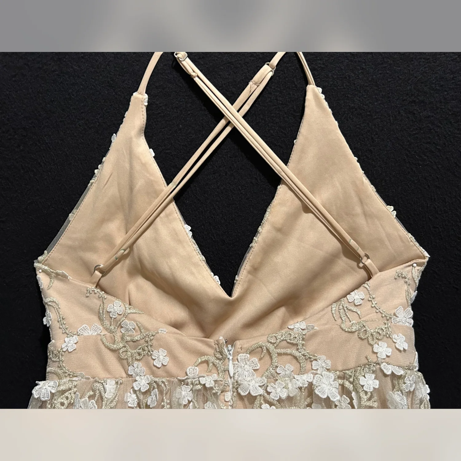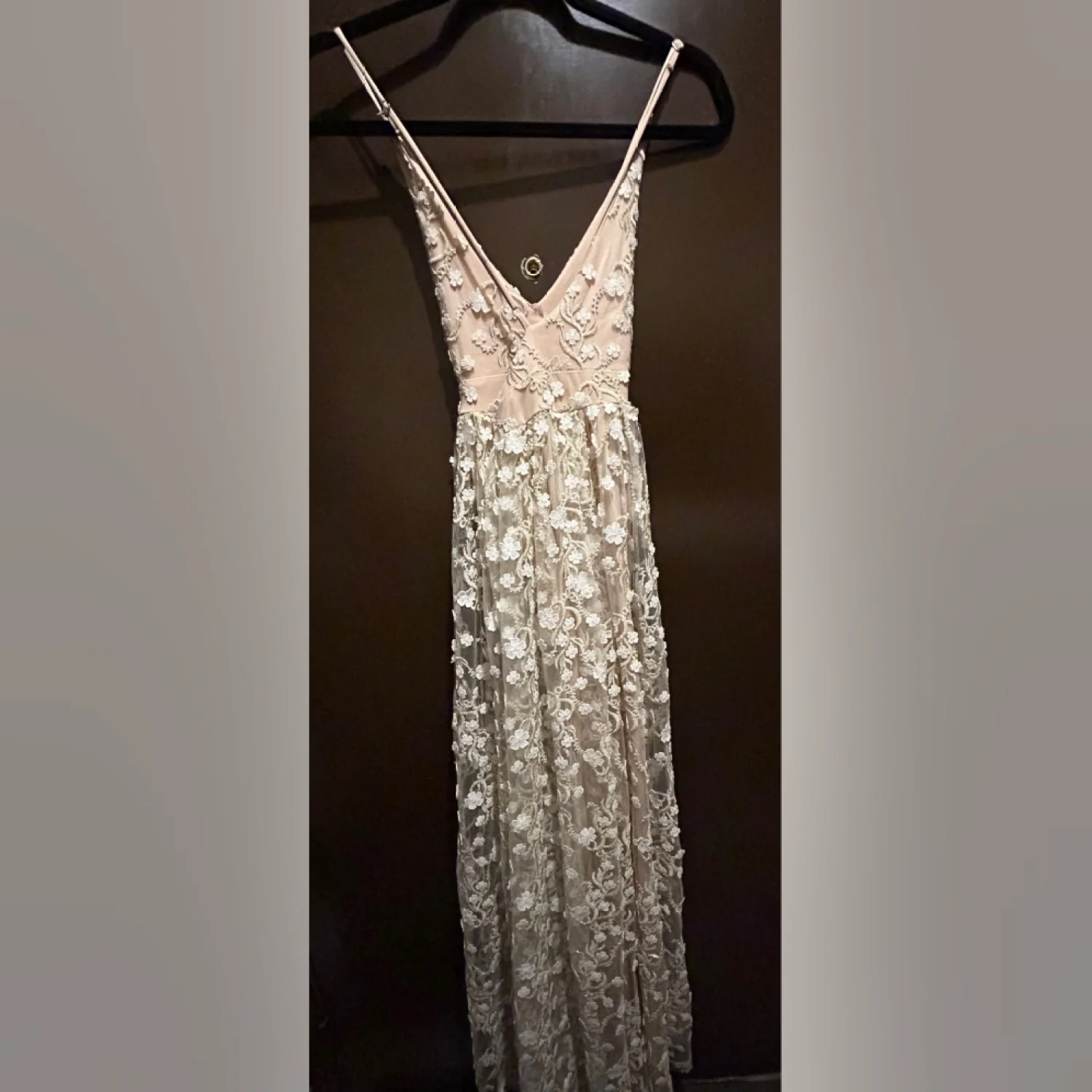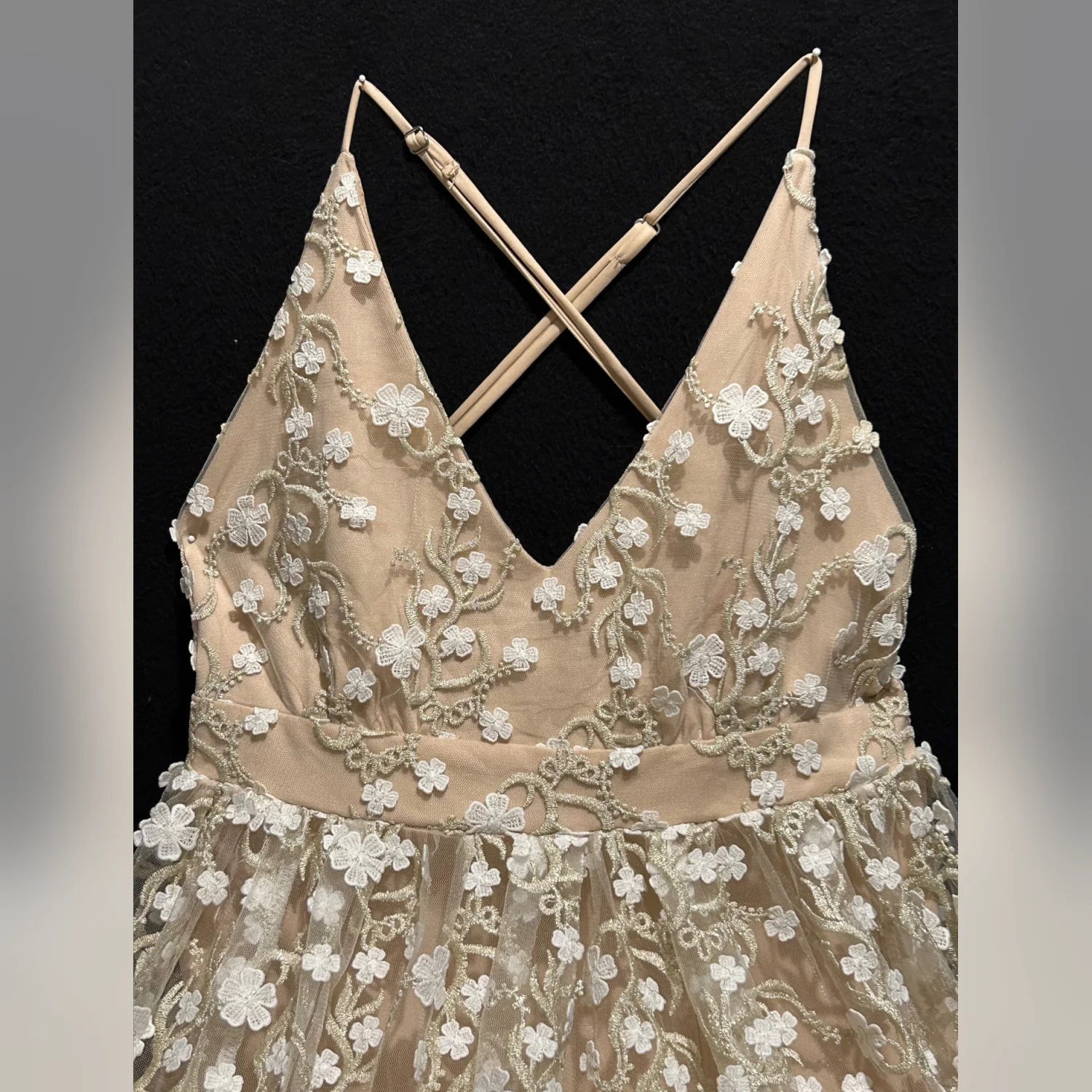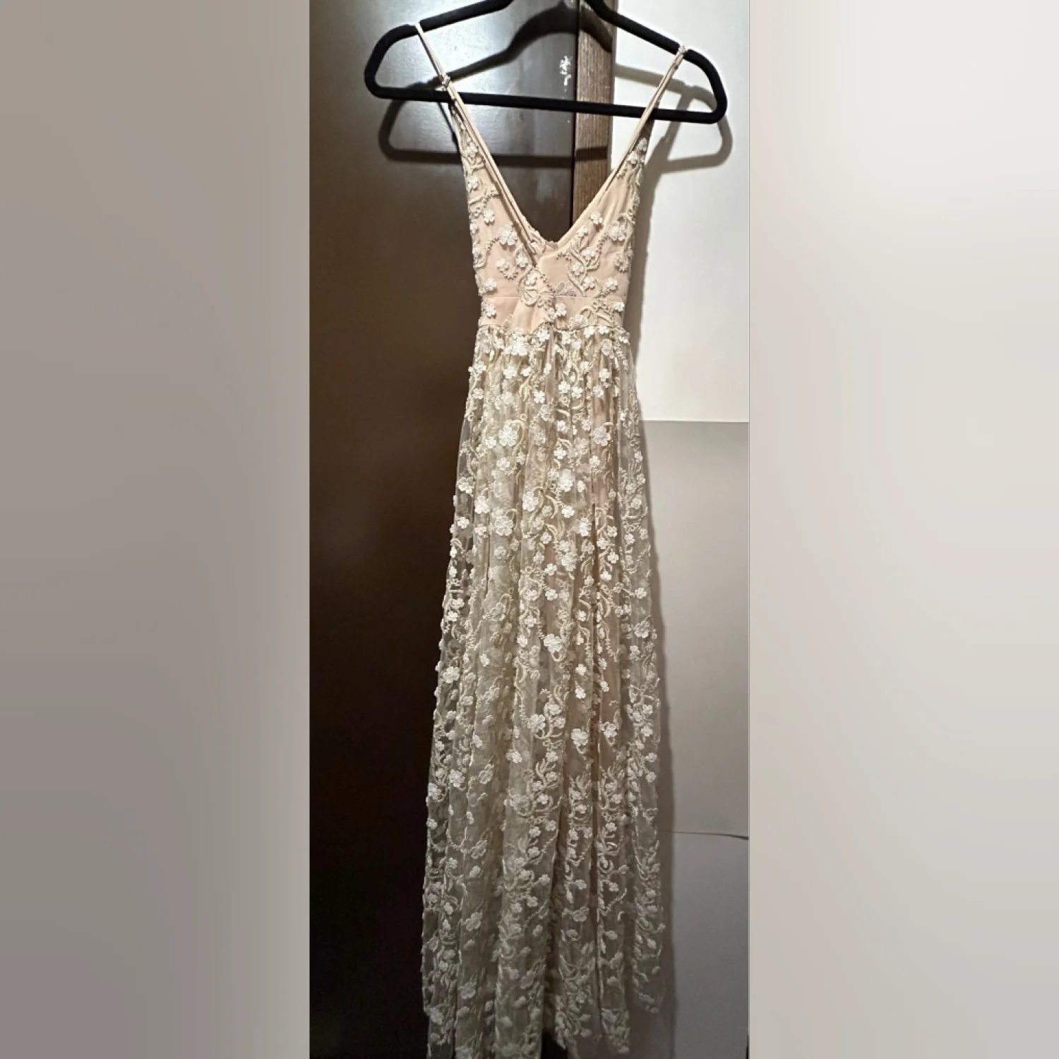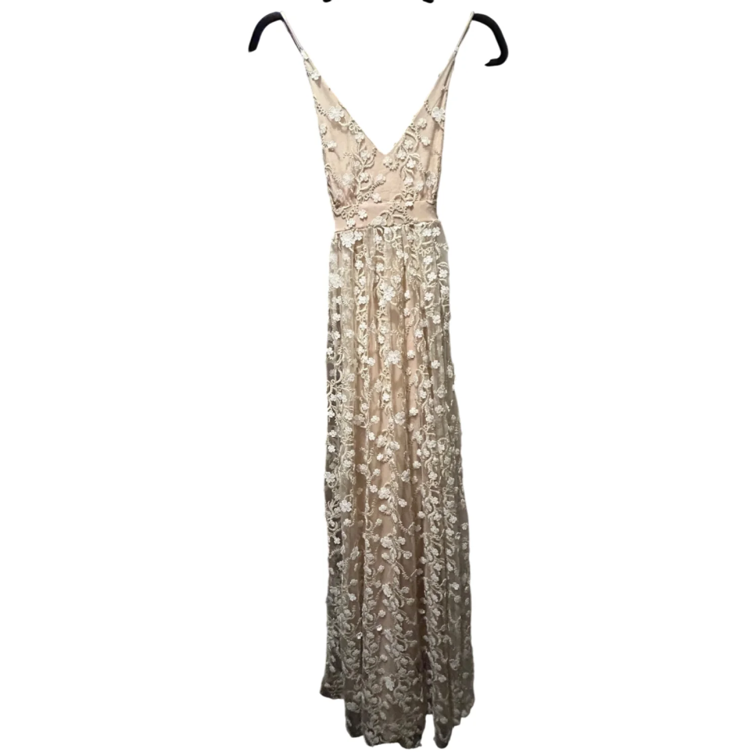 Altar'd State Dress Sz S Tan Cream Formal Floral Lace Overlay V-Neck Long Maxi