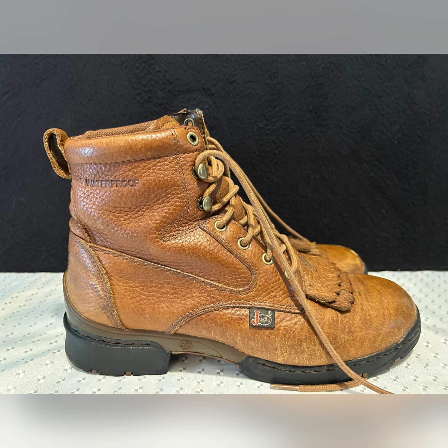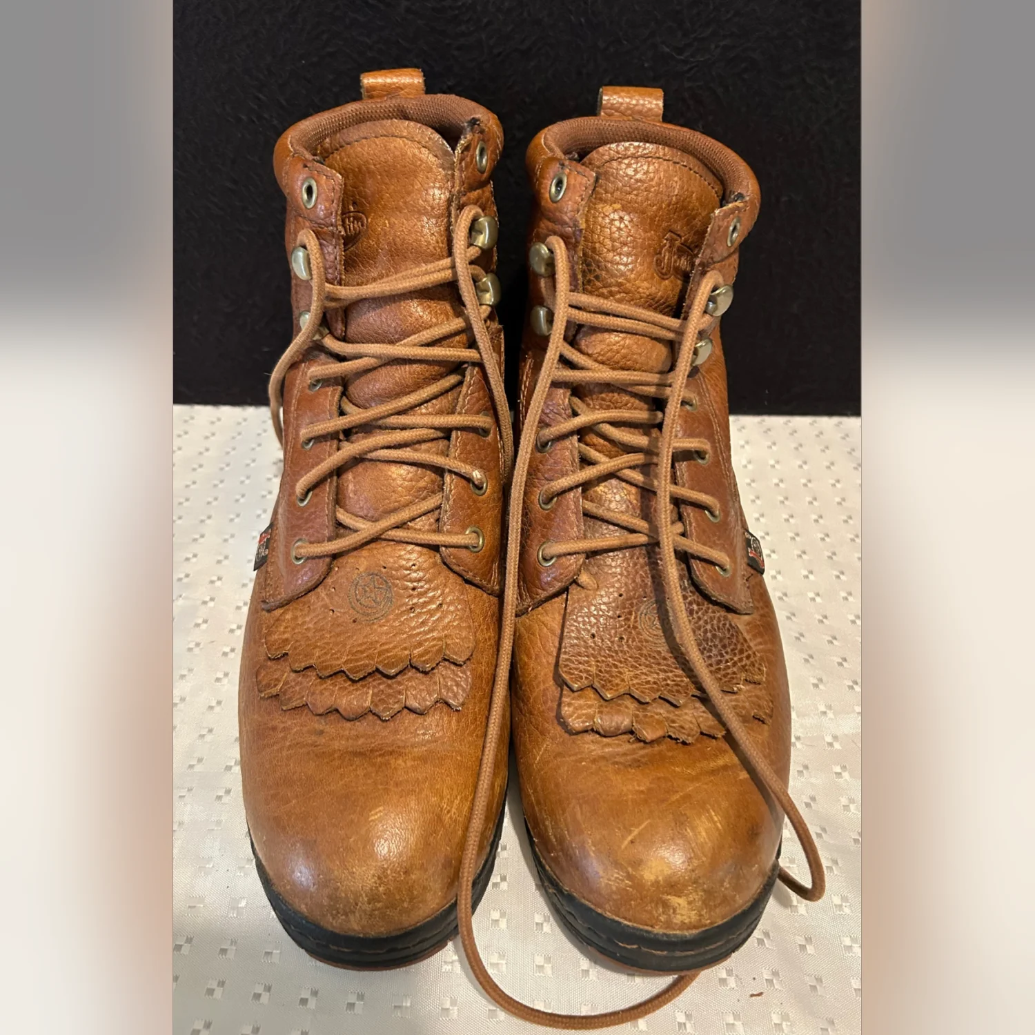 These Justin George Strait women's work boots in size 9 feature a stylish ankle shaft with a round toe and lace-up closure. Made of durable leather, these brown boots are perfect for a business occasion with accents of fringe and a logo. The block heel style and Western theme make them a versatile choice for outdoor and equestrian activities, embodying the cowgirl spirit of the 90s. The outsole and upper material both consist of leather, providing both comfort and durability for long hours on your feet.