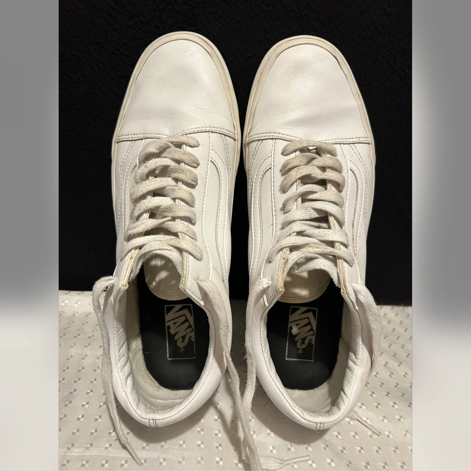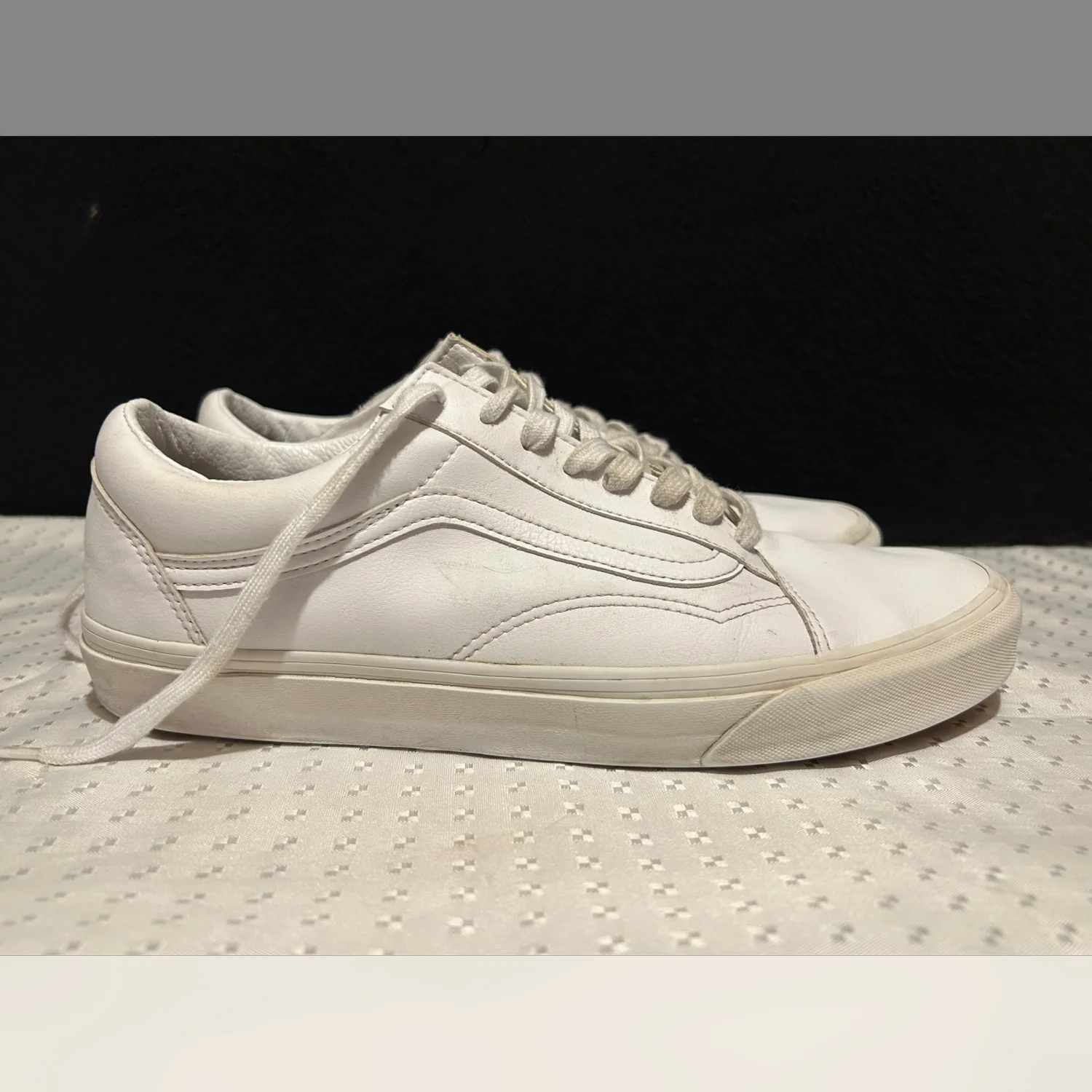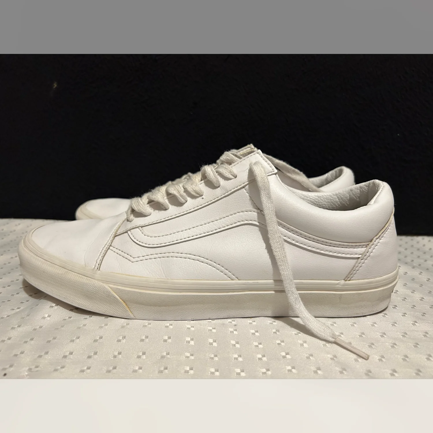 This is a pair of Vans Old Skool low top sneakers in an all-white colorway, featuring leather uppers and the signature Vans side stripe. This model is popular for its classic skate style and versatility.